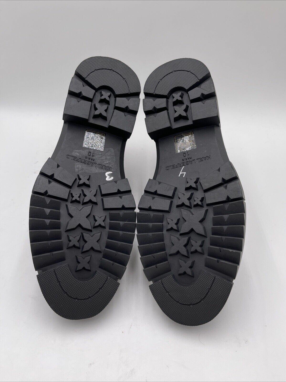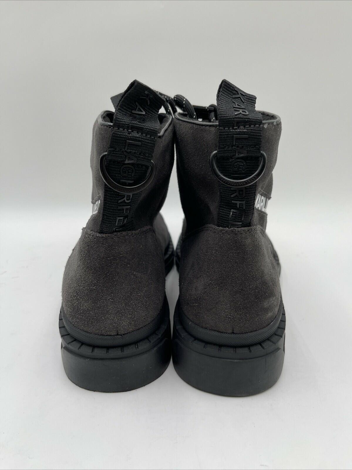 -Bottoms are stained and has sticker residueElevate your style with these Karl Lagerfeld combat boots. Made with high-quality gray suede and lined with soft leather, these boots will keep your feet comfortable all day long. The ankle shaft style and round toe shape provide a classic look, while the lace-up closure ensures a secure fit.
