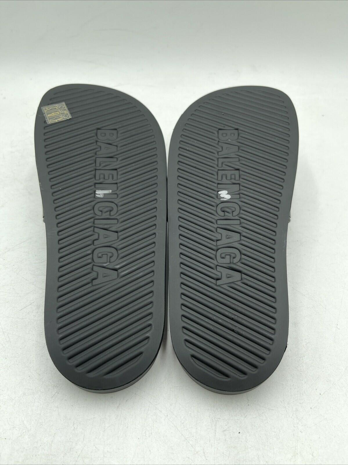 -Sharpie stained bottomsElevate your summer style with these chic Balenciaga Cities Pool slide sandals in black. Perfect for any city outing, these sandals feature a rubber upper material that ensures durability and comfort. The slide style makes them easy to wear and take off, while the 8 US and 38 EU shoe sizes make them a great fit for most women.