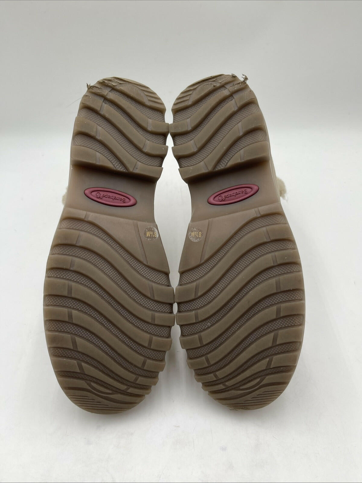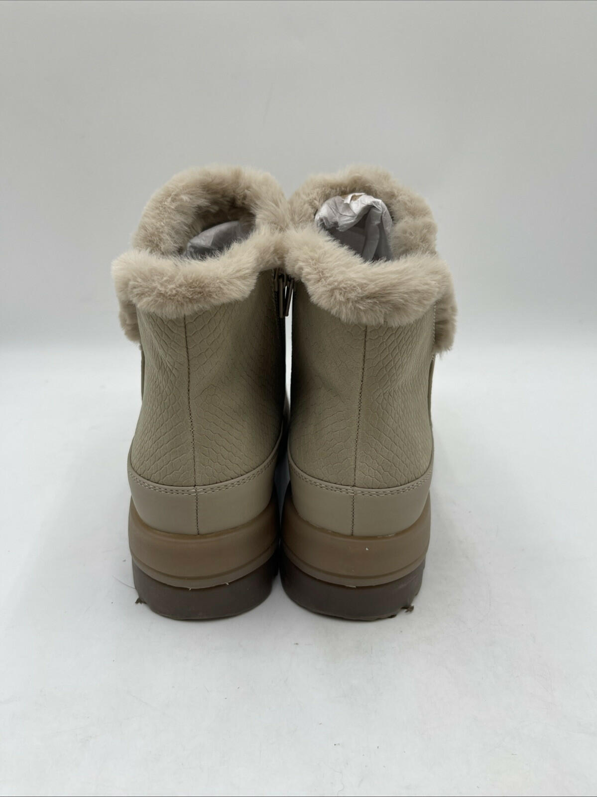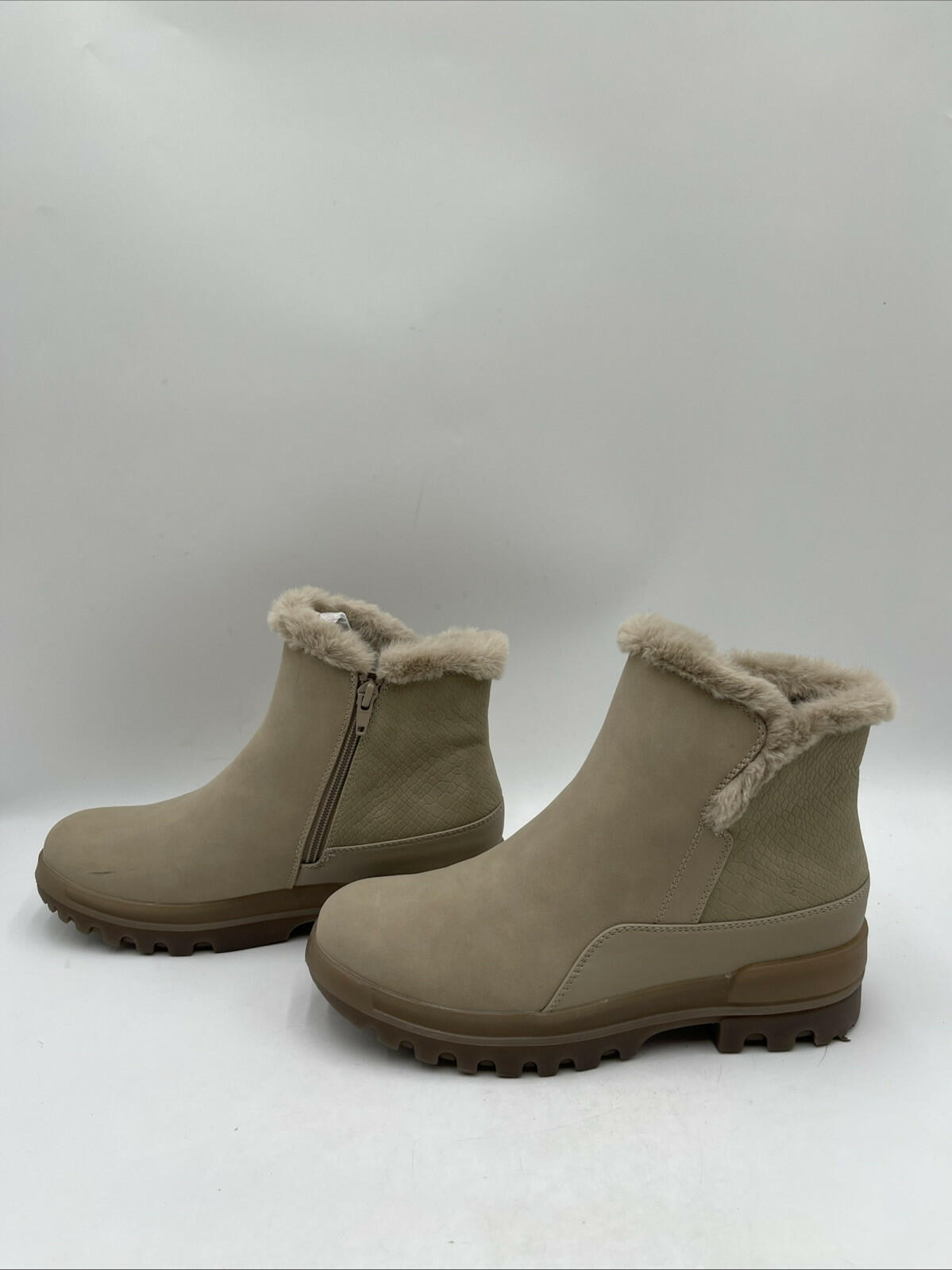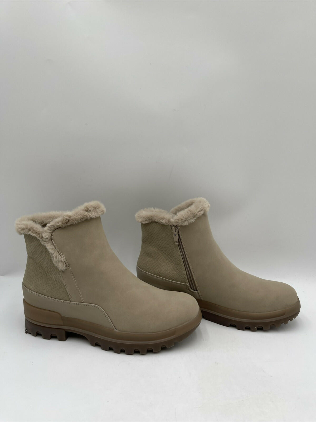-Bottoms are lightly wornThe Baretraps Women's Noemi Boots in size 8.5M are ankle booties in a stylish taupe color. These casual to business-appropriate boots feature a faux fur lining for comfort and a low block heel for easy wear. The leather upper material and Baretraps brand ensure durability and quality, making them suitable for outdoor activities. The Noemi boots offer a blend of style and comfort, making them a versatile choice for everyday wear.