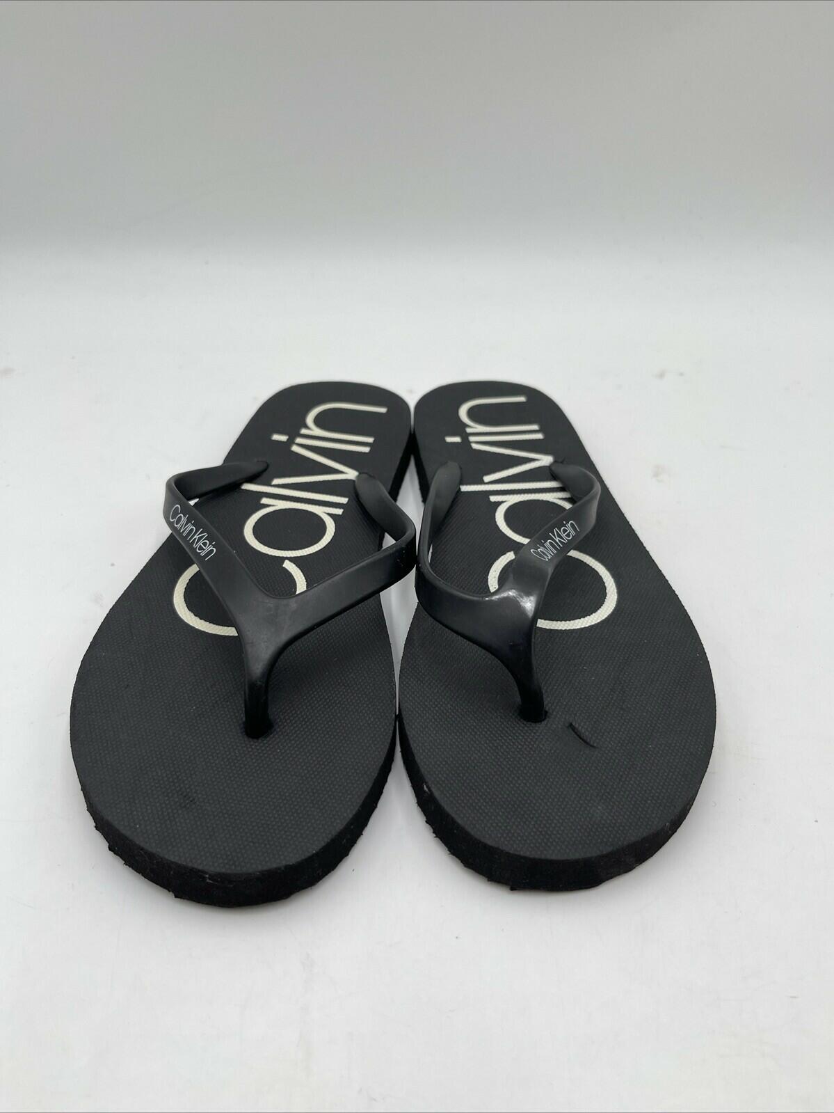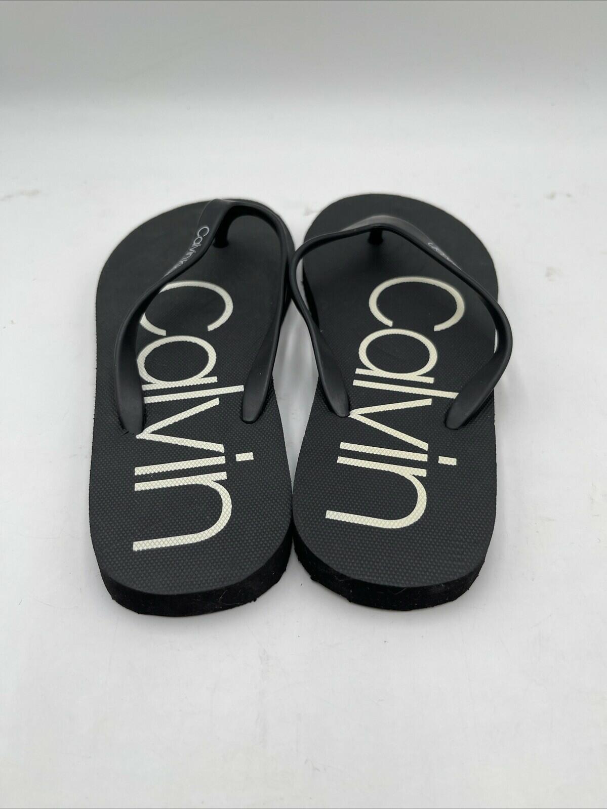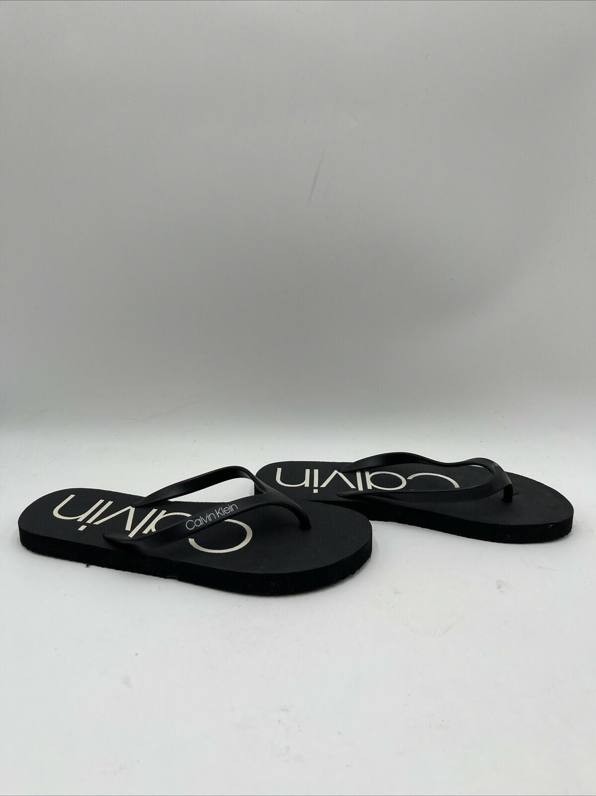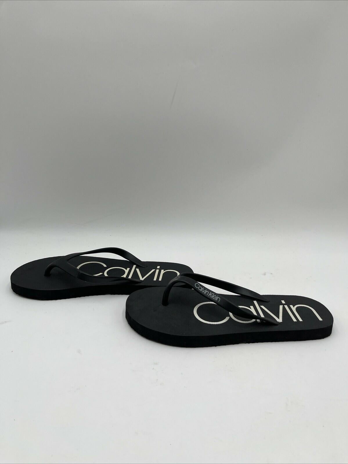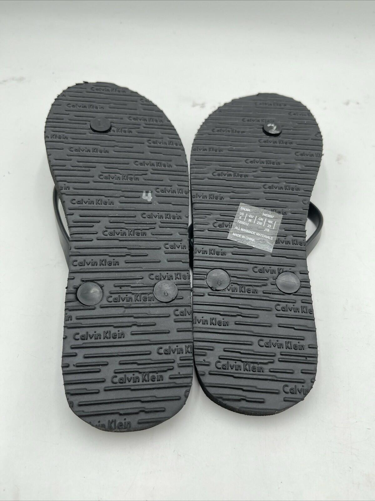 -Bottoms are stainedElevate your summer footwear game with these stylish Calvin Klein Salma thong sandals in classic black. These slip-on sandals feature a flat heel and synthetic upper material, making them both lightweight and comfortable. The sandals are accented with the iconic Calvin Klein logo and are perfect for any casual occasion.