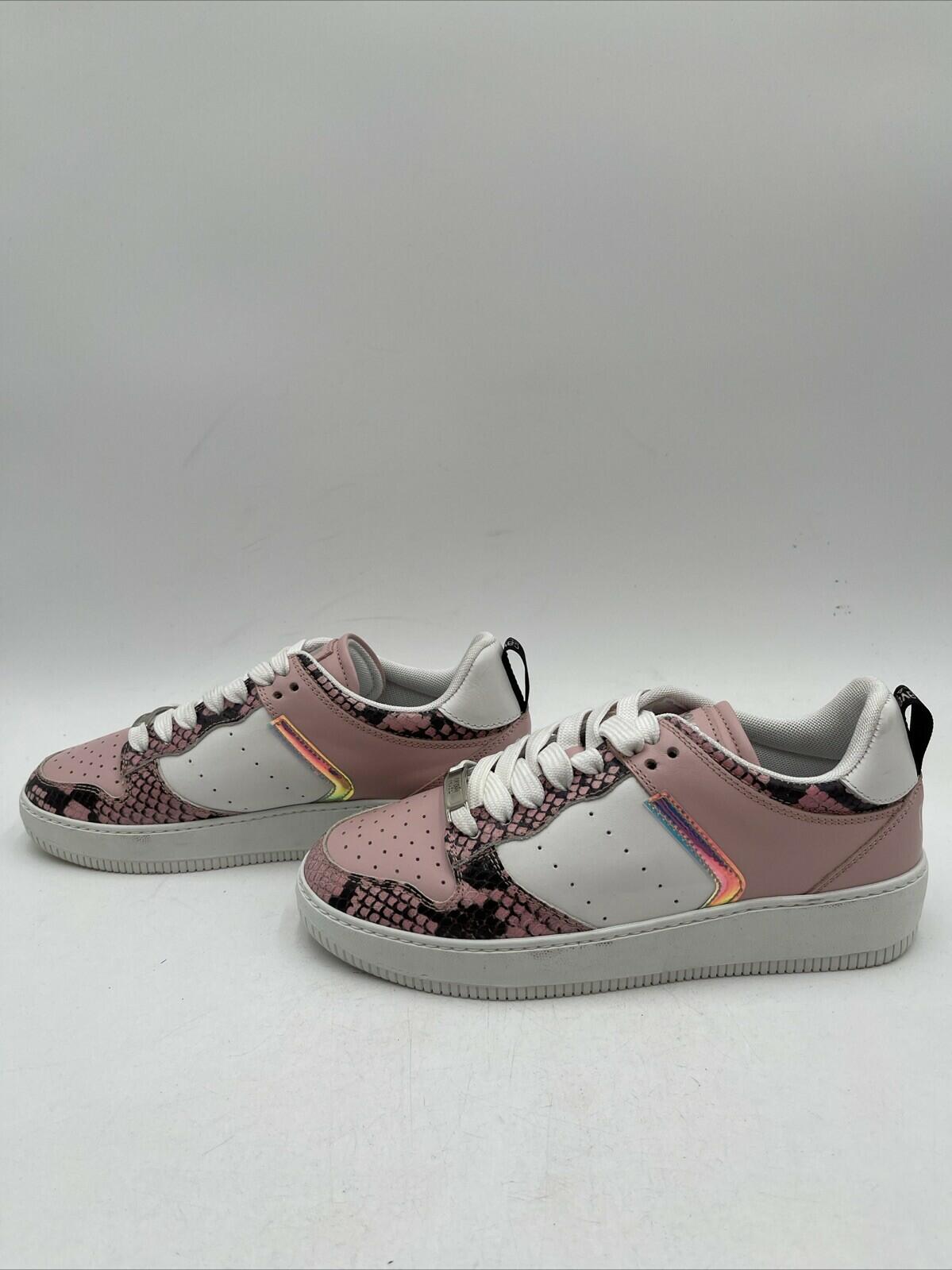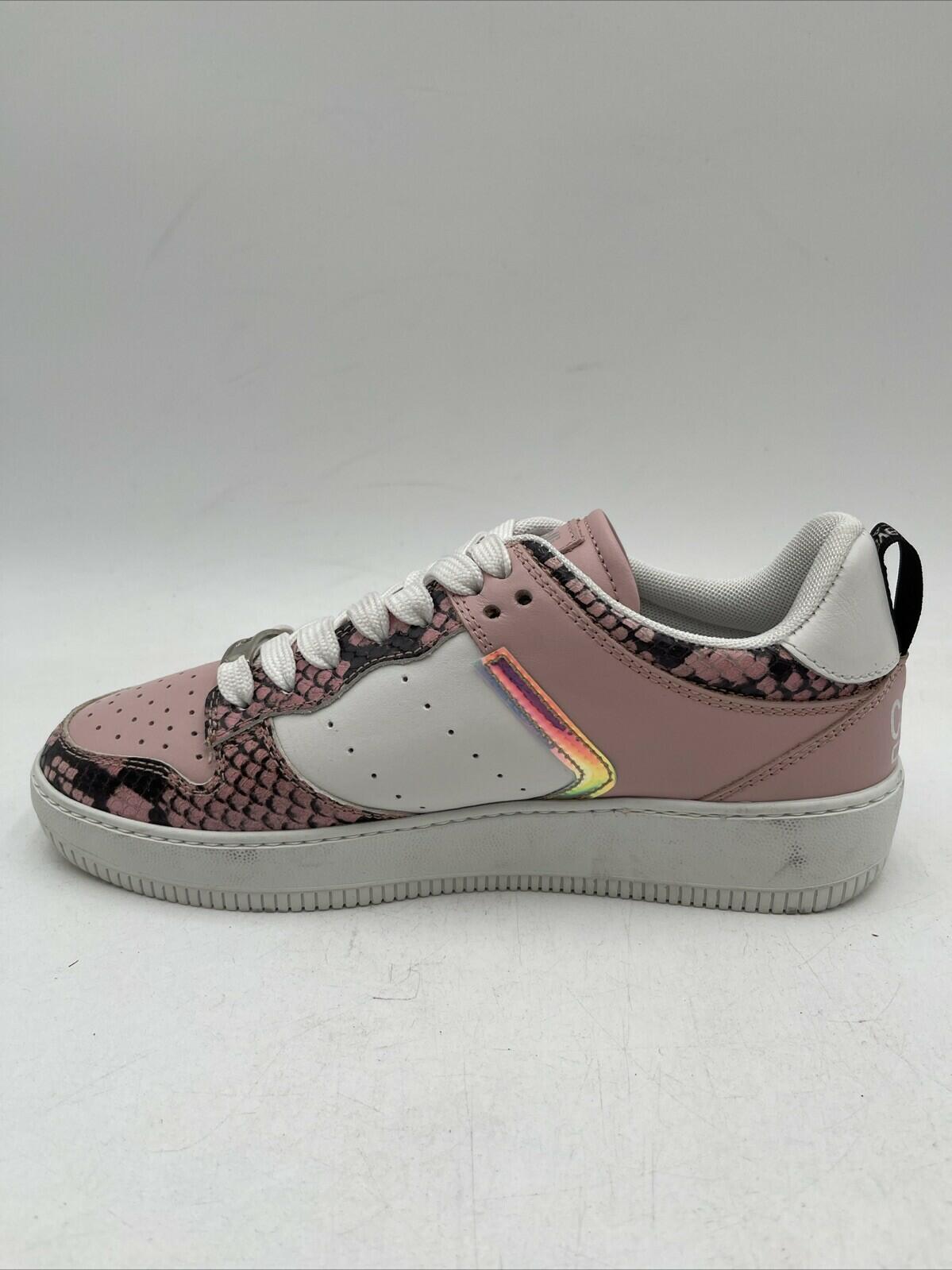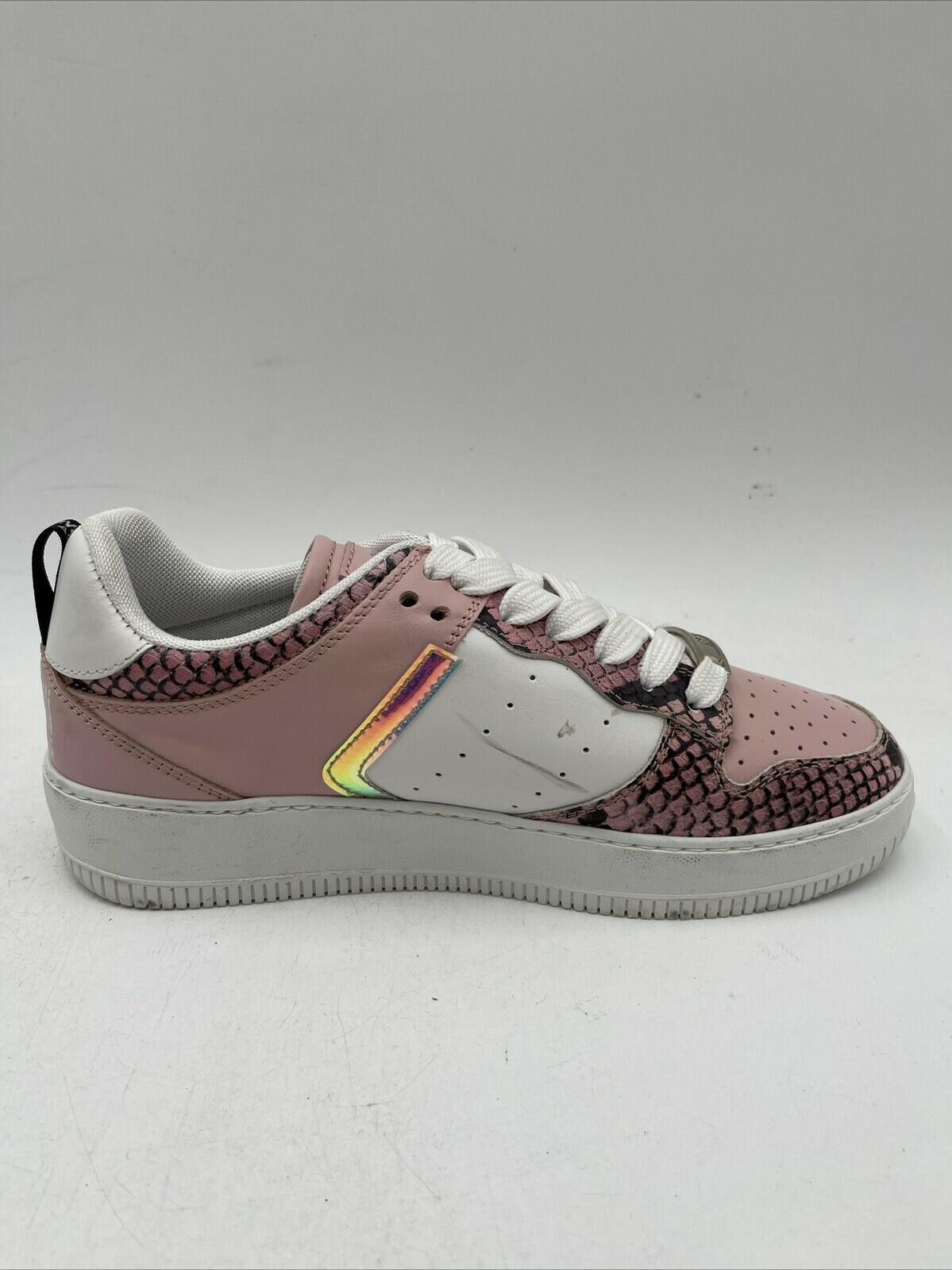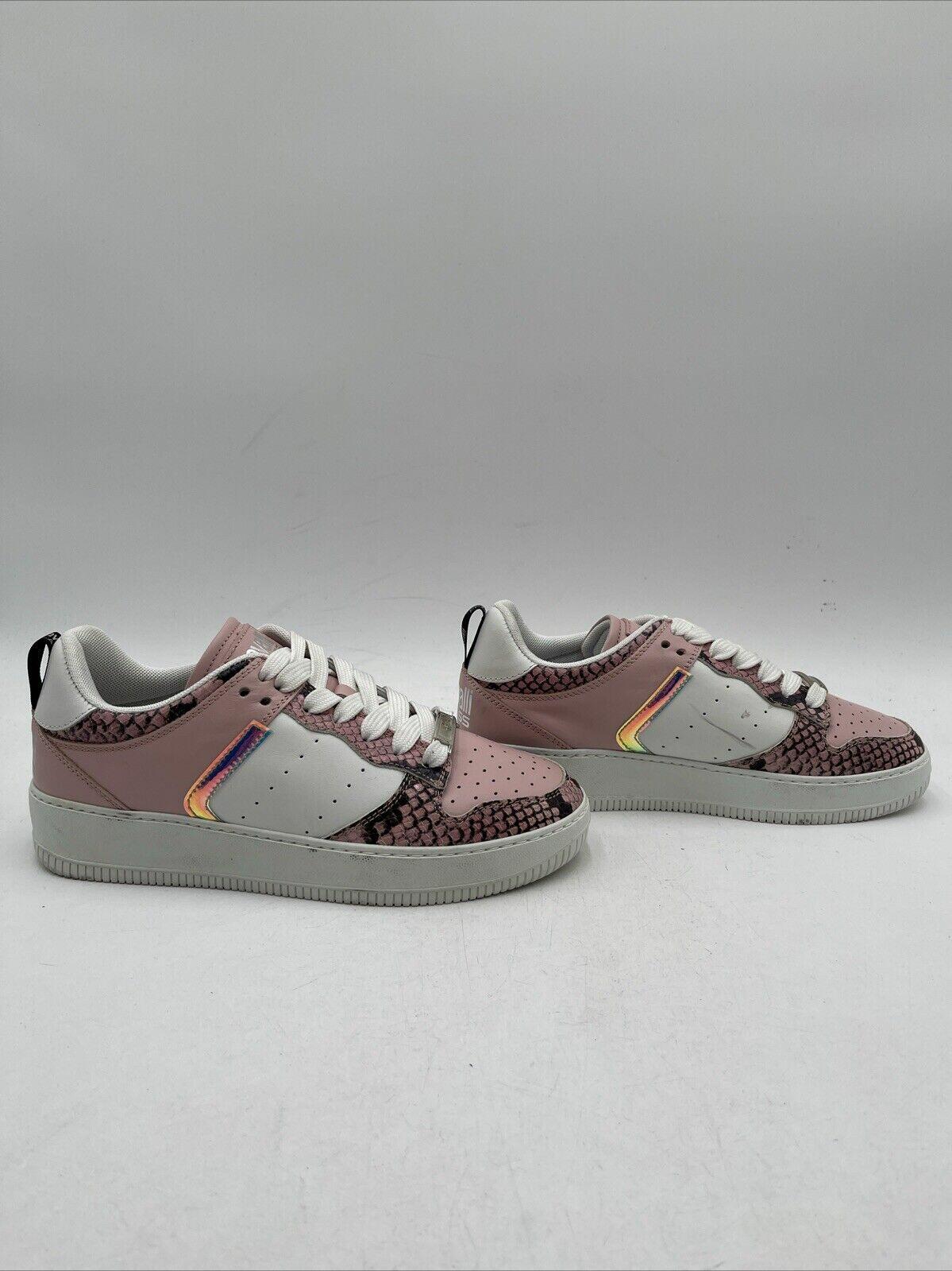 Elevate your casual style with these pink and white lace-up sneakers from Cavalli Class by Roberto Cavalli. The leather and snake skin upper material, with animal print pattern and embossed trim, adds a touch of luxury to your footwear collection. The sneakers are designed for women, in US and EU size 38, with a low heel height for comfort. The fabric lining provides extra comfort for all-day wear. These sneakers are perfect for casual outings and can be paired with any outfit.
