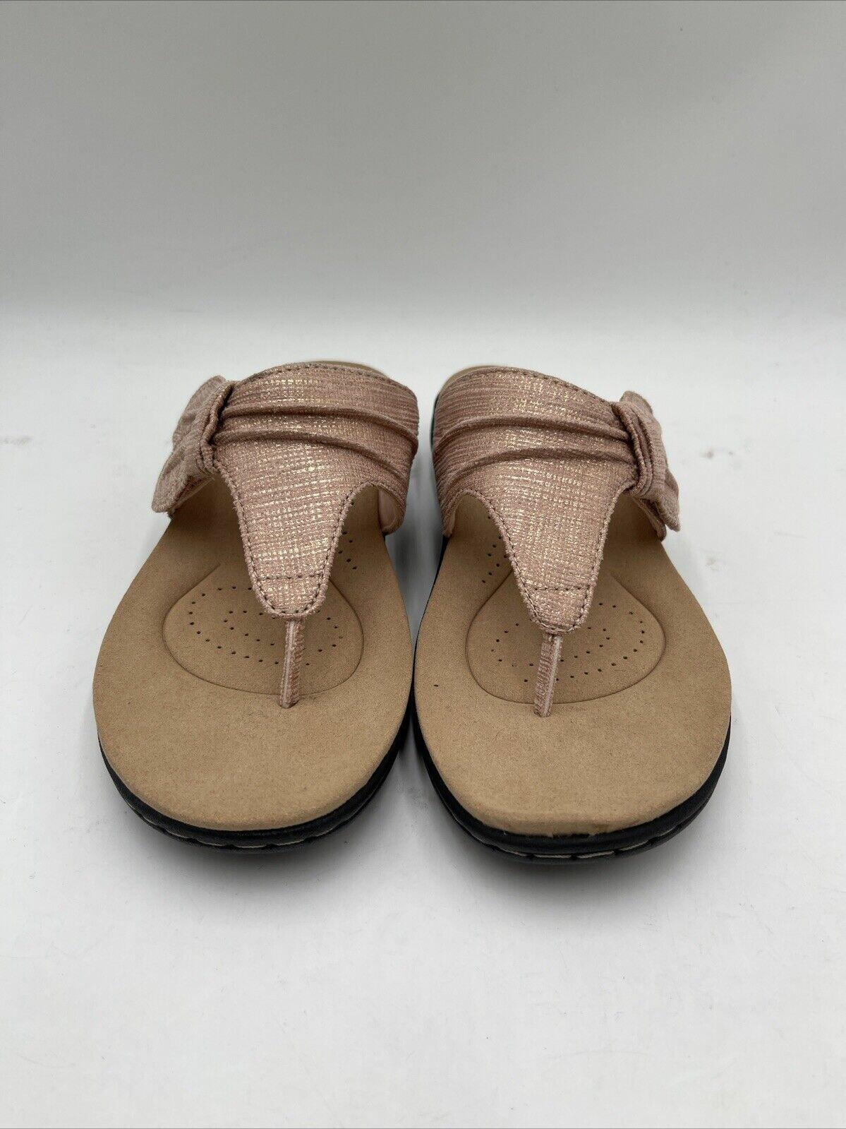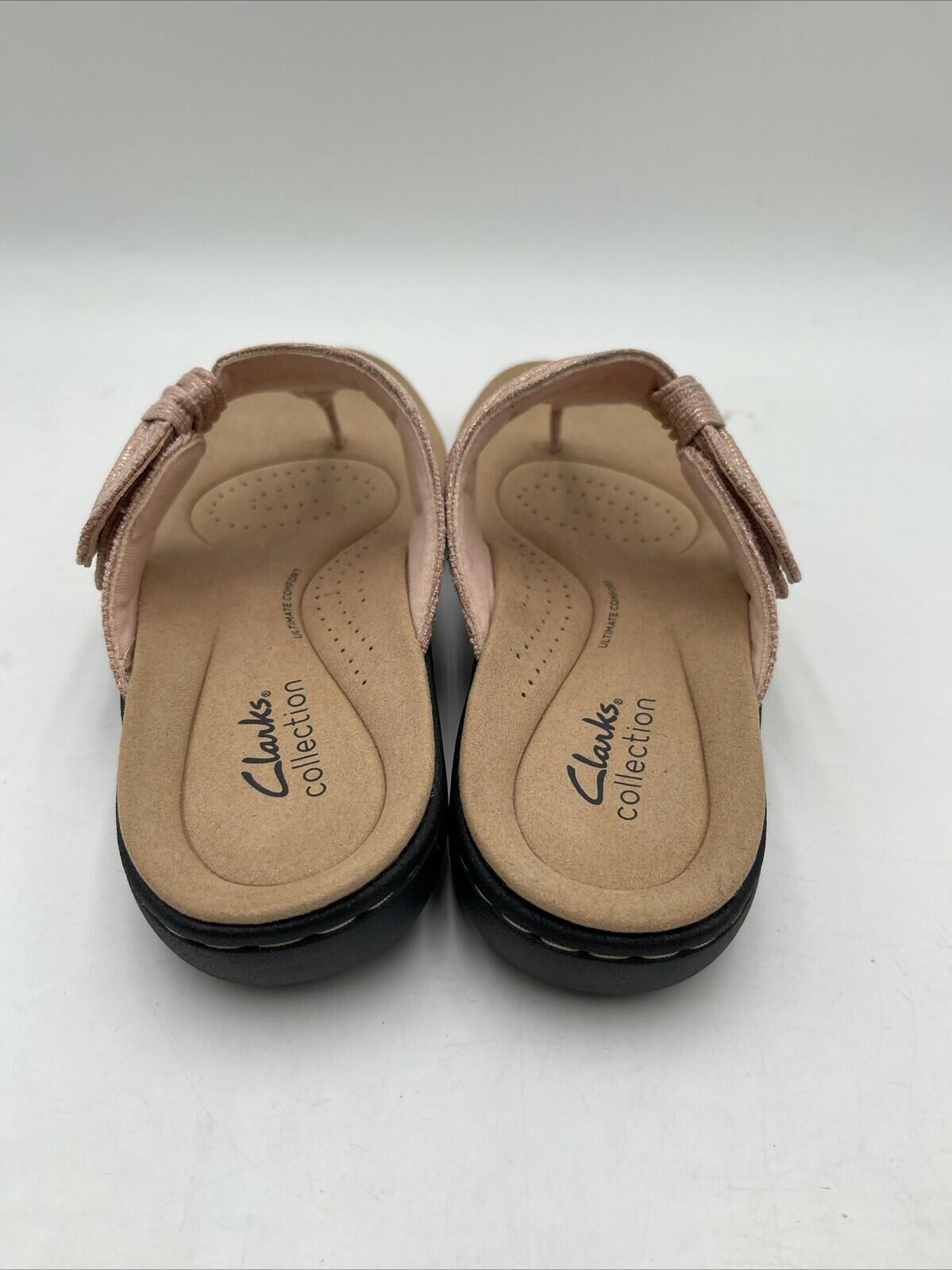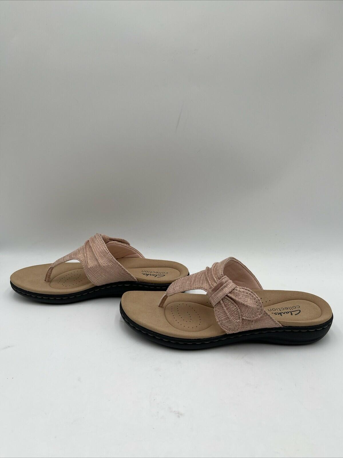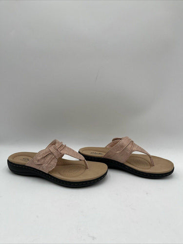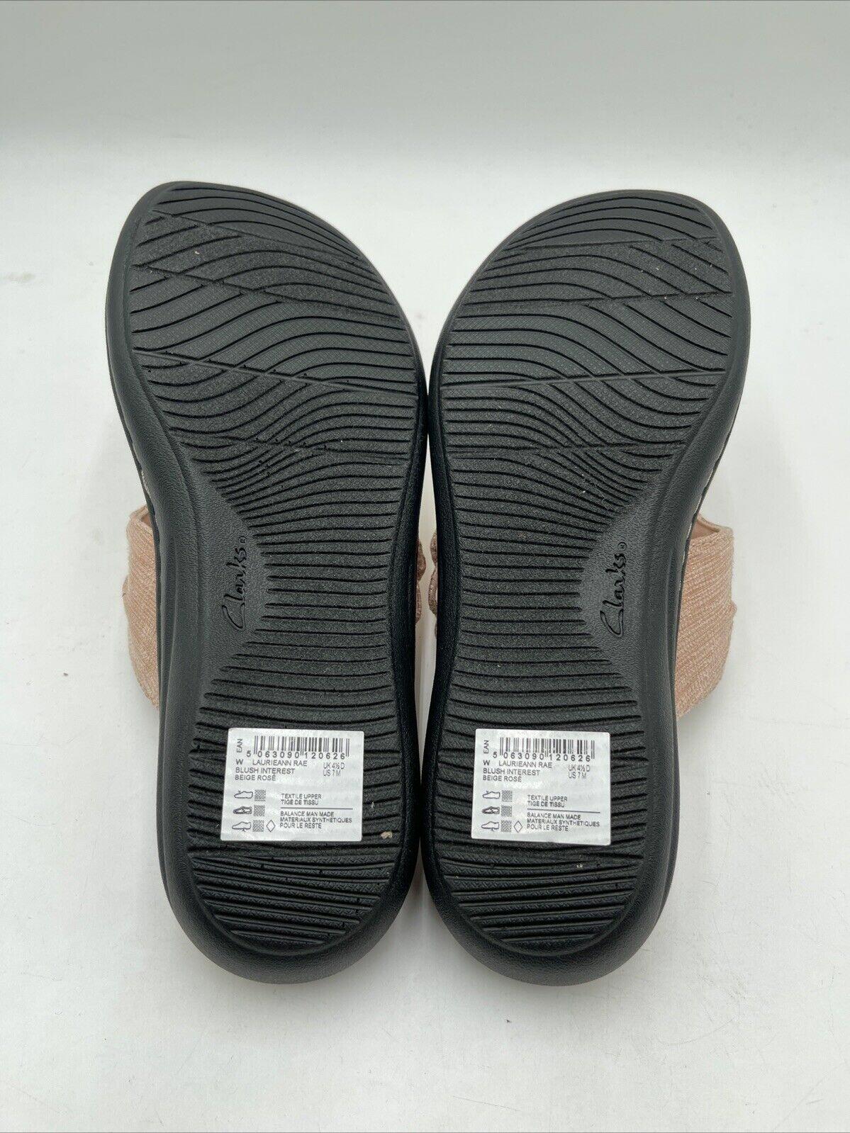 -Bottoms are barely wornElevate your summer footwear collection with these stylish Clarks Laurieann Rae sandals in a beautiful shade of pink. These thong-style sandals feature a low wedge heel, slip-on closure, and a synthetic upper material that ensures durability and comfort. The sandals are perfect for any casual occasion and can be paired with jeans, shorts, or dresses.