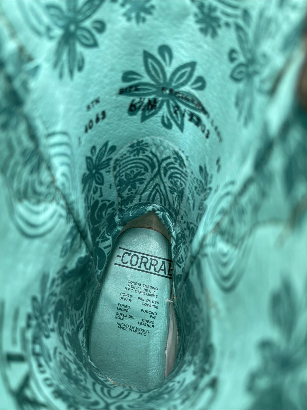 The Corral Distressed Filigree Embroidery Leather Square Toe Western Boots in size 6.5M are casual mid-calf boots designed for women. Featuring a square toe shape and a low block heel, these brown leather boots are adorned with intricate embroidered accents for a western cowgirl theme. The pull-on style boots have a glow-in-the-dark feature, adding a unique touch to the design. Made in Mexico by Corral Boots, they are crafted with leather outsoles and linings for durability and comfort.