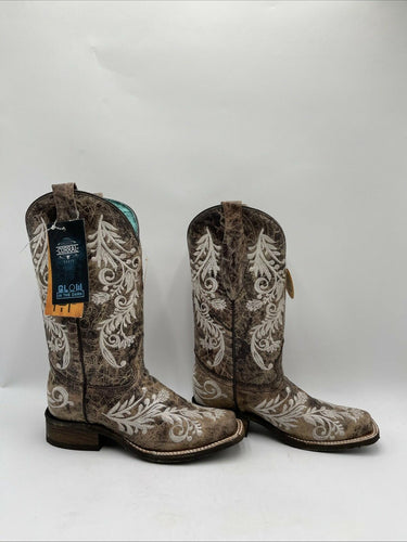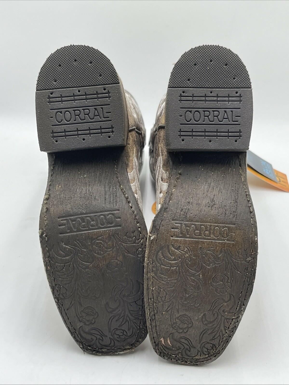 -bottoms barley wornThese Corral Boots are the perfect addition to any cowgirl's wardrobe. The distressed filigree embroidery leather design is exquisite and the square toe style is modern and trendy. The boots have a low block heel with a comfortable cushioned insole, making them perfect for all-day wear.
