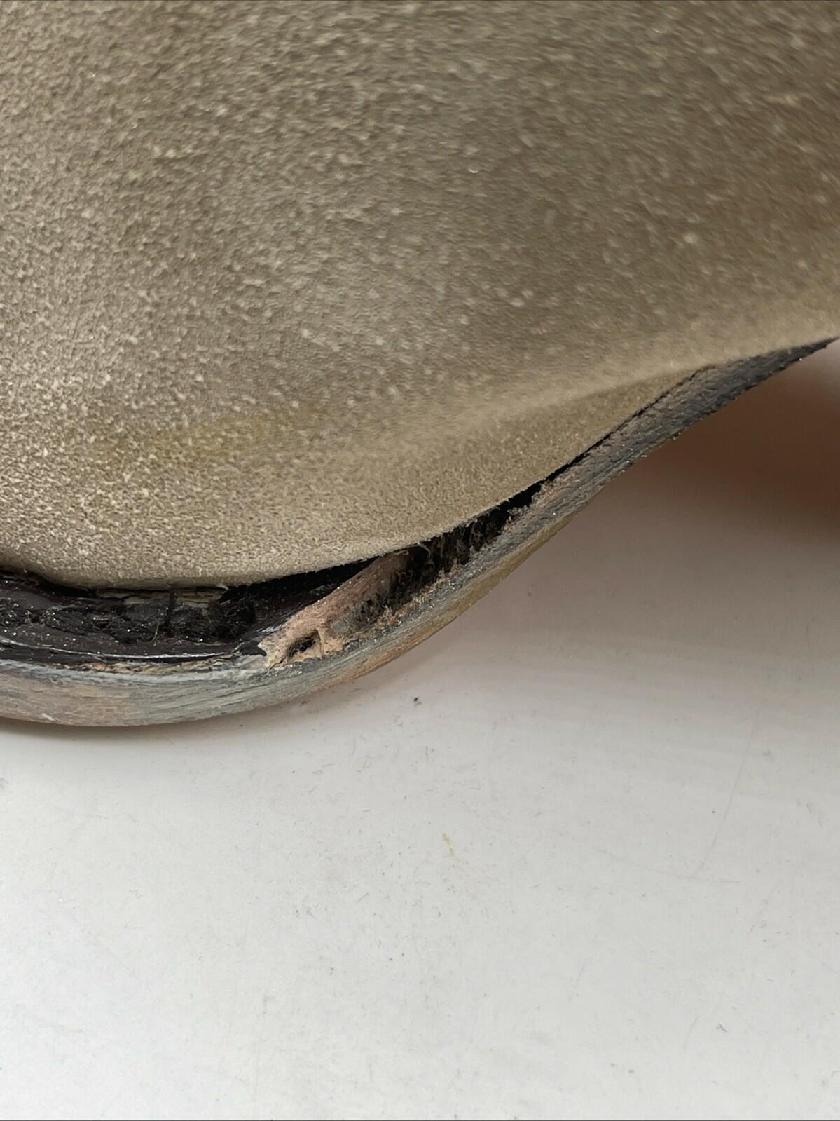 -Chipped midsole on left boot