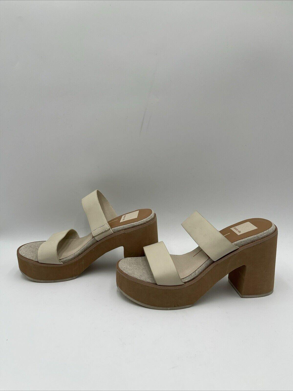 Elevate your summer style with these Dolce Vita Meilo sandals in a beautiful beige color. These slip-on sandals feature an ultra-high block heel measuring over 4 inches, adding a touch of glamour to any outfit. The leather upper material is accented with the Dolce Vita logo, and the slip slide style makes them easy to wear and remove.