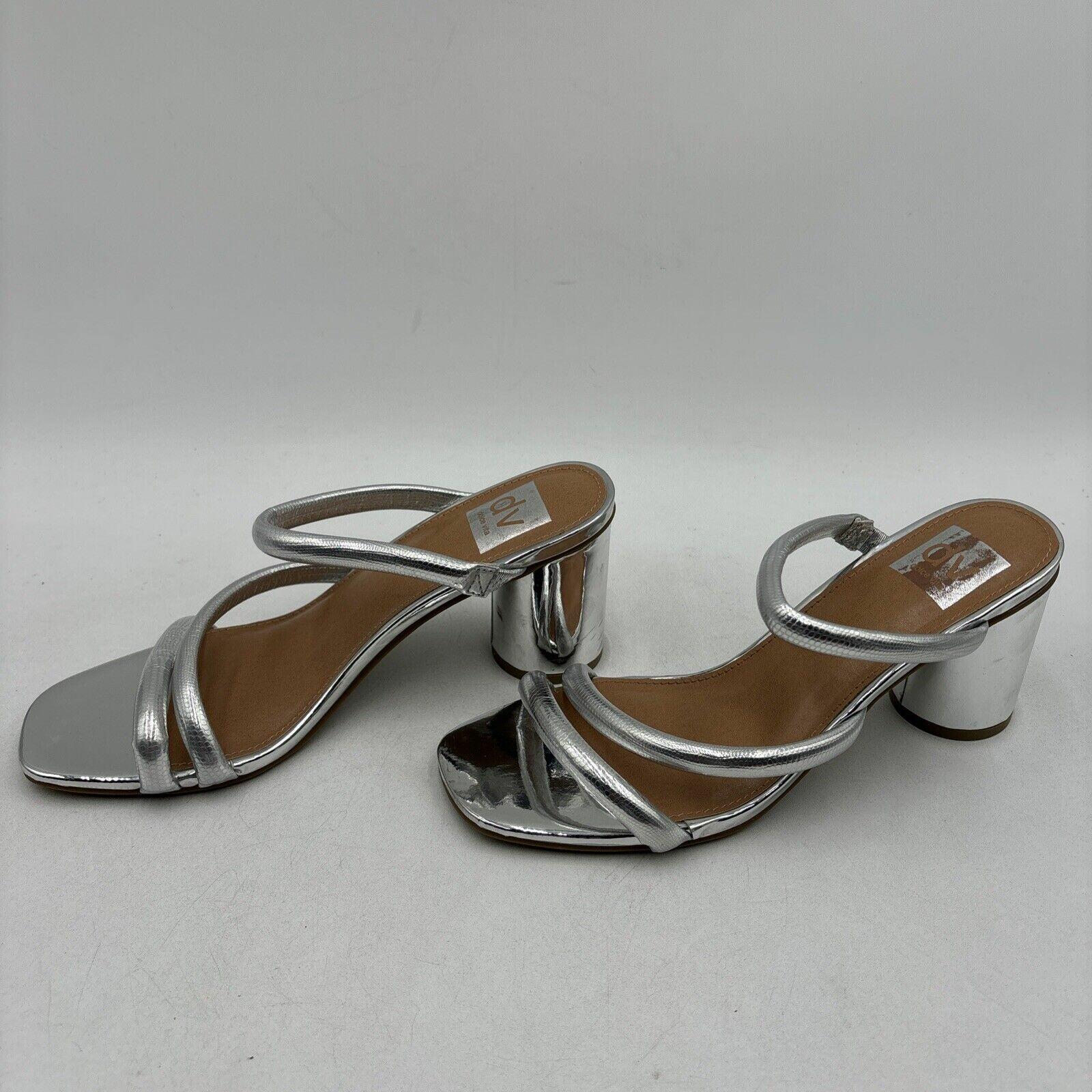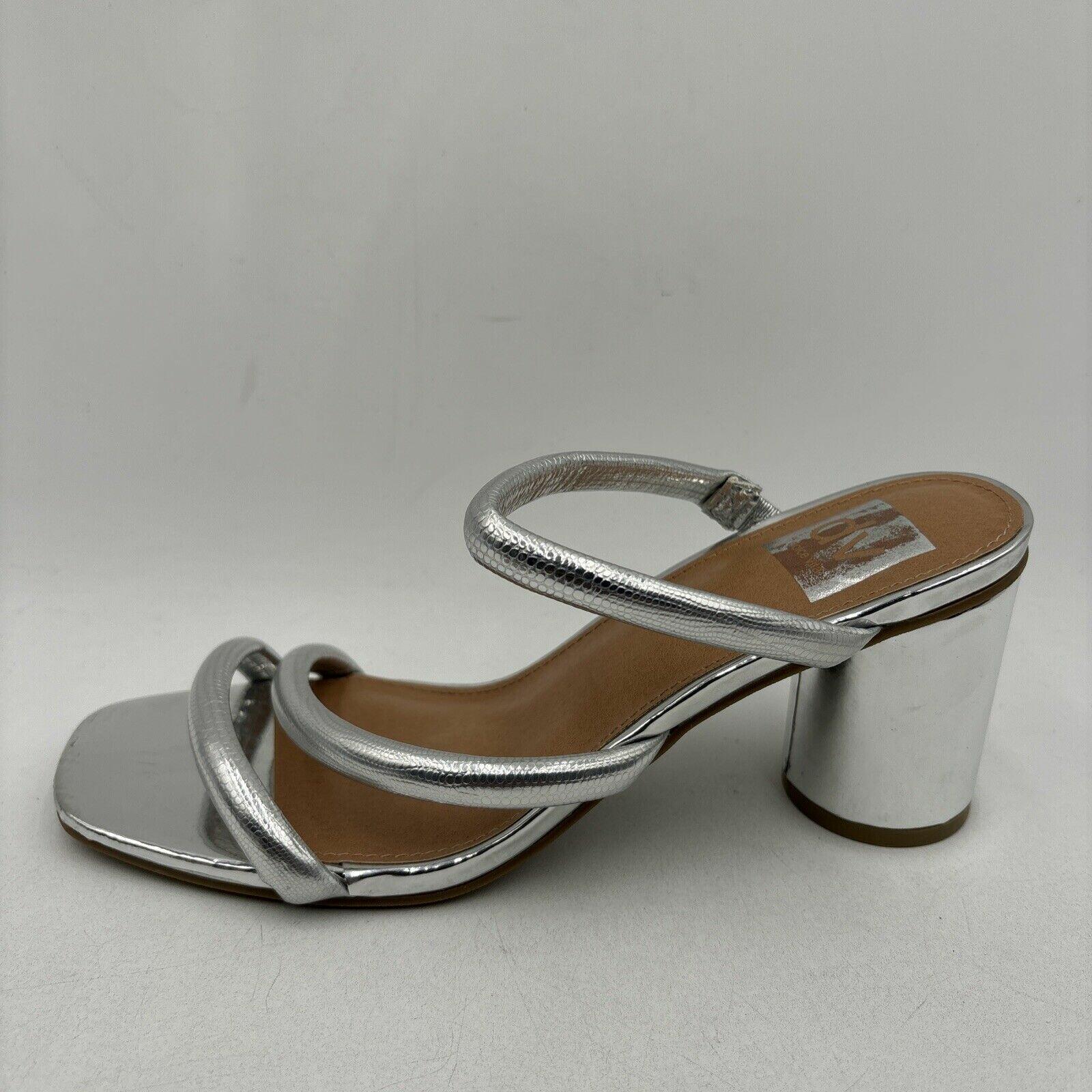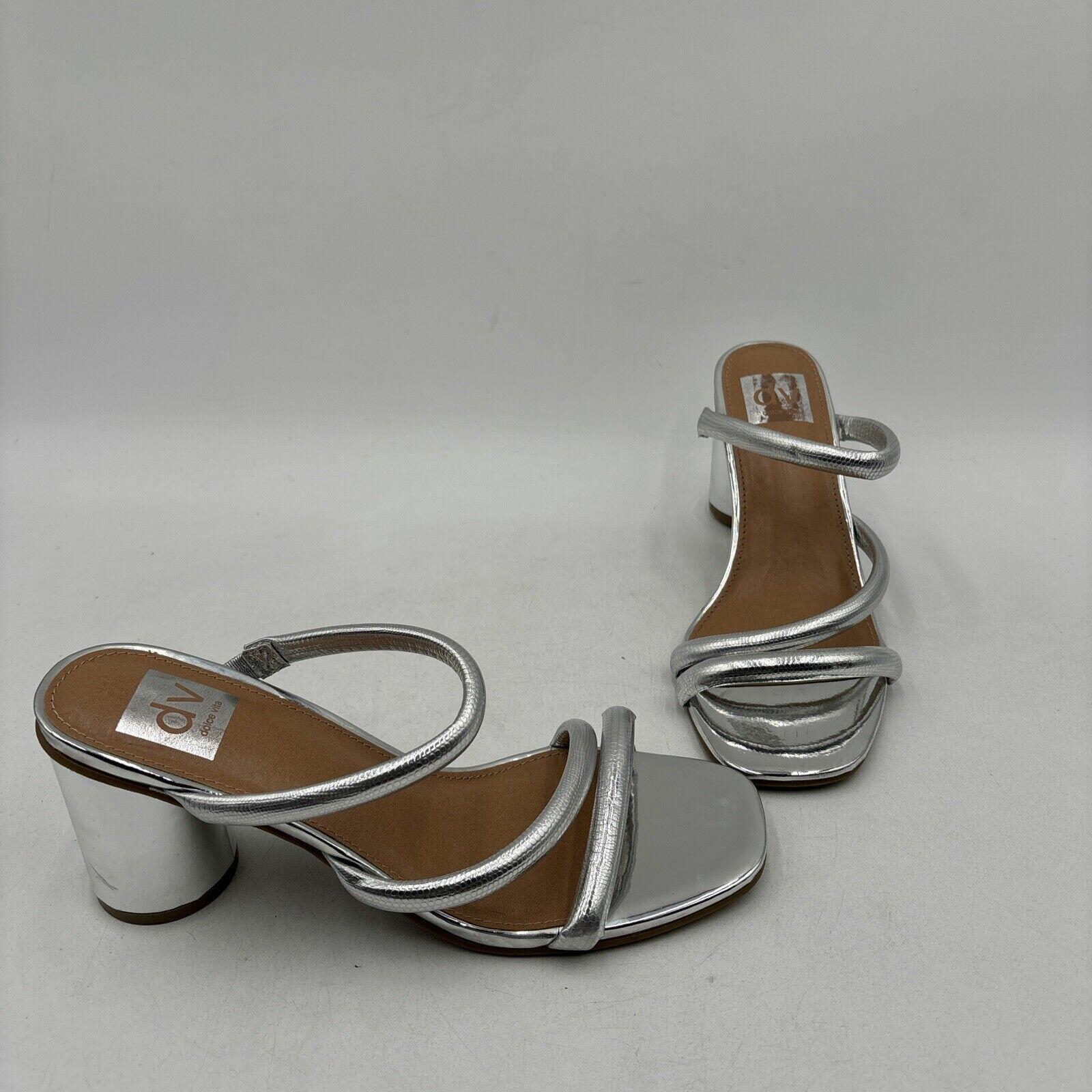 Elevate your shoe game with these stunning Dolce Vita MONA slip-on sandals. The silver faux leather upper material is accented with a beautiful logo, making these strappy sandals a must-have for any fashion-forward woman. The high block heel style adds a touch of elegance and sophistication to any outfit, while the comfortable features ensure all-day wearability. These sandals are perfect for any occasion, whether you're dressing up for a night out or keeping it casual on a sunny day. Add these Dolce Vita MONA sandals to your shoe collection today and step out in style.Upper material is in good condition with a few scuff marks. Insoles are in good condition. Bottom soles are in good condition.