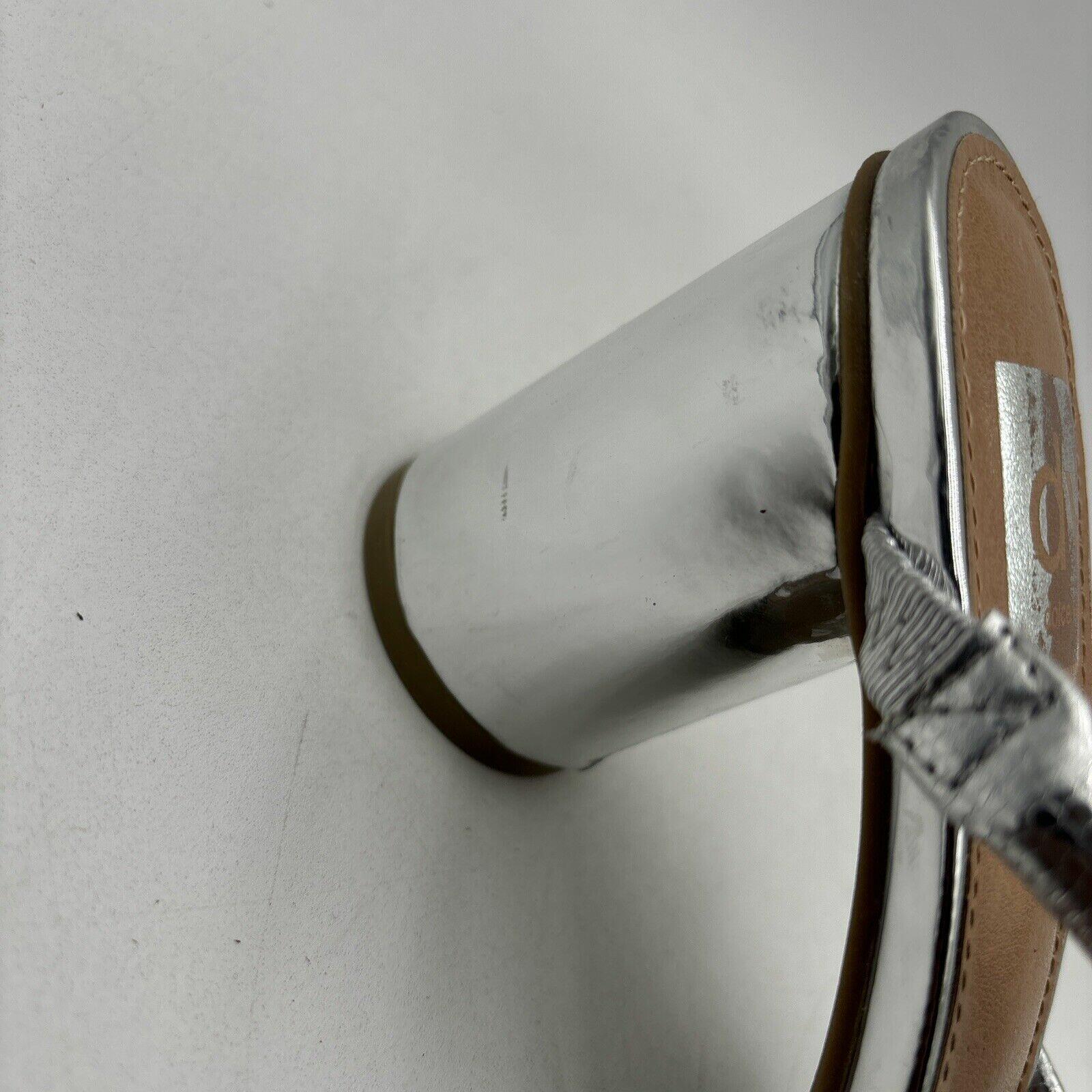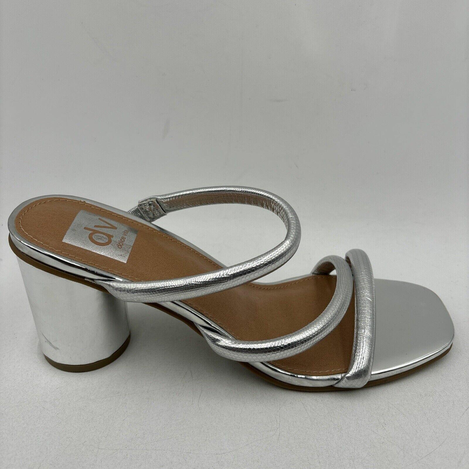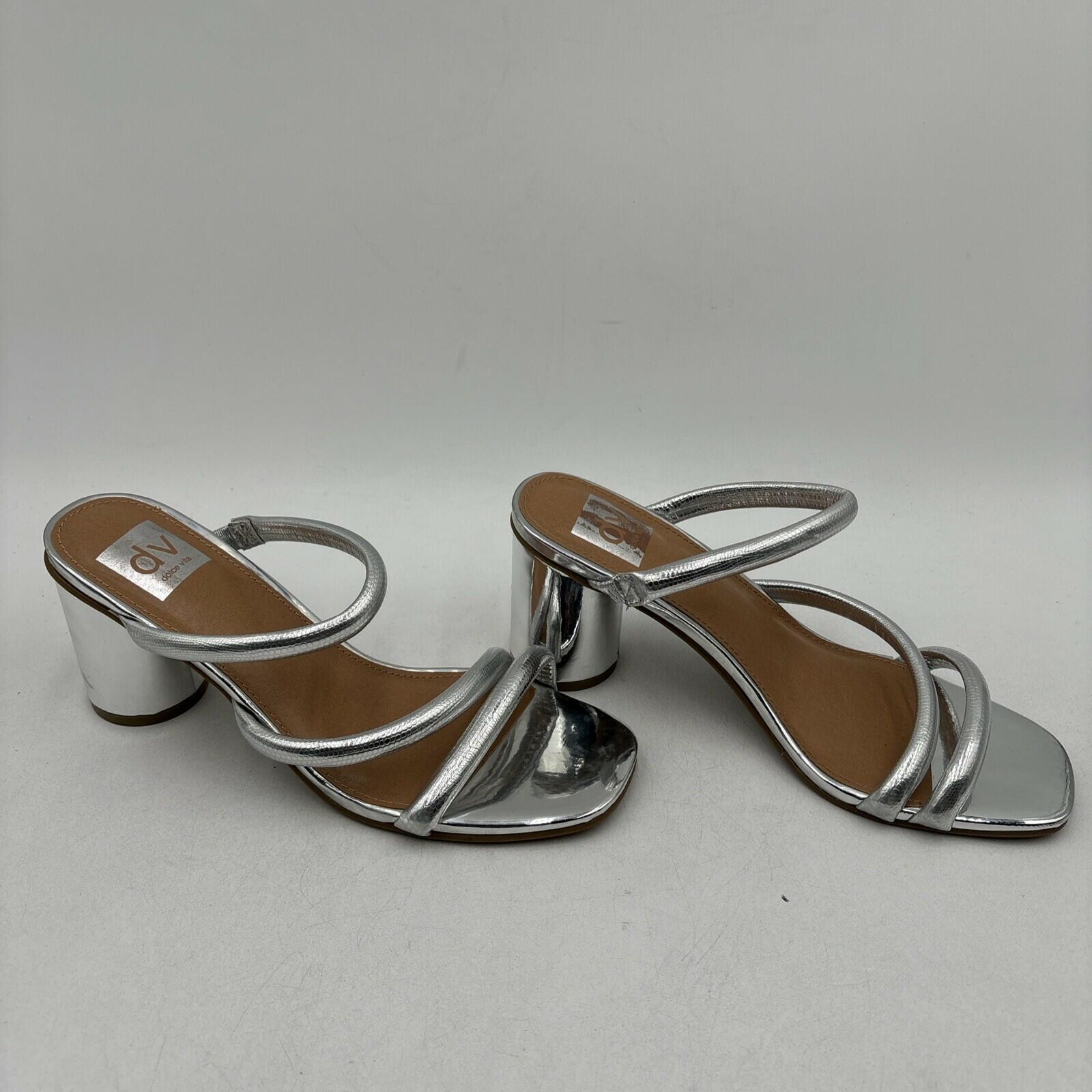 Elevate your shoe game with these stunning Dolce Vita MONA slip-on sandals. The silver faux leather upper material is accented with a beautiful logo, making these strappy sandals a must-have for any fashion-forward woman. The high block heel style adds a touch of elegance and sophistication to any outfit, while the comfortable features ensure all-day wearability. These sandals are perfect for any occasion, whether you're dressing up for a night out or keeping it casual on a sunny day. Add these Dolce Vita MONA sandals to your shoe collection today and step out in style.Upper material is in good condition with a few scuff marks. Insoles are in good condition. Bottom soles are in good condition.