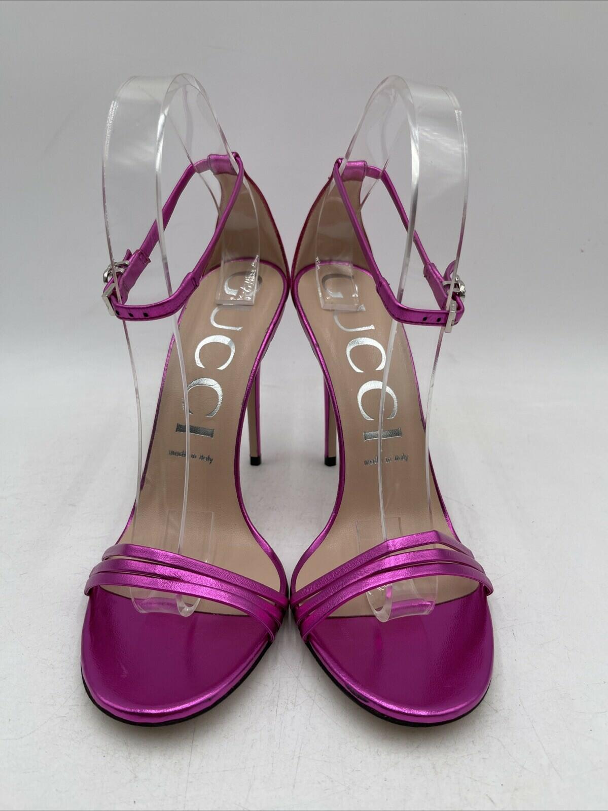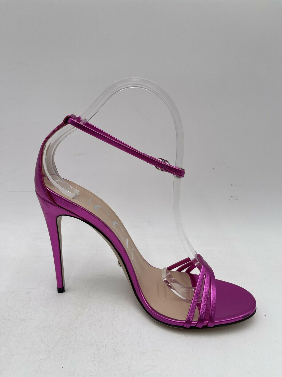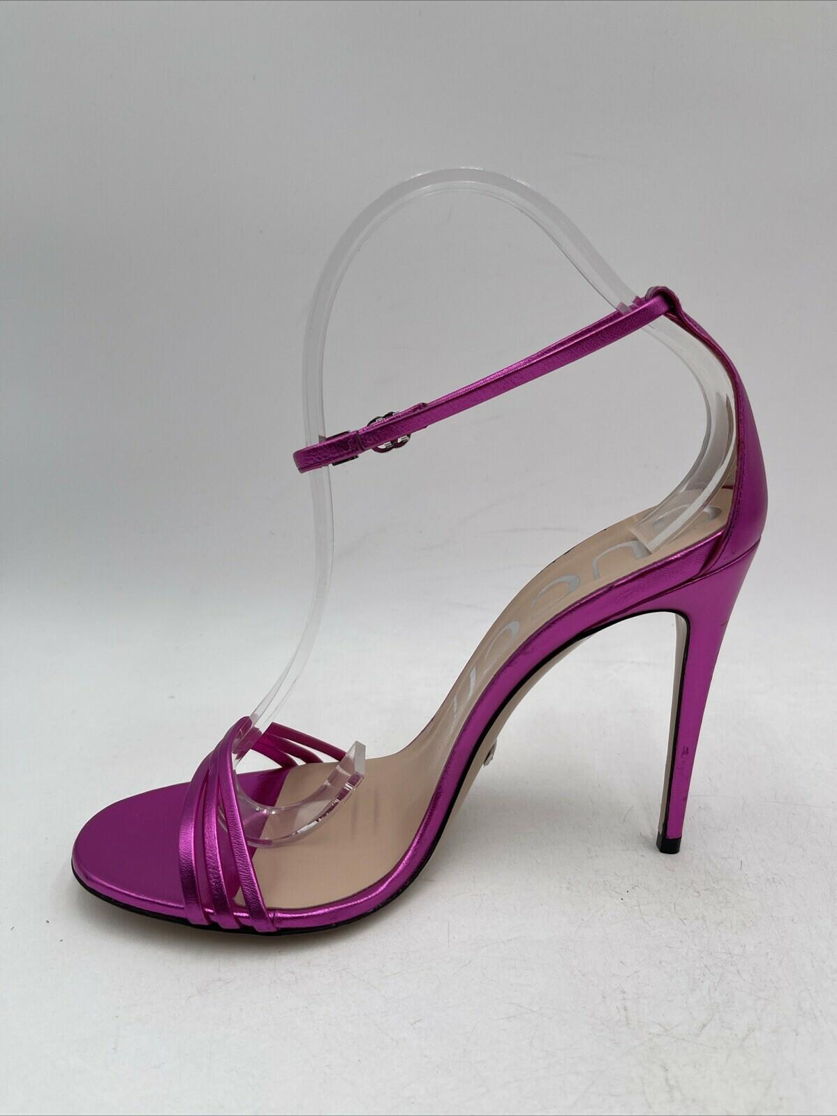 -Bottoms are stained with sharpie and has sticker residueElevate your shoe game with these stunning Gucci metallic leather sandals in a beautiful pink hue. The strappy design and ultra-high stiletto heel (4 inches and higher) make them perfect for any occasion. The buckle closure ensures a secure fit, while the logo accents add a touch of luxury.