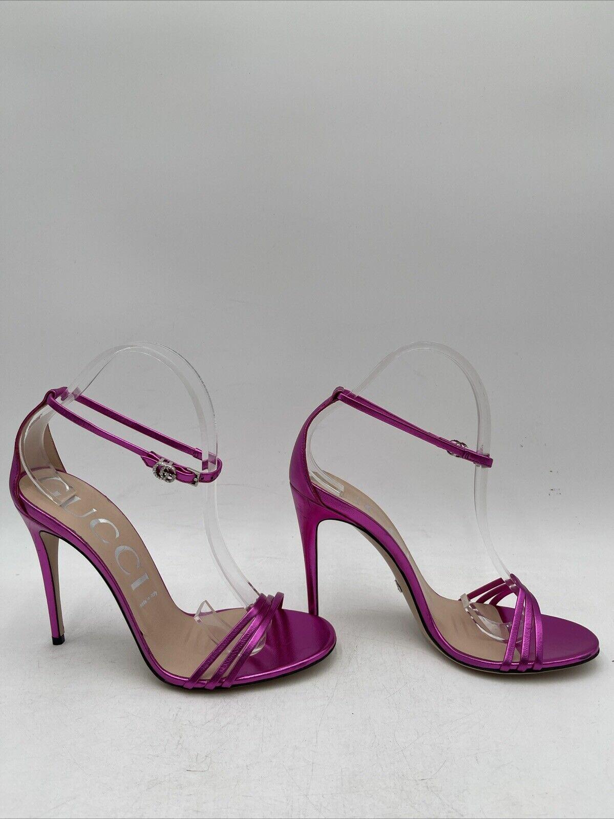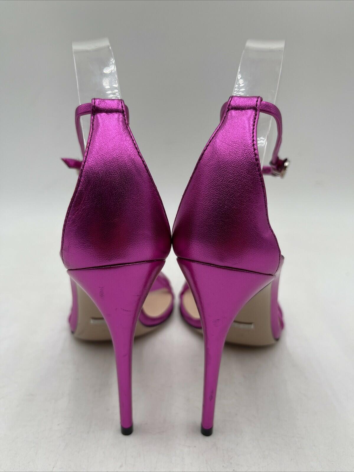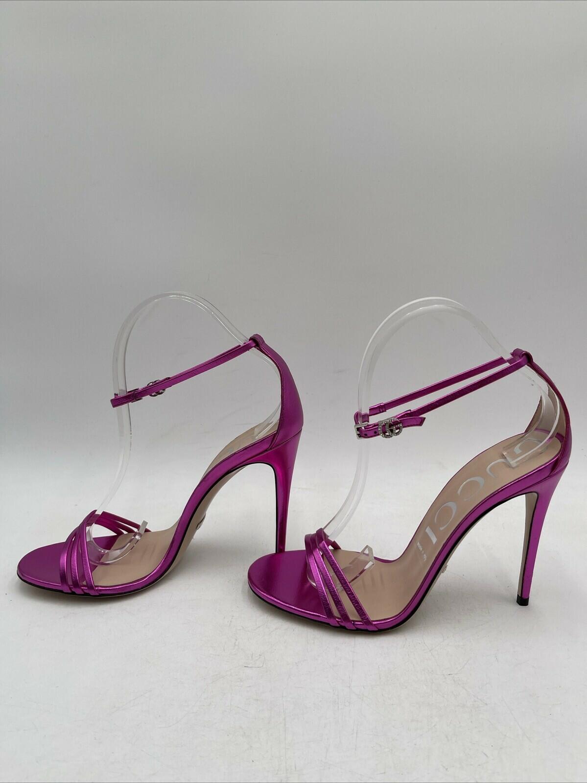 -Bottoms are stained with sharpie and has sticker residueElevate your shoe game with these stunning Gucci metallic leather sandals in a beautiful pink hue. The strappy design and ultra-high stiletto heel (4 inches and higher) make them perfect for any occasion. The buckle closure ensures a secure fit, while the logo accents add a touch of luxury.