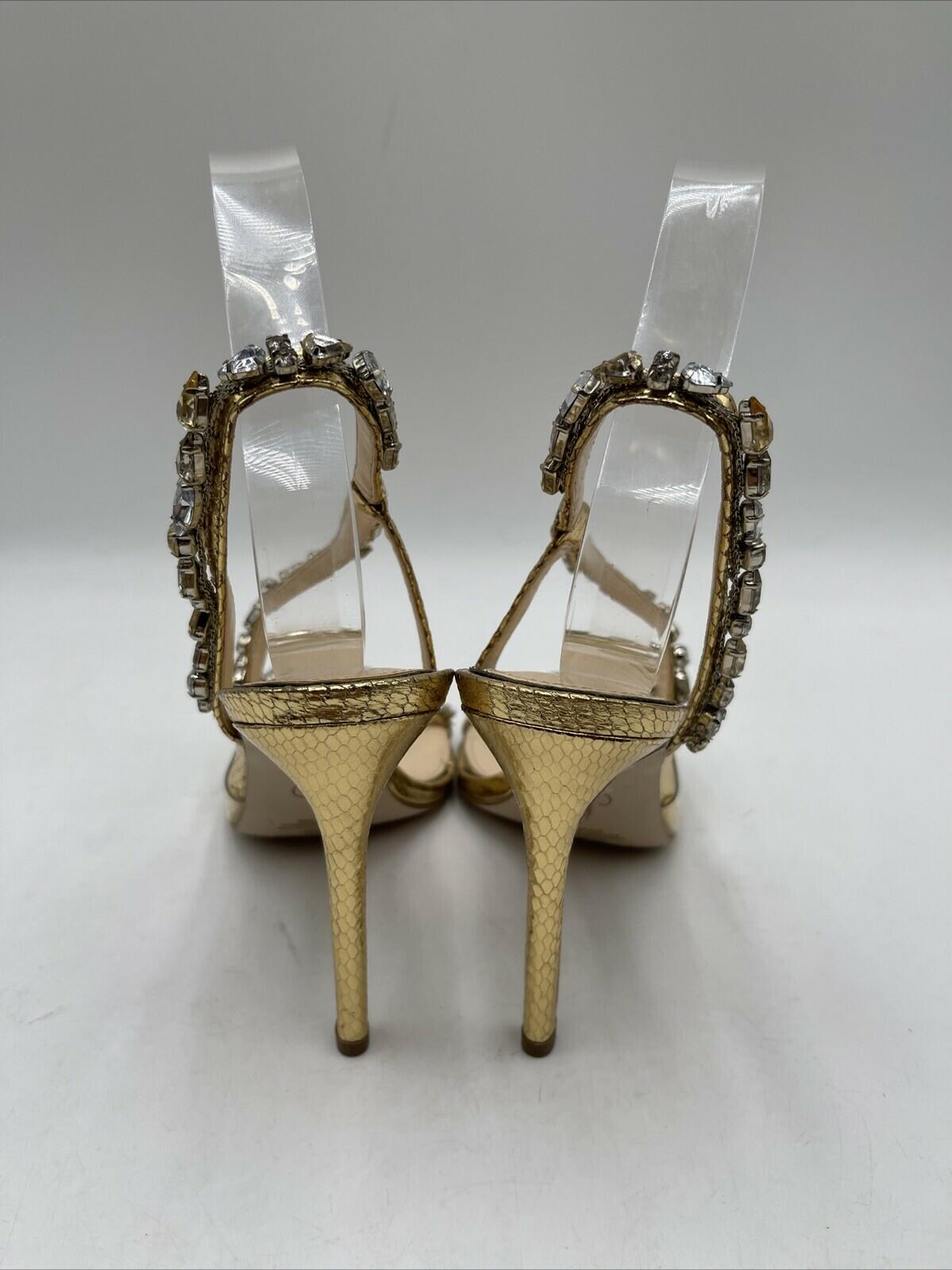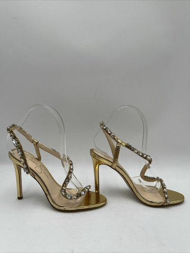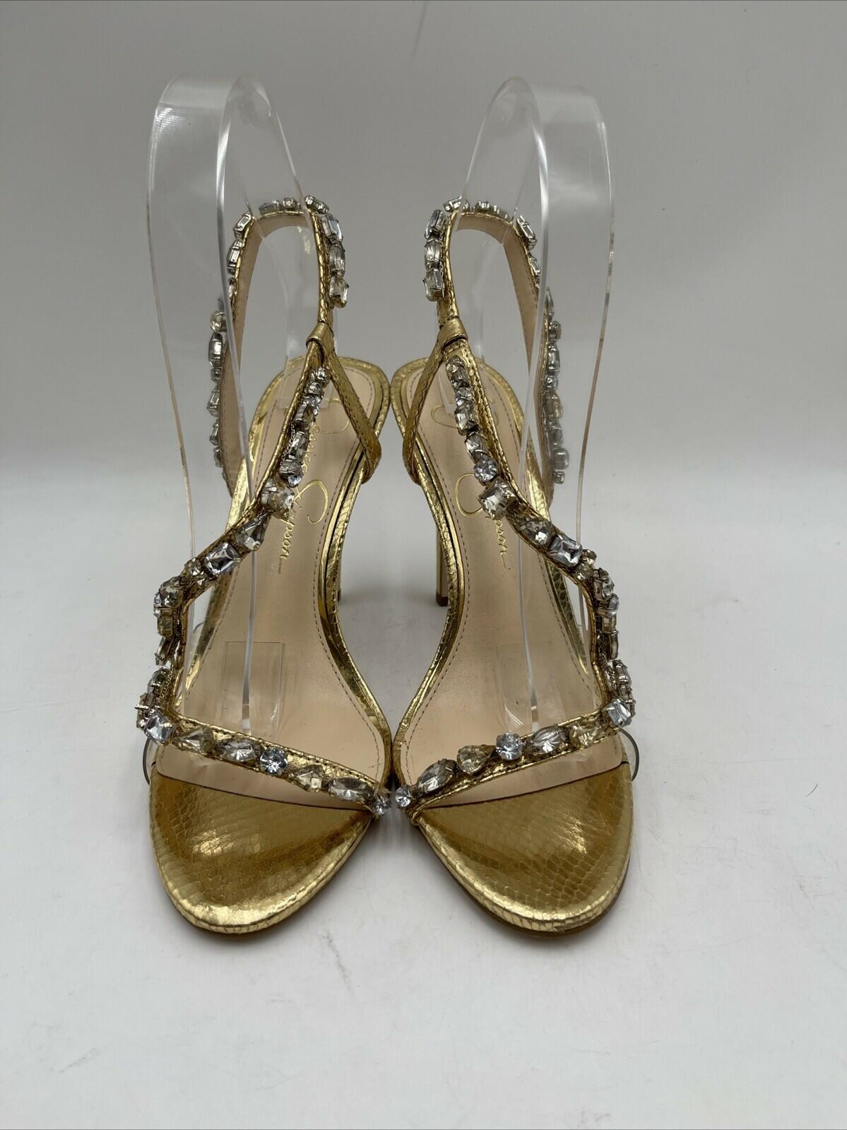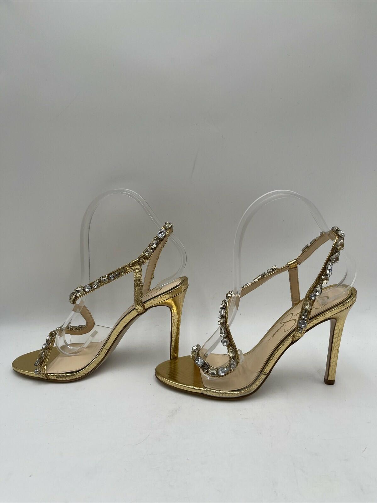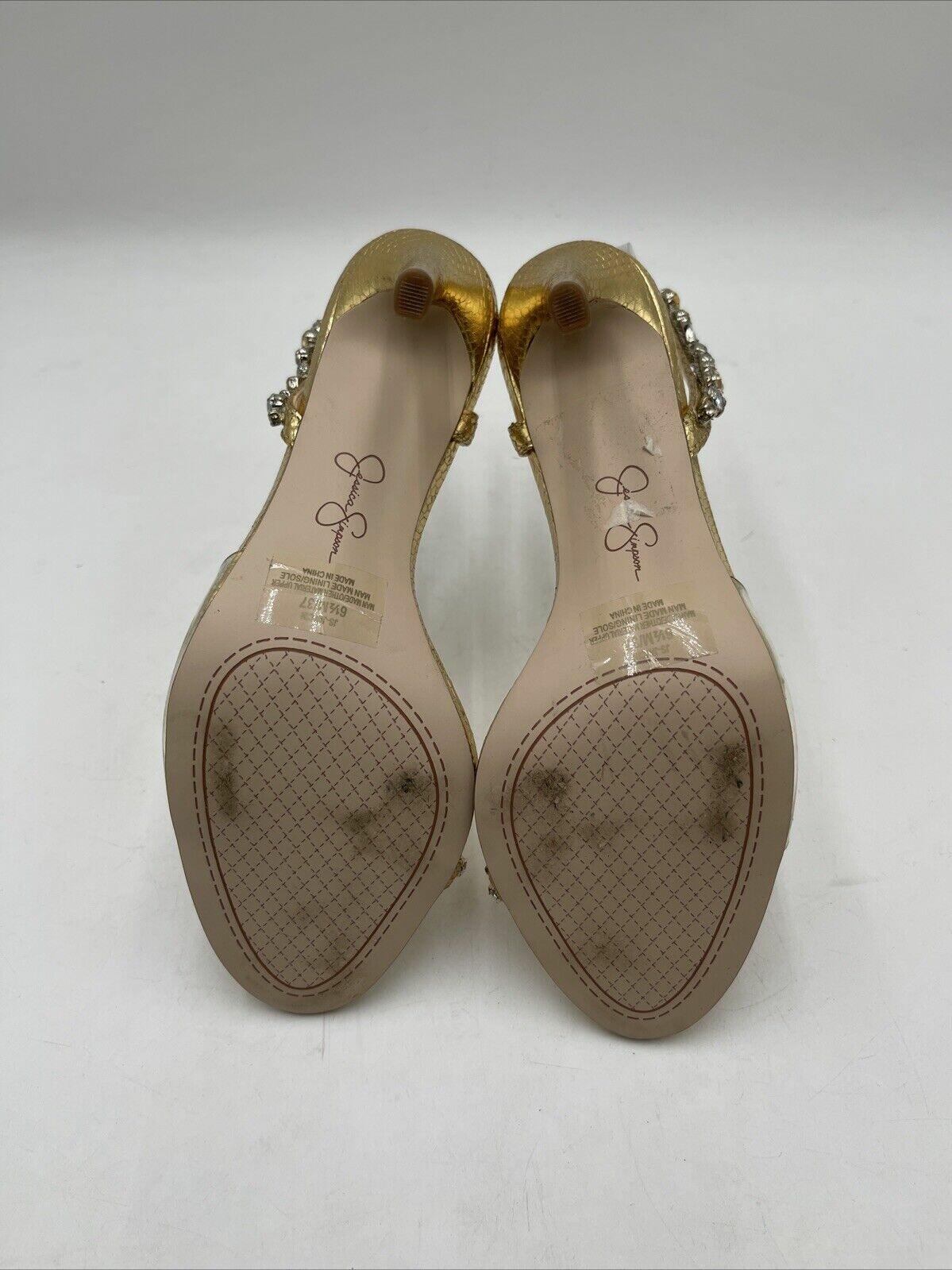 -Bottoms are lightly wornElevate your style with these stunning Jessica Simpson Jaycin Barely-There Sandals in Gold. These sandals feature a unique animal print pattern and a slip-on closure for easy wear. The ultra-high stiletto heel style adds a touch of glamour to any outfit, while the rhinestone and logo accents give these sandals a luxurious feel.