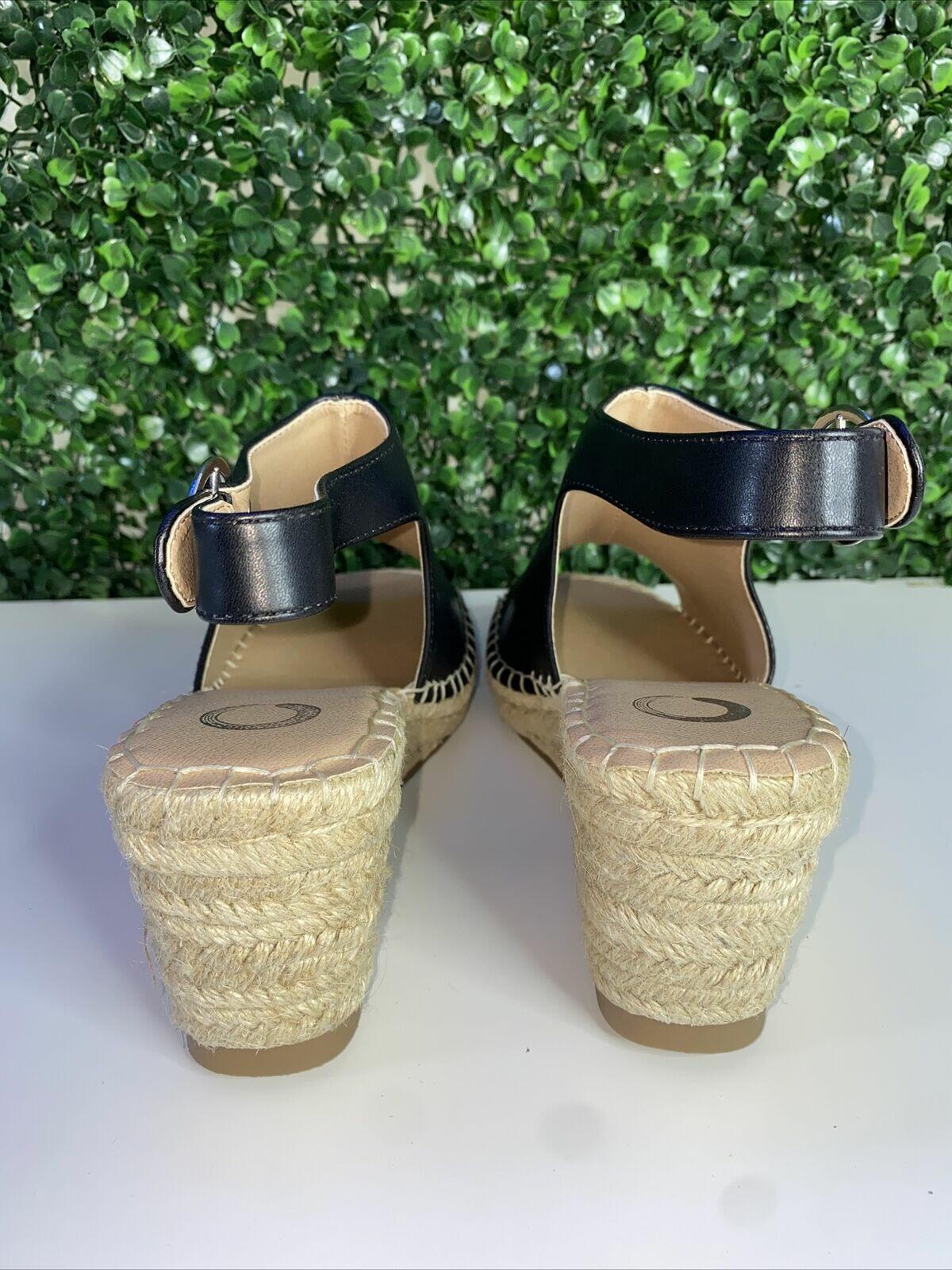 Elevate your style with this stunning pair of black wedge heels from Journee Collection. Crafted with synthetic upper material, these strappy heels are perfect for summer season. The medium height wedge heel is comfortable to wear and adds a touch of elegance to any outfit.