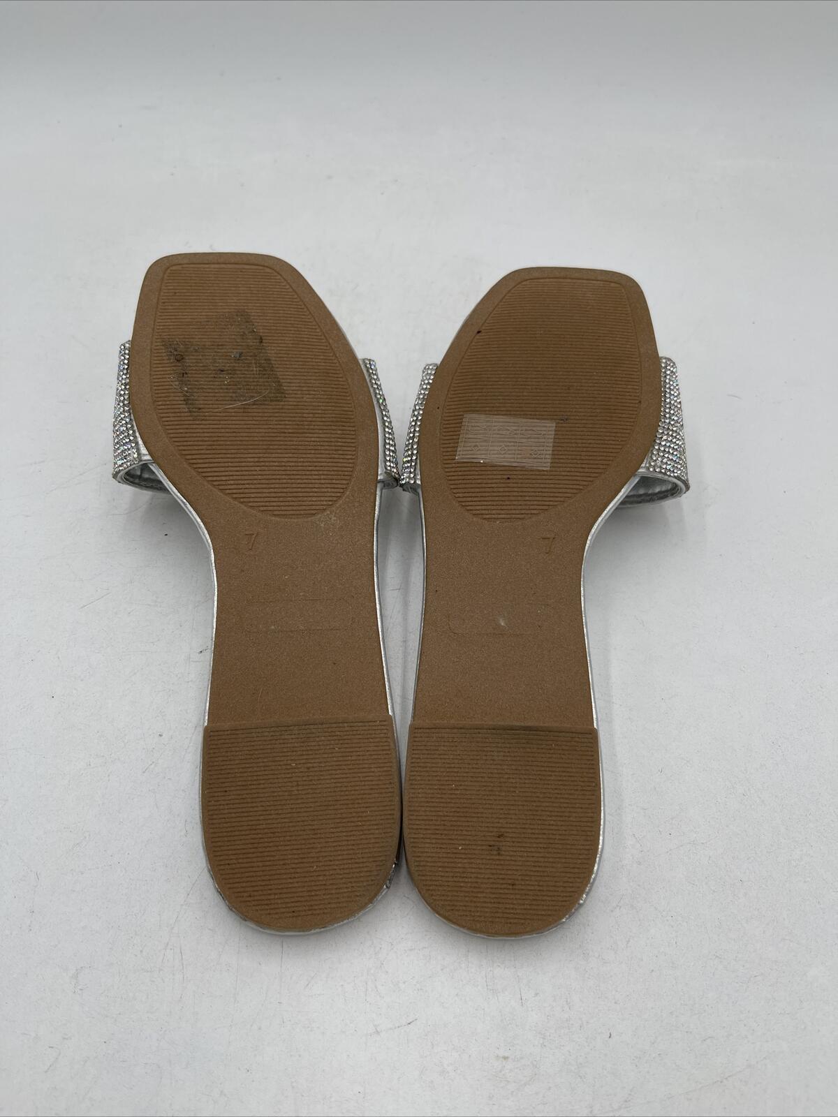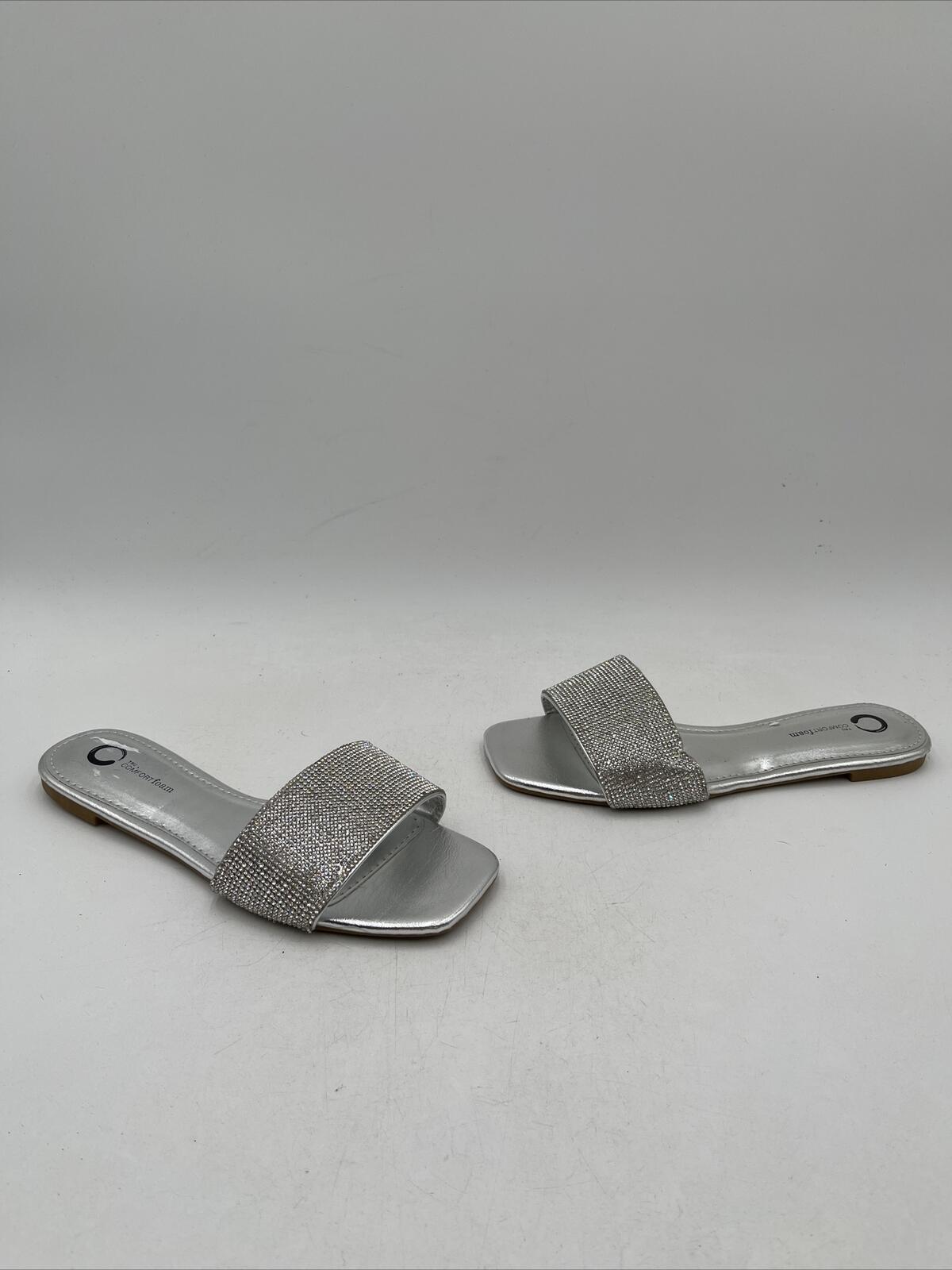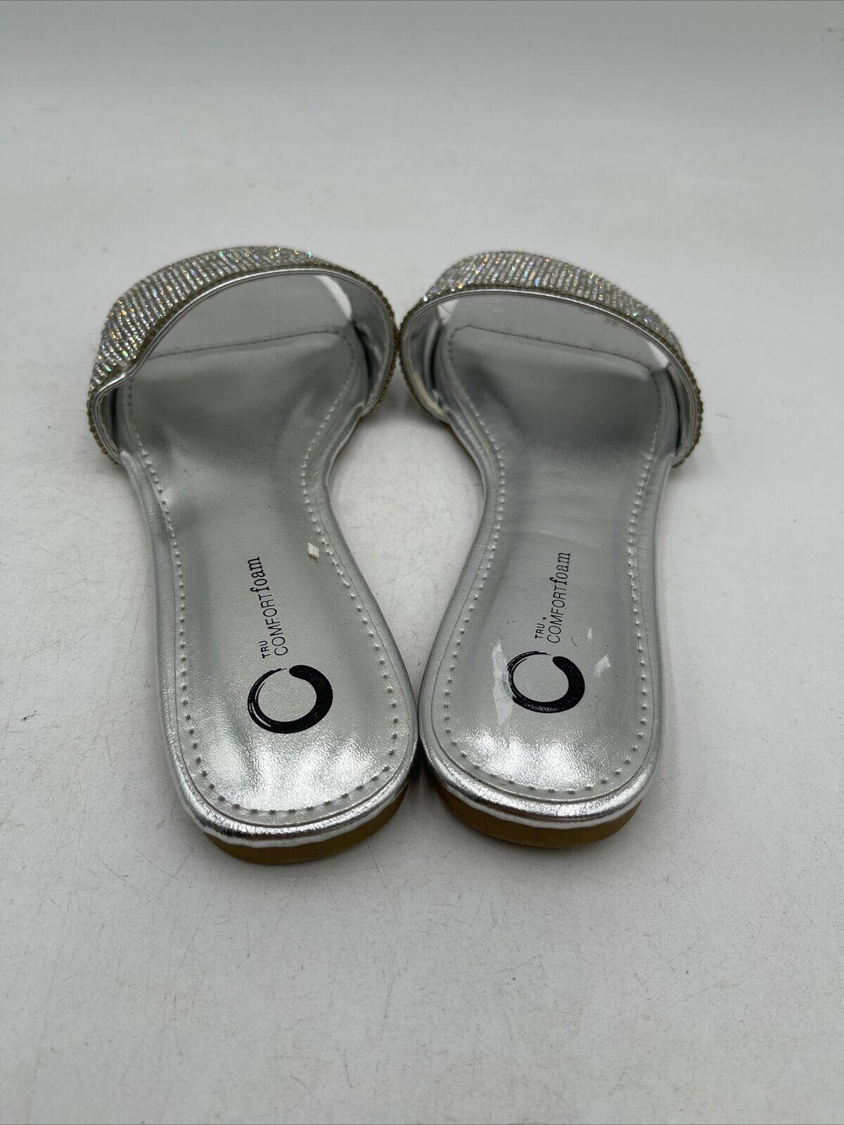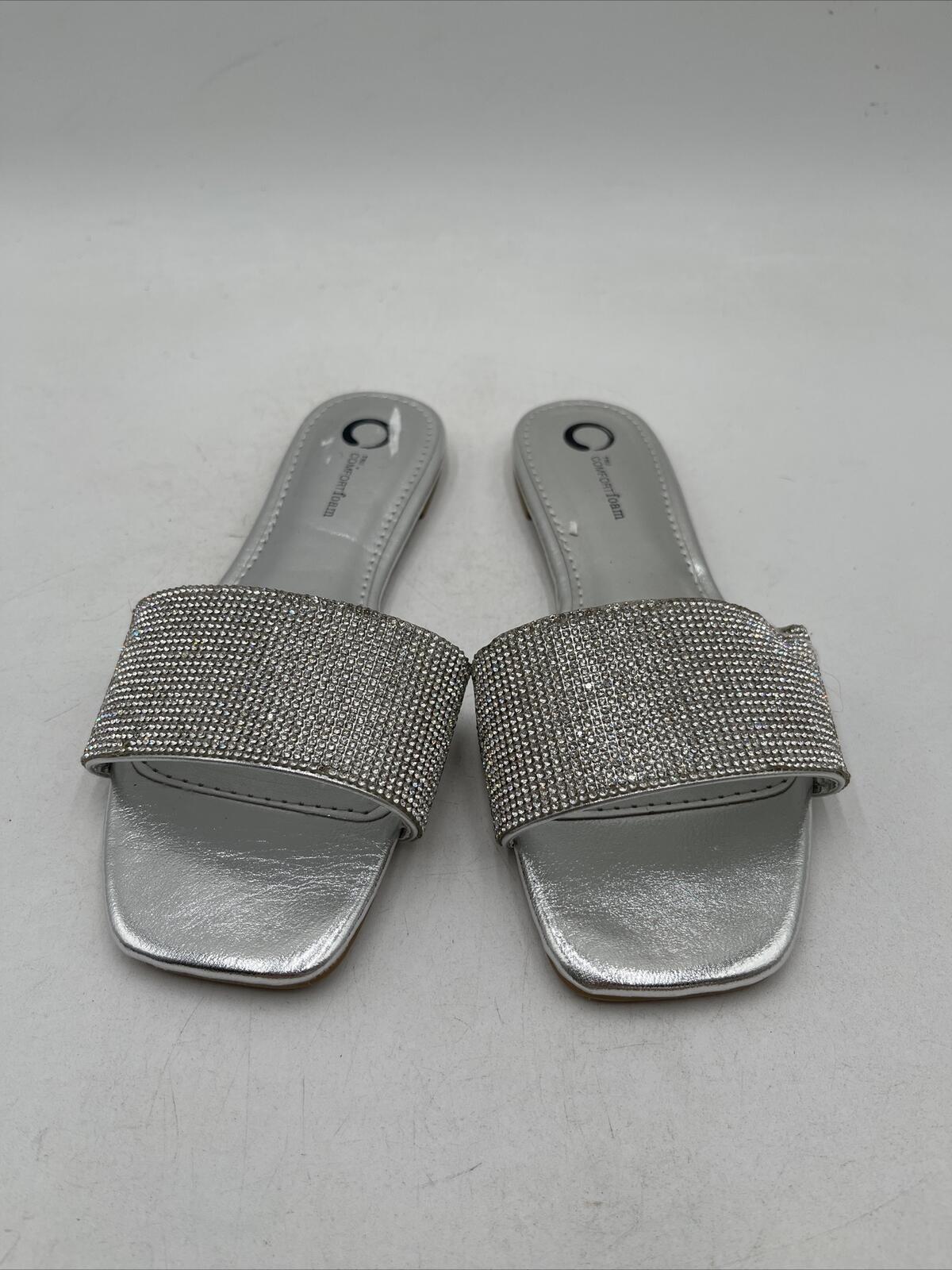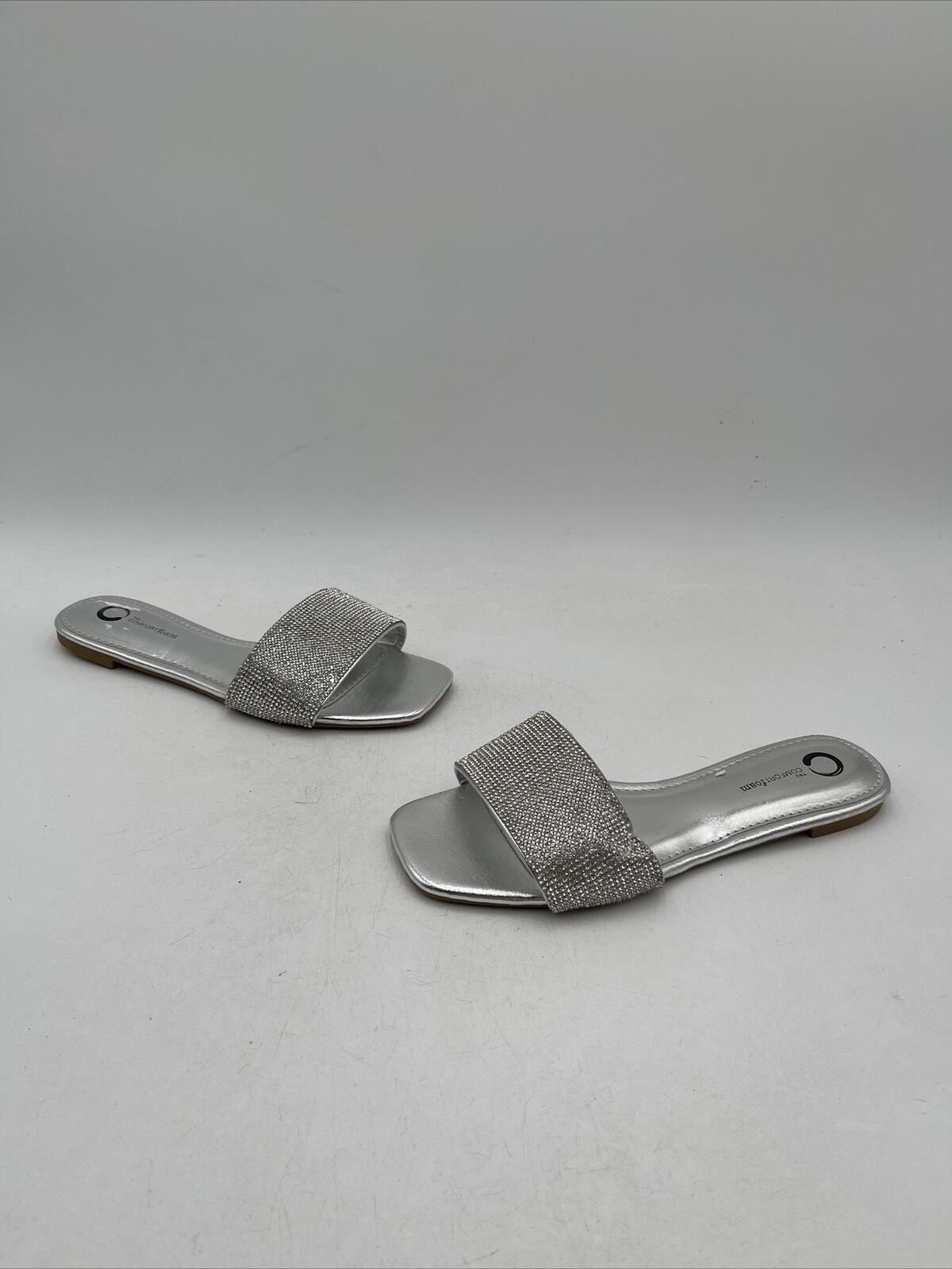 -Bottoms are lightly wornElevate your summer style with these stunning Journee Collection women's sandals in a beautiful silver color. Designed with comfort in mind, these sandals feature a flat heel height and a slide style, making them perfect for everyday wear. The synthetic upper material is paired with a foam insole material, providing ultimate comfort and support for your feet.