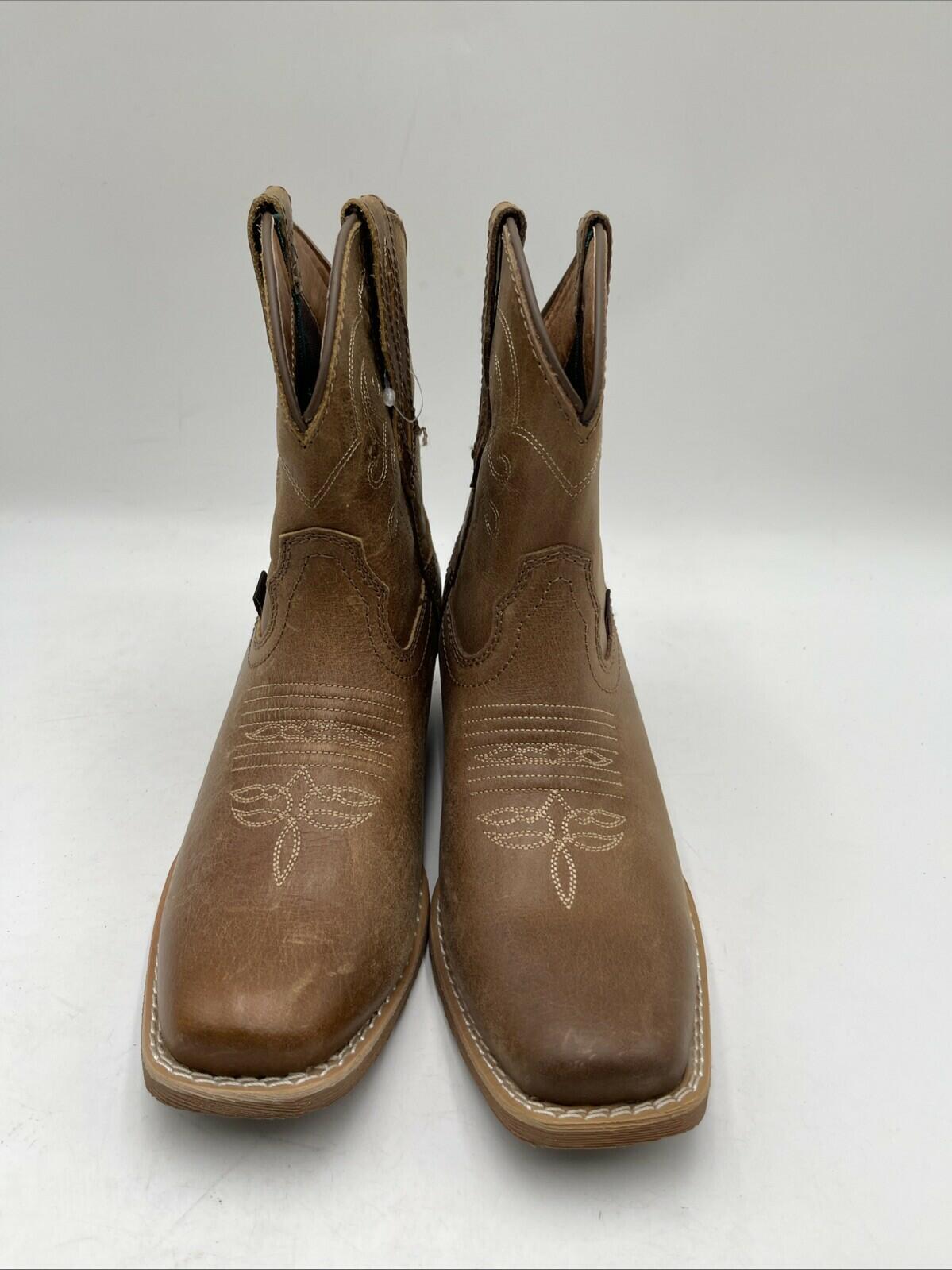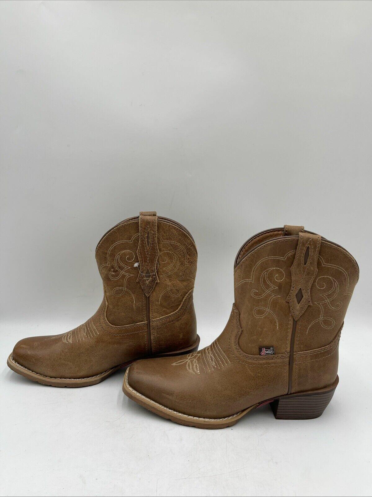 The Justin Women's Chellie Western Boots in brown are ankle height boots with a low block heel, designed for casual or party occasions. These size 6B boots feature a Western style with pull tabs for easy wear, made of leather with a fabric lining and foam insole for comfort. The outsole is man-made, and the brand is Justin Boots, making them a stylish and practical choice for those looking for a cowgirl-themed footwear option.