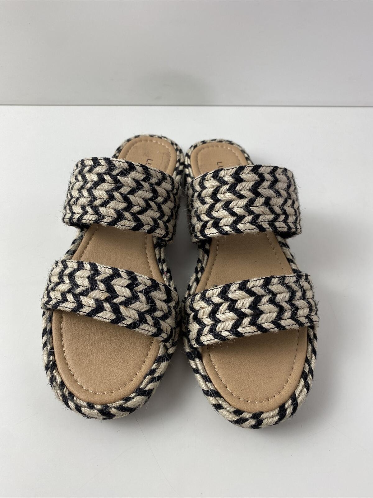 Lucky Brand WYNTOR Black/White Textile Strap Wedge Slide Sandals Womens Size 6MThe sandals are in good condition