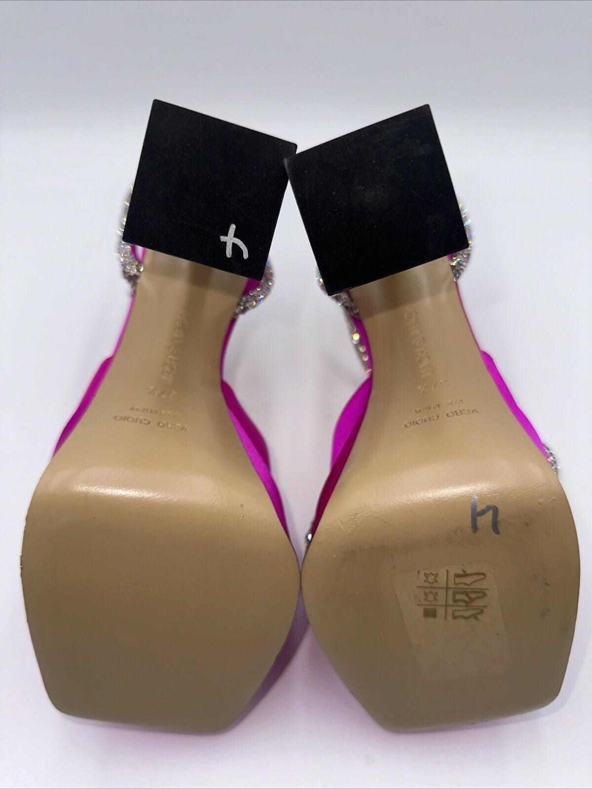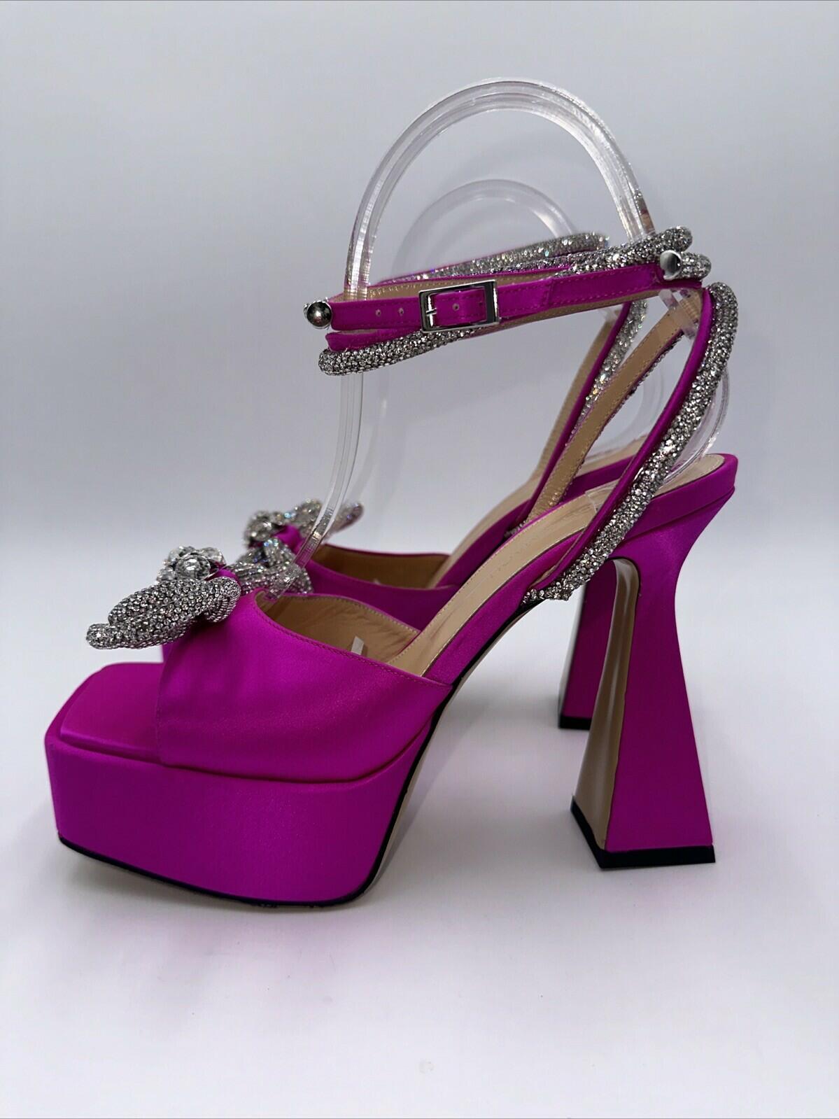Take a step towards luxury fashion with these Mach & Mach 140 Crystal Embellished Satin Platform Sandals in Fuchsia. The square toe design and ultra high block heel add a touch of elegance. The adjustable hook and eye closure ensures a secure fit. The pink silk upper material is complemented by the silver character and metal theme. These heels are perfect for any occasion and are available in size 37.5.- satin leather has small stains