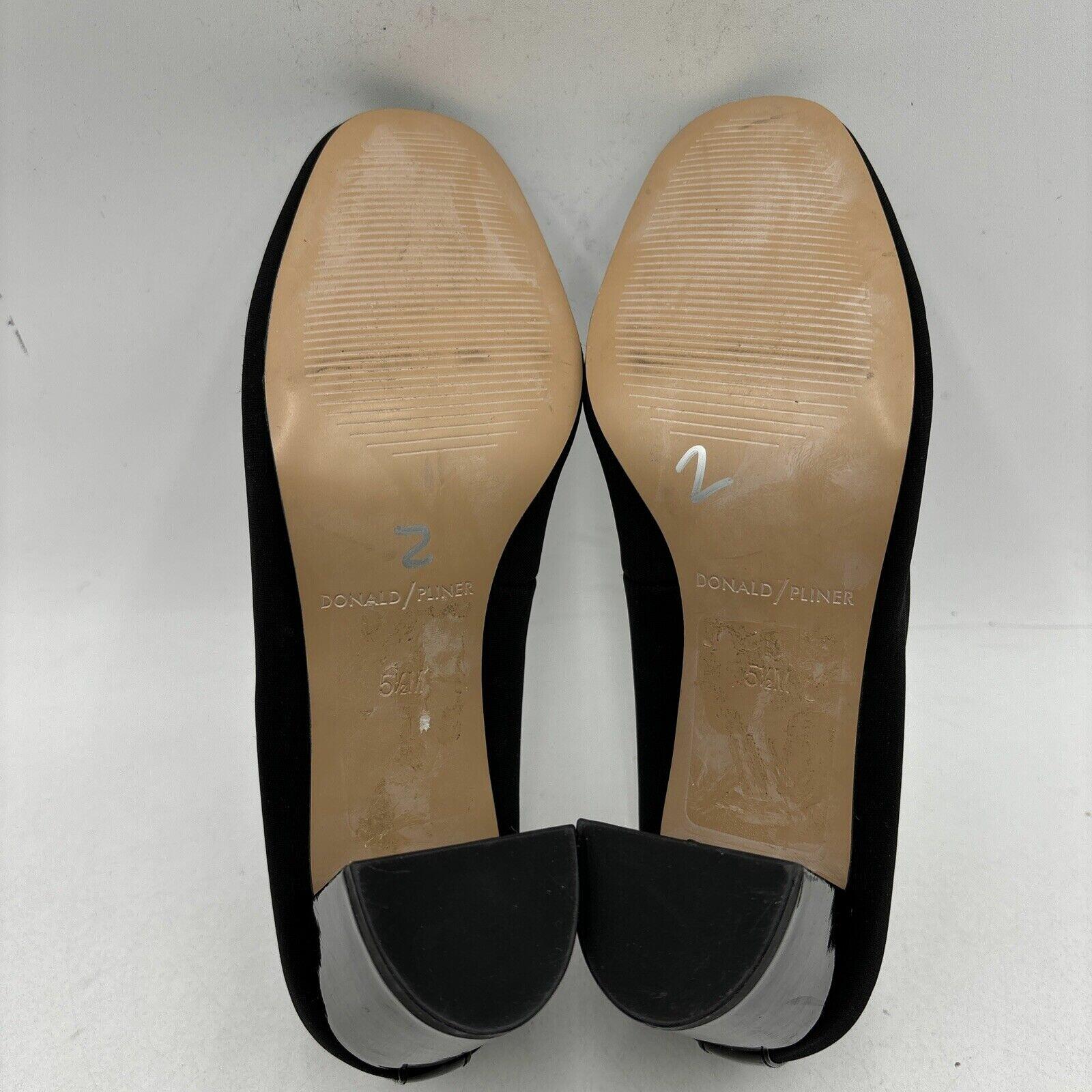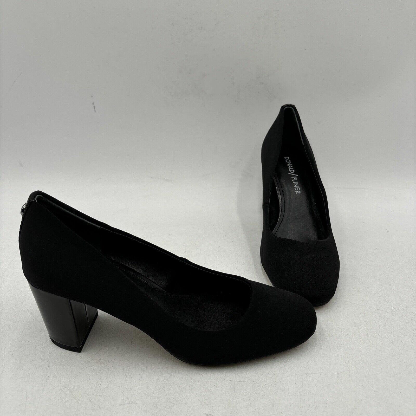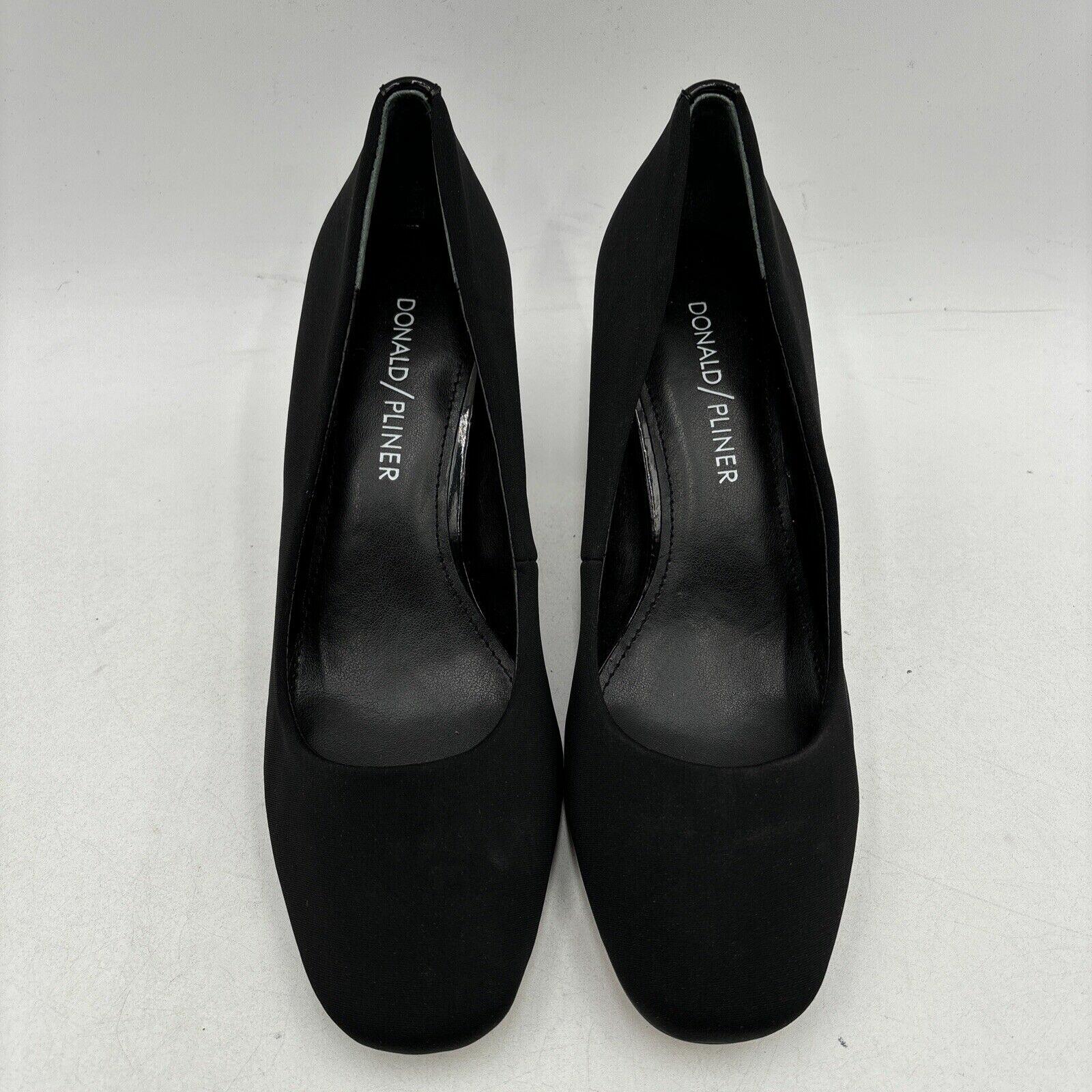 The Donald Pliner PARRIS Block Heel Pumps are stylish and comfortable shoes for women in size 5.5. These pumps feature a solid black textile upper with a round toe and slip-on closure for convenience. The mid-height block heel adds a touch of sophistication, making them perfect for a night out or special occasions. The brand, Donald Pliner, is known for its quality footwear, ensuring durability and style in these pumps.Upper material is in good condition. Insoles are in good condition. Bottom soles are in good condition.