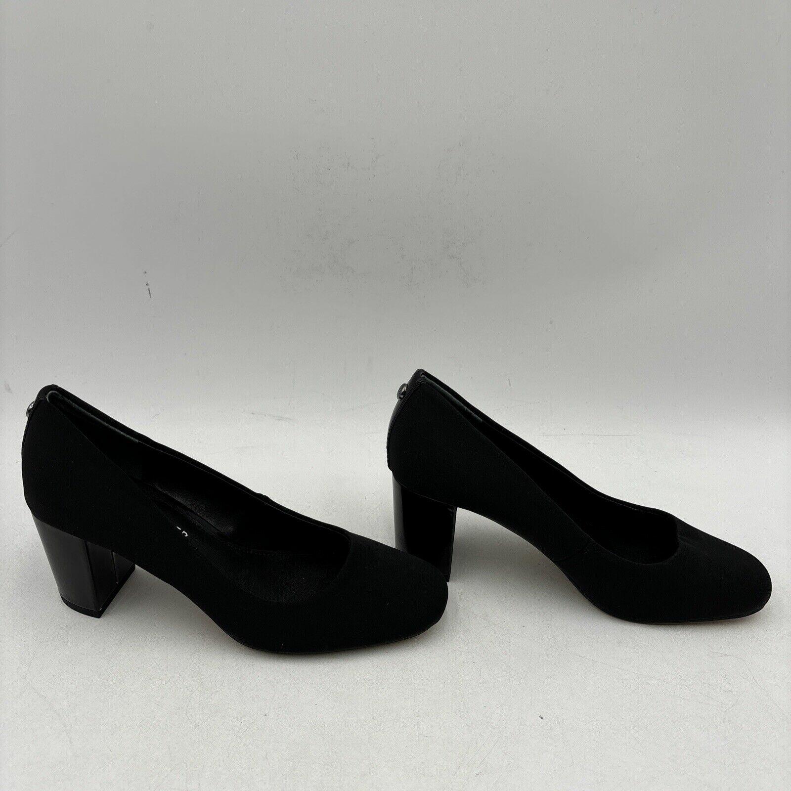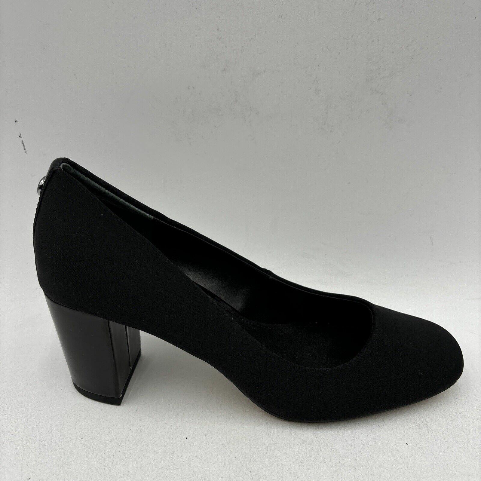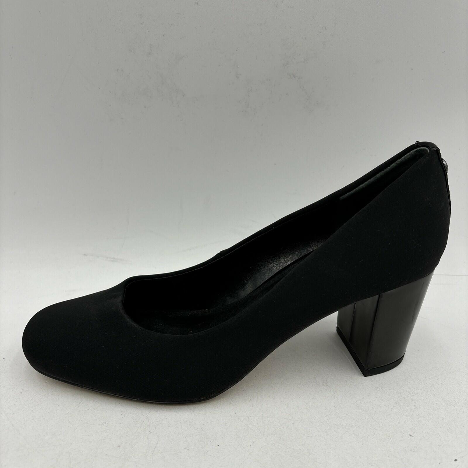 The Donald Pliner PARRIS Block Heel Pumps are stylish and comfortable shoes for women in size 5.5. These pumps feature a solid black textile upper with a round toe and slip-on closure for convenience. The mid-height block heel adds a touch of sophistication, making them perfect for a night out or special occasions. The brand, Donald Pliner, is known for its quality footwear, ensuring durability and style in these pumps.Upper material is in good condition. Insoles are in good condition. Bottom soles are in good condition.