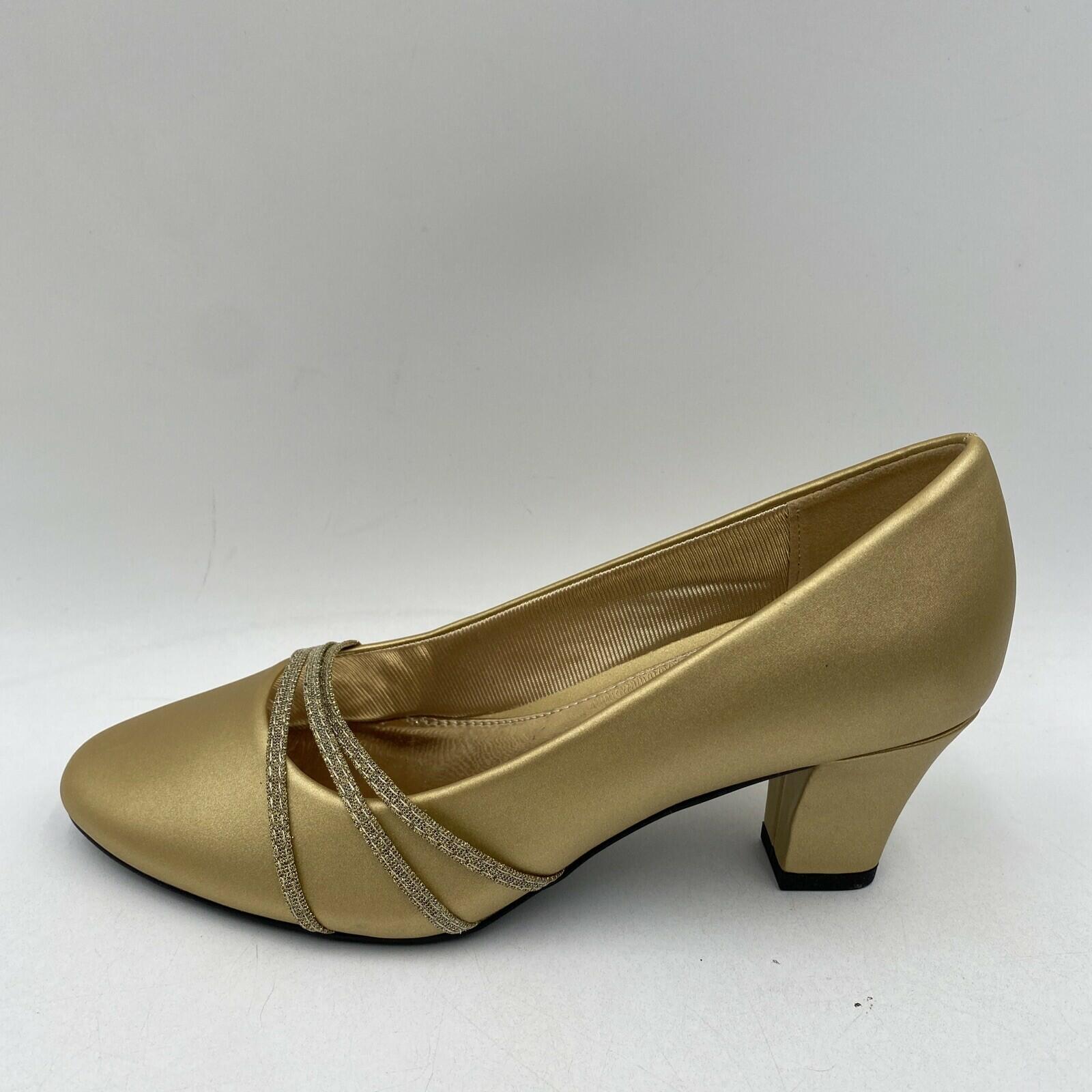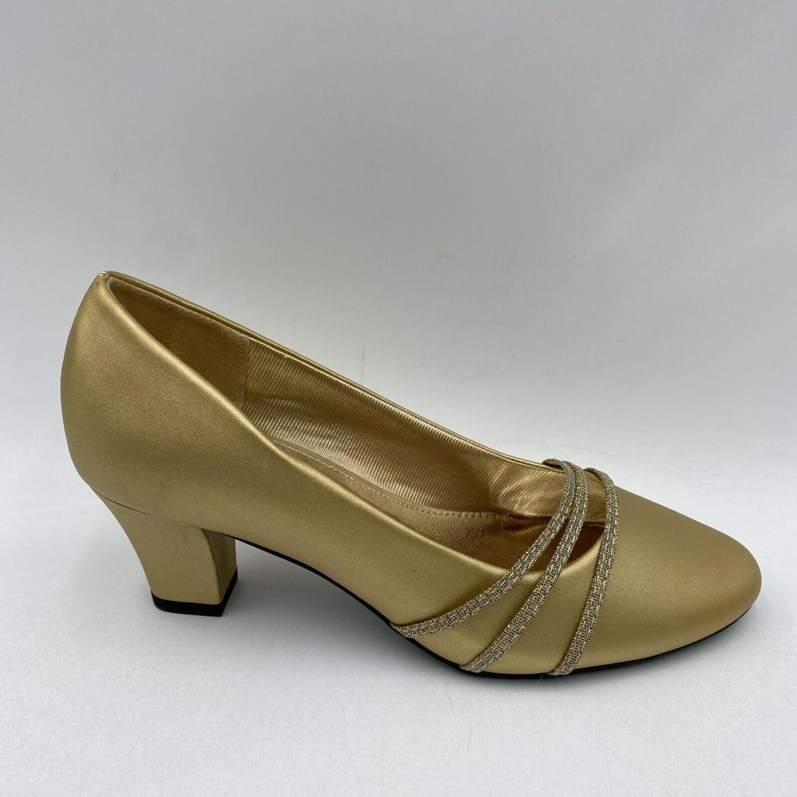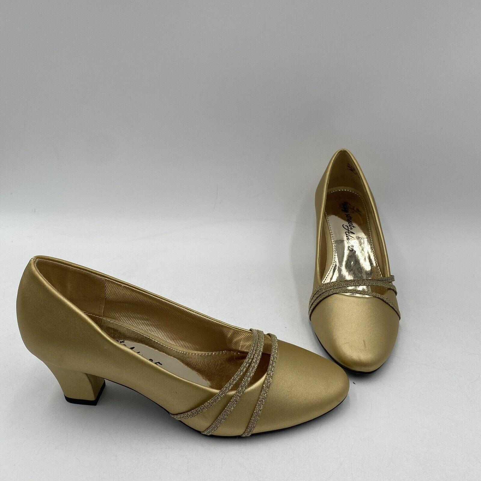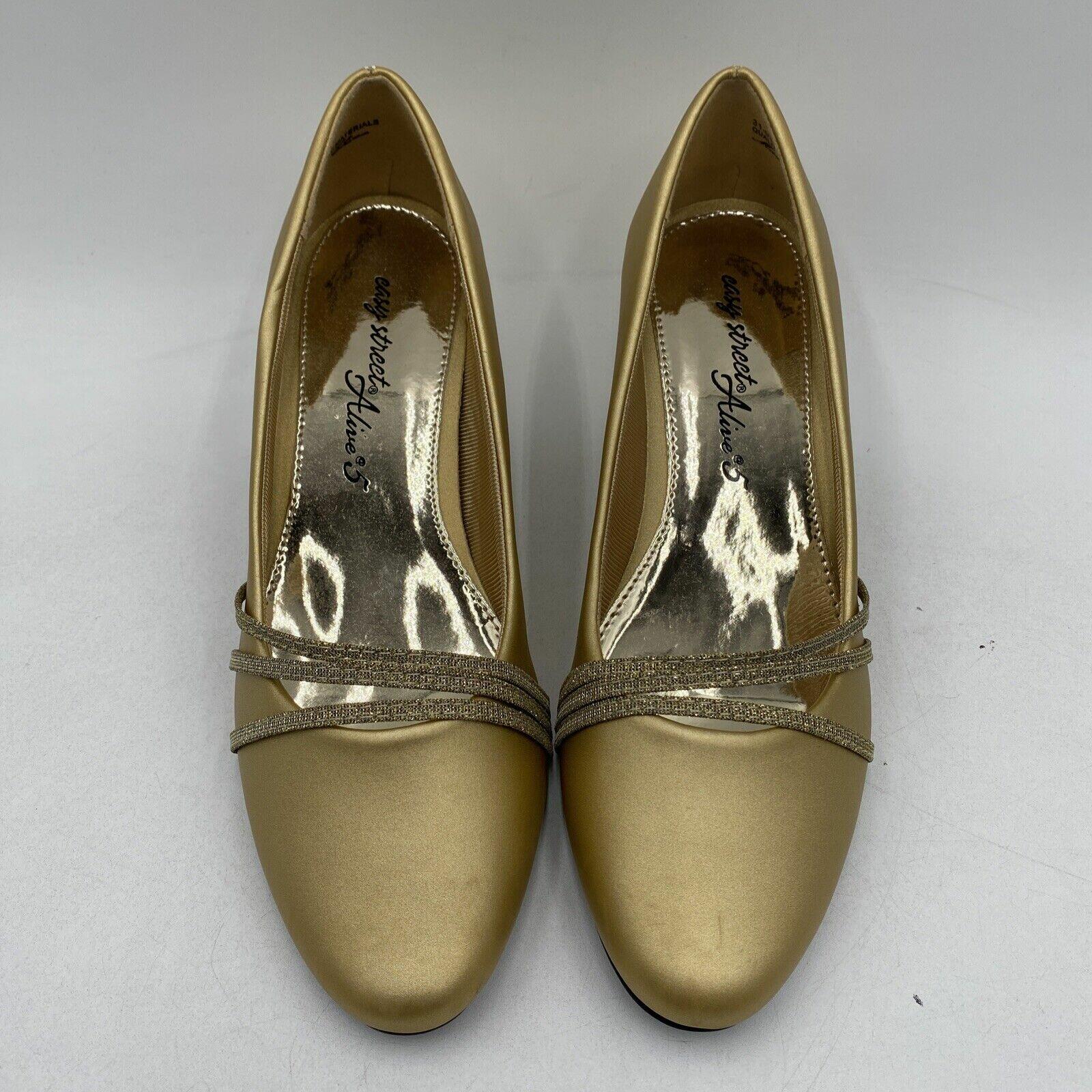 Add a touch of glamour to your wardrobe with these Easy Street CRISTINY pumps. The round toe and slip-on closure make them easy to wear, while the mid-height block heel provides comfort for all-day wear. The gold glitter textile upper material is perfect for any occasion, whether you're dressing up for a night out or adding some shine to your work outfit. These pumps are available in size 7M and are a great addition to any woman's shoe collection.Upper material is in good condition with a few tiny scratches. Insoles are in good condition. Bottom soles are in good condition.