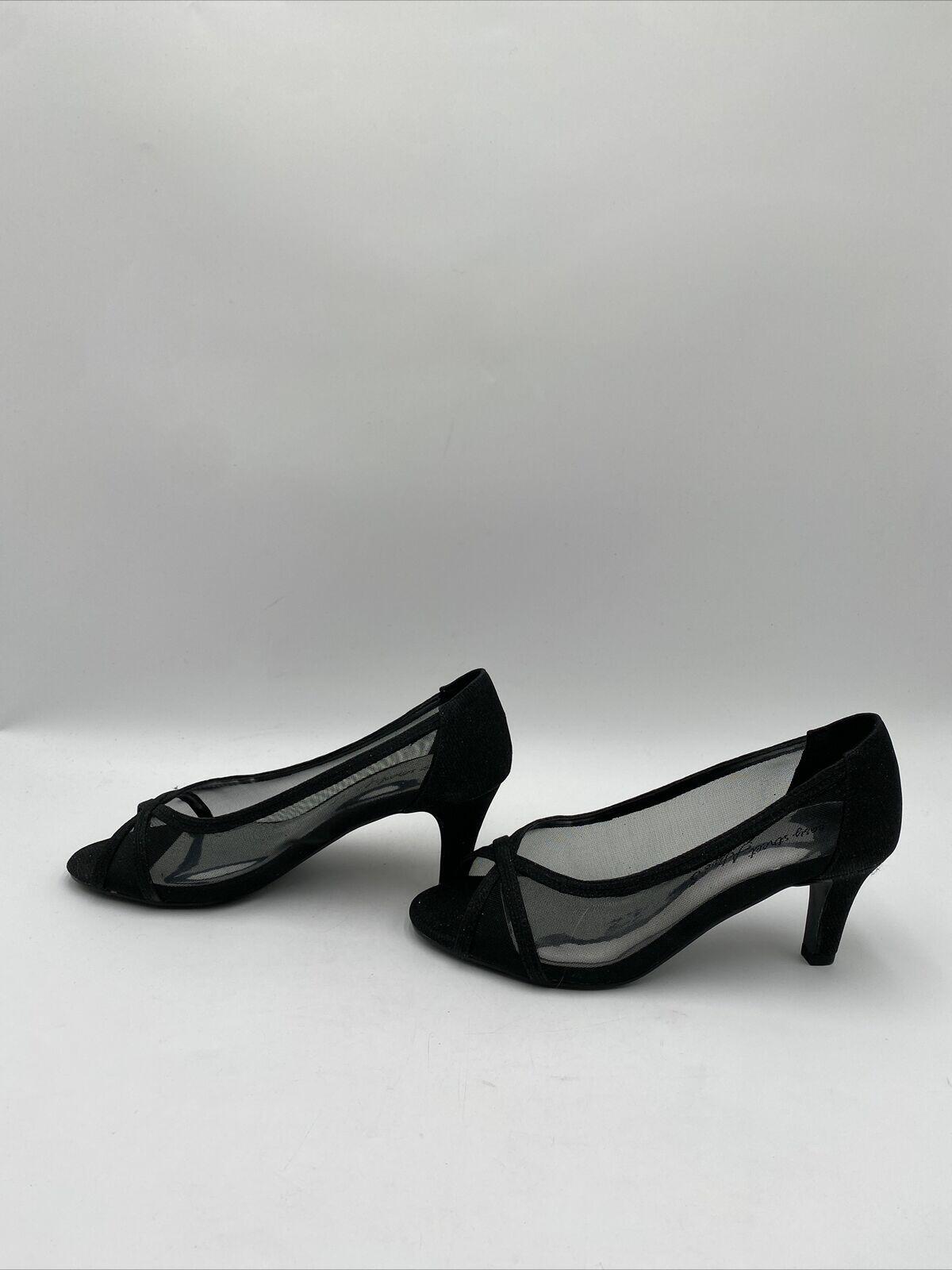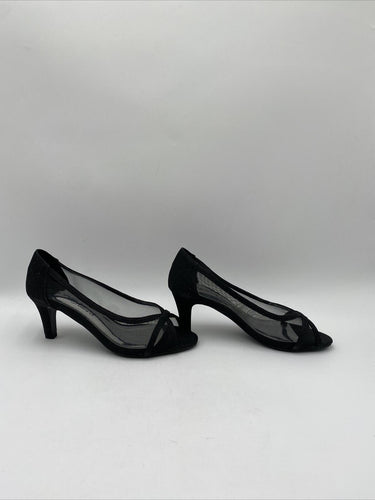 Dress up your ensemble with the Easy Street Picaboo Pumps, a sleek addition to any wardrobe. These size 7W heels feature a classic black textile upper and a versatile open-toe design, ideal for both formal and casual outings. The mid-height stiletto heel provides a subtle lift, making them perfect for those who appreciate a touch of elegance without the discomfort of very high heels.