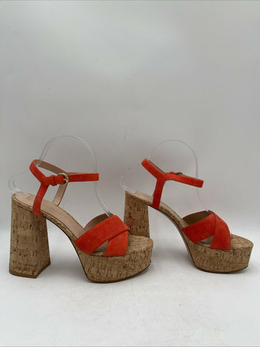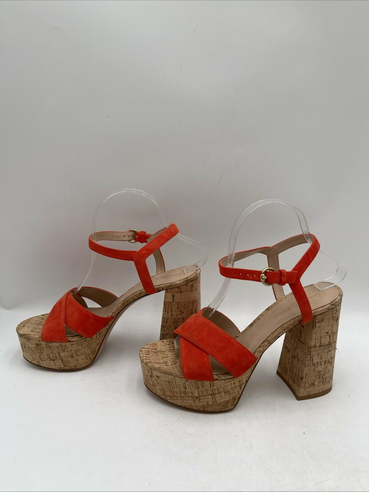 -Bottoms are barely worn and has sticker residueThis is a pair of Gianvito Rossi platform sandals for women in size 38.5 (US and EU). The sandals feature a red suede upper with cork platform heel, open toe design, ankle strap closure with buckle, and ultra high block heel. The insole and lining are made of leather, and the outsole is suede. These stylish sandals have a celebrity-inspired design and are crafted in Italy by the luxury brand Gianvito Rossi.