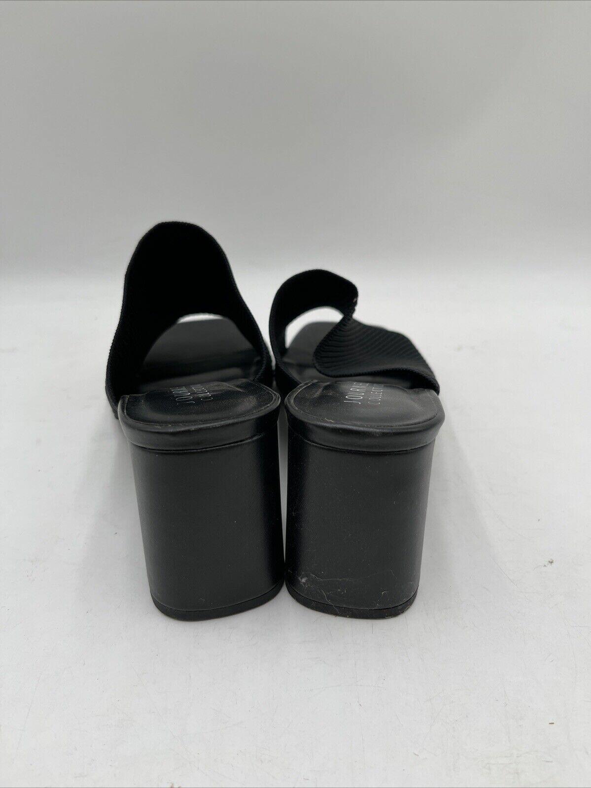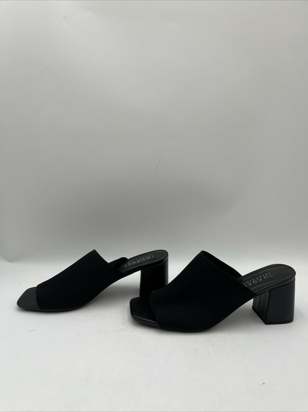 Elevate your style with these elegant Journee Collection women's sandals in black. The slip-on design with a high block heel measuring between 3-3.9 inches provides both comfort and style. These sandals feature a solid pattern, Journee Collection logo accents, and a fabric upper material.Perfect for any occasion, these sandals are customized with no vintage features. They are suitable for women and come in size 11 with a slip-on closure. These sandals are a must-have for any fashion-forward woman looking to add a touch of style to her wardrobe.