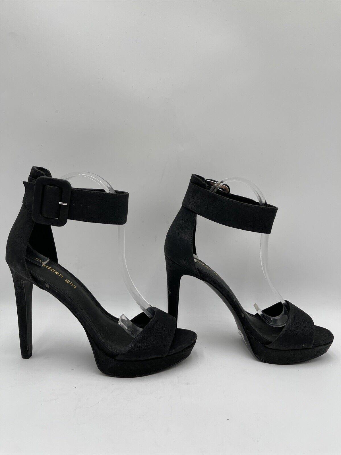 These Madden Girl Corral heels in black, size 9M, are open-toe pumps with a solid synthetic upper. They have an ultra-high stiletto heel, a buckle closure, and an adjustable strap. The design is ideal for going out, and the brand is Madden Girl.