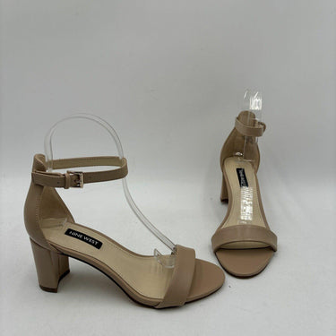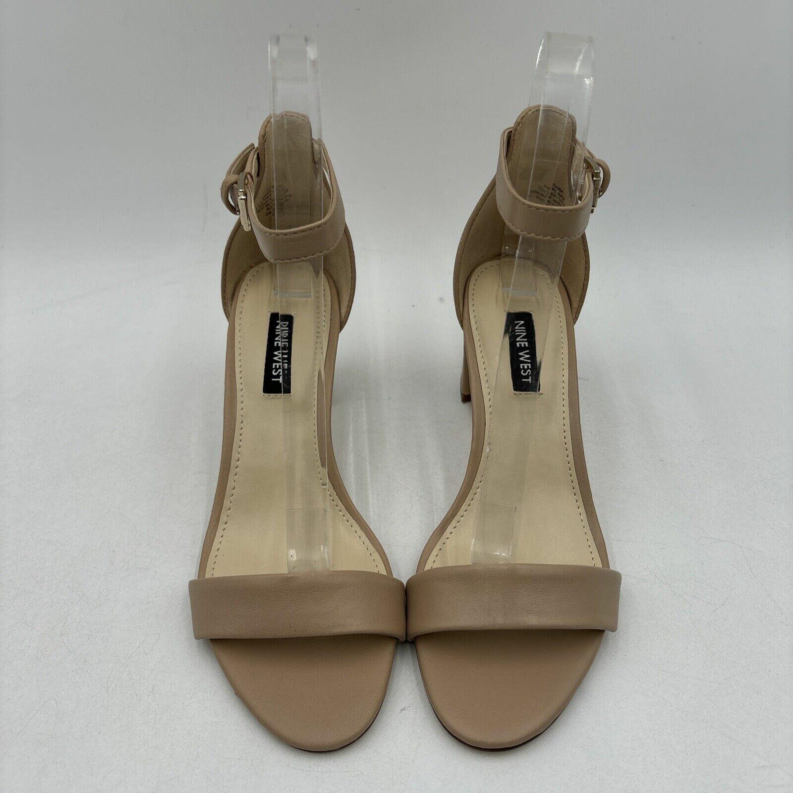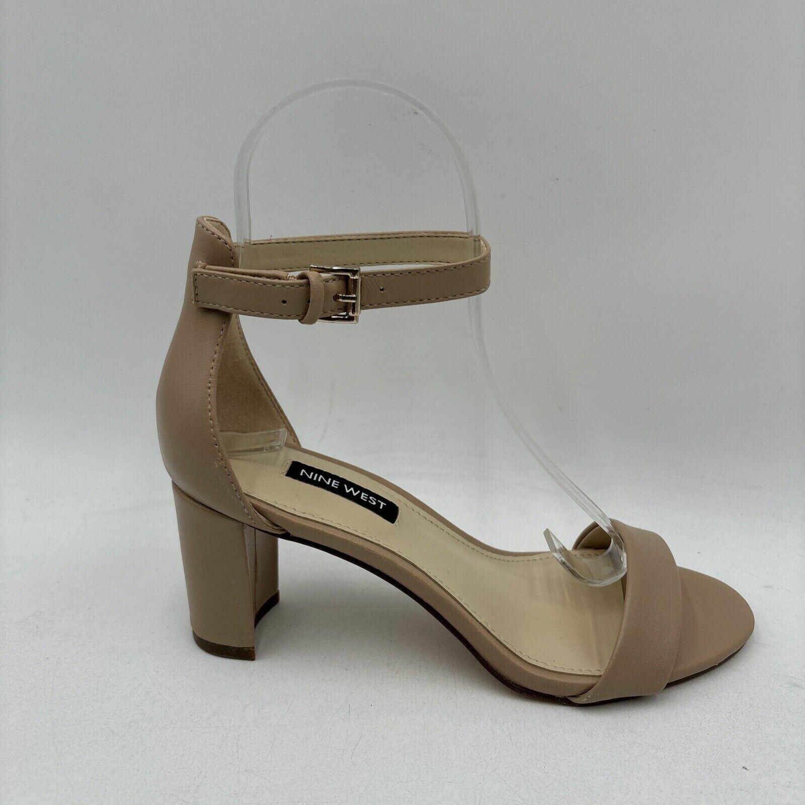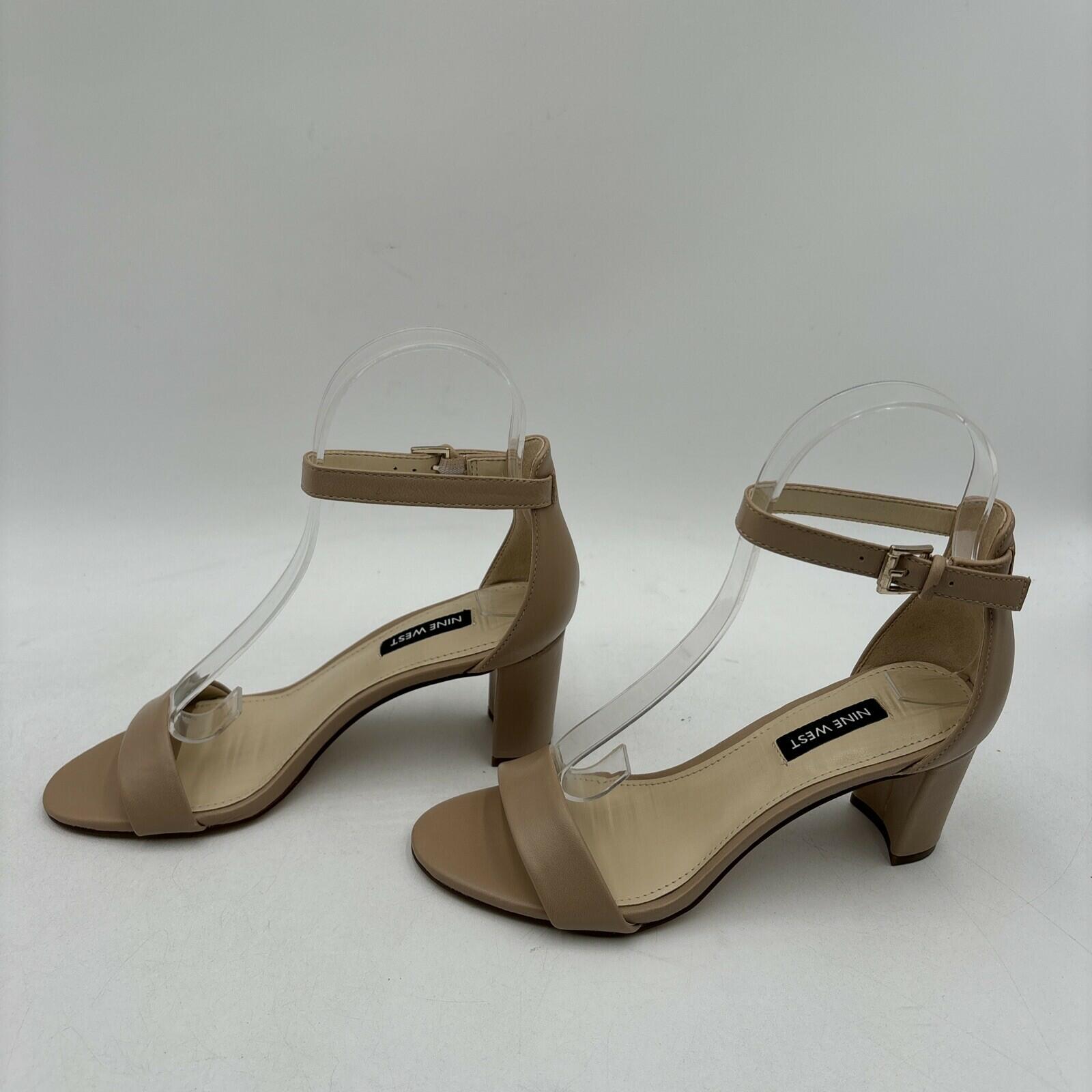 Nine West PRUCE Beige Leather Open Toe Block Heel Ankle Strap Sandals, Size 5.5M - Very Good