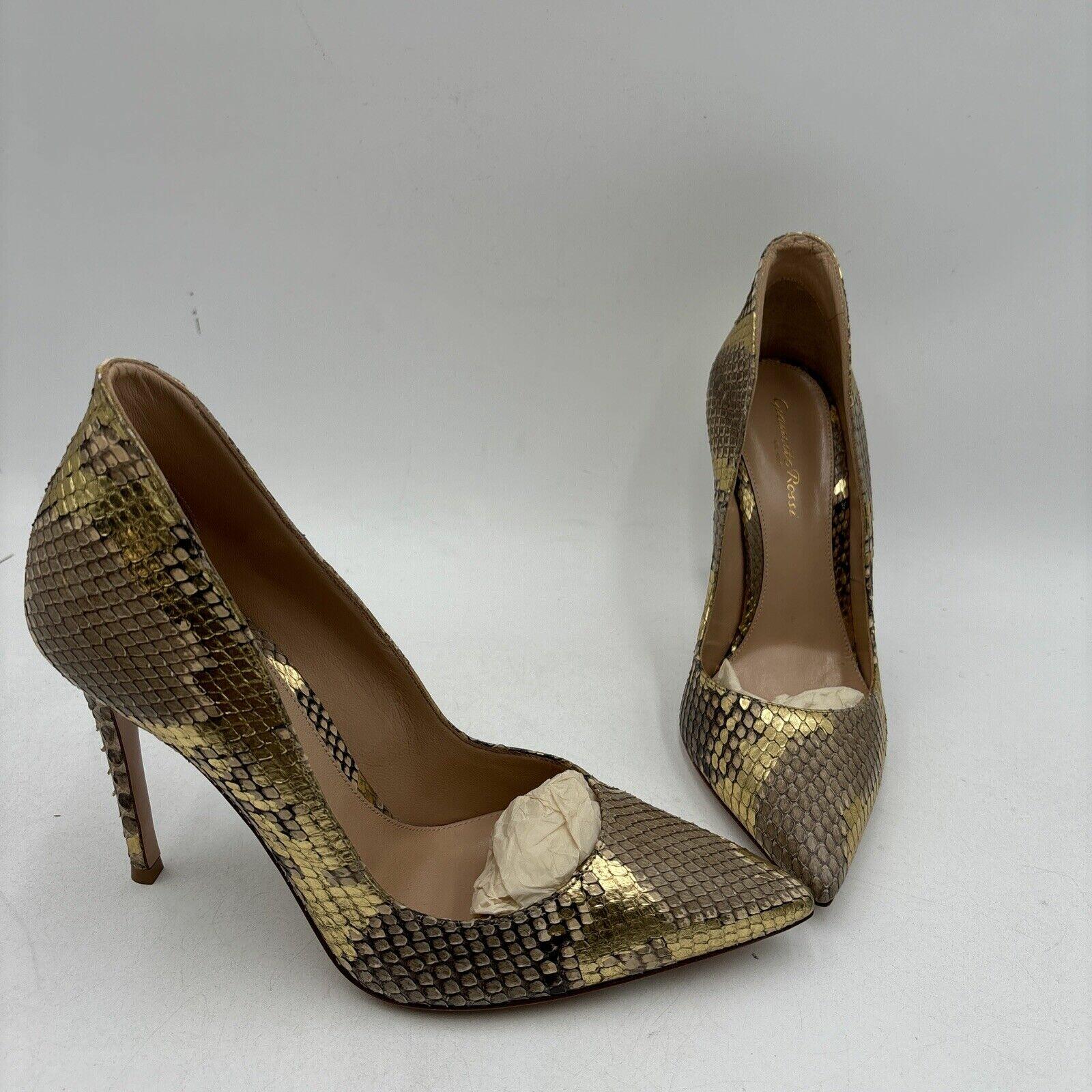 The product is a stunning pair of Gianvito Rossi high heels in a luxurious gold metallic python leather. These slip-on pumps feature a pointed toe design with a stiletto heel measuring between 3 to 3.9 inches high, adding a touch of elegance and sophistication to any outfit. The shoes are designed for women in size 38.5, offering comfort and style with a trendy animal print pattern and a metal-themed detailing. Made from high-quality leather, these heels are a chic and fashionable choice for any special occasion or formal event.