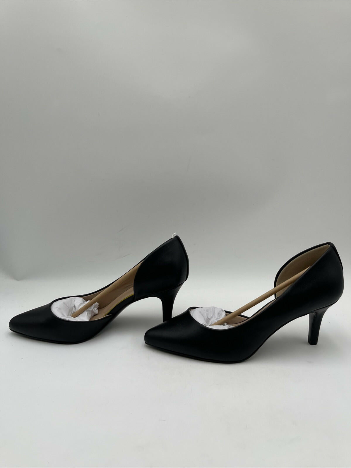 The NWB Kelly & Katie Satela Pumps in Black are women's heels featuring a pointed toe and a comfortable leather upper material. This pair comes in a US shoe size 7 and an EU shoe size 37.5, suitable for a stylish and classic look. The pumps are designed by the brand Kelly & Katie with a city theme, making them a versatile choice for various occasions.