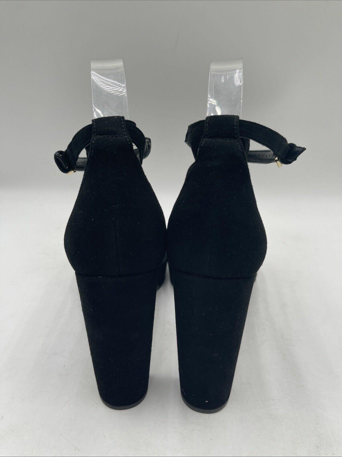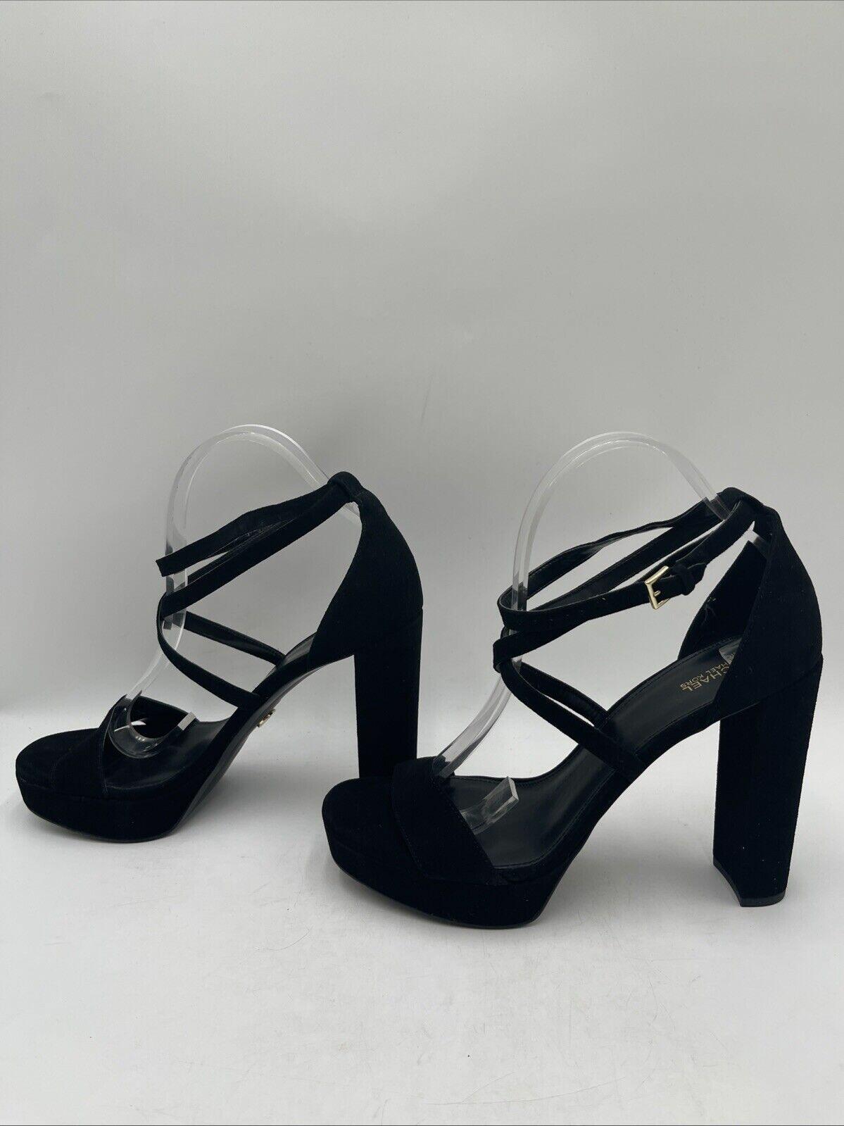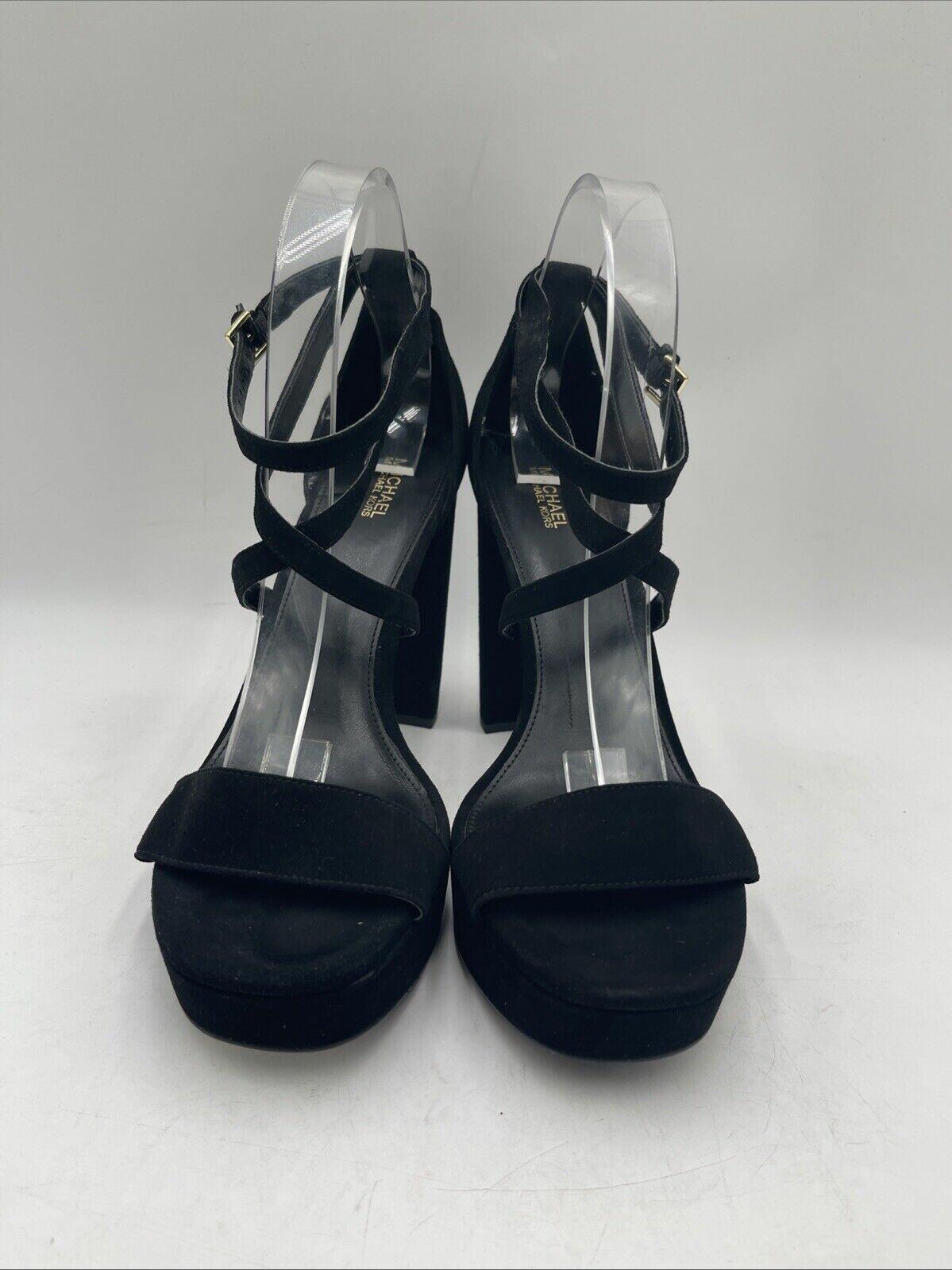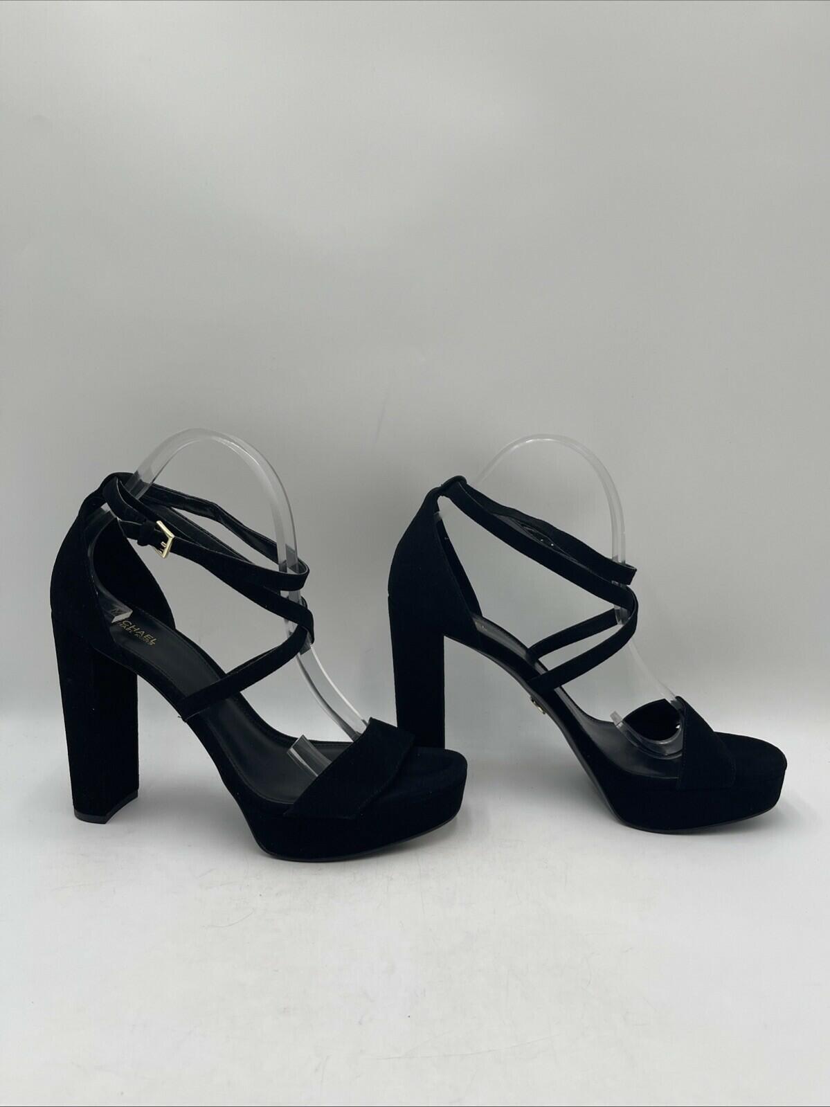 Elevate your style with these stunning Michael Kors Charlize platform heels. Designed with a sleek black suede upper and a chunky block heel, these heels are perfect for any occasion, from a day at the office to a night out on the town. The ankle strap and open-toe design add a touch of elegance, while the ultra-high heel height provides a comfortable fit.