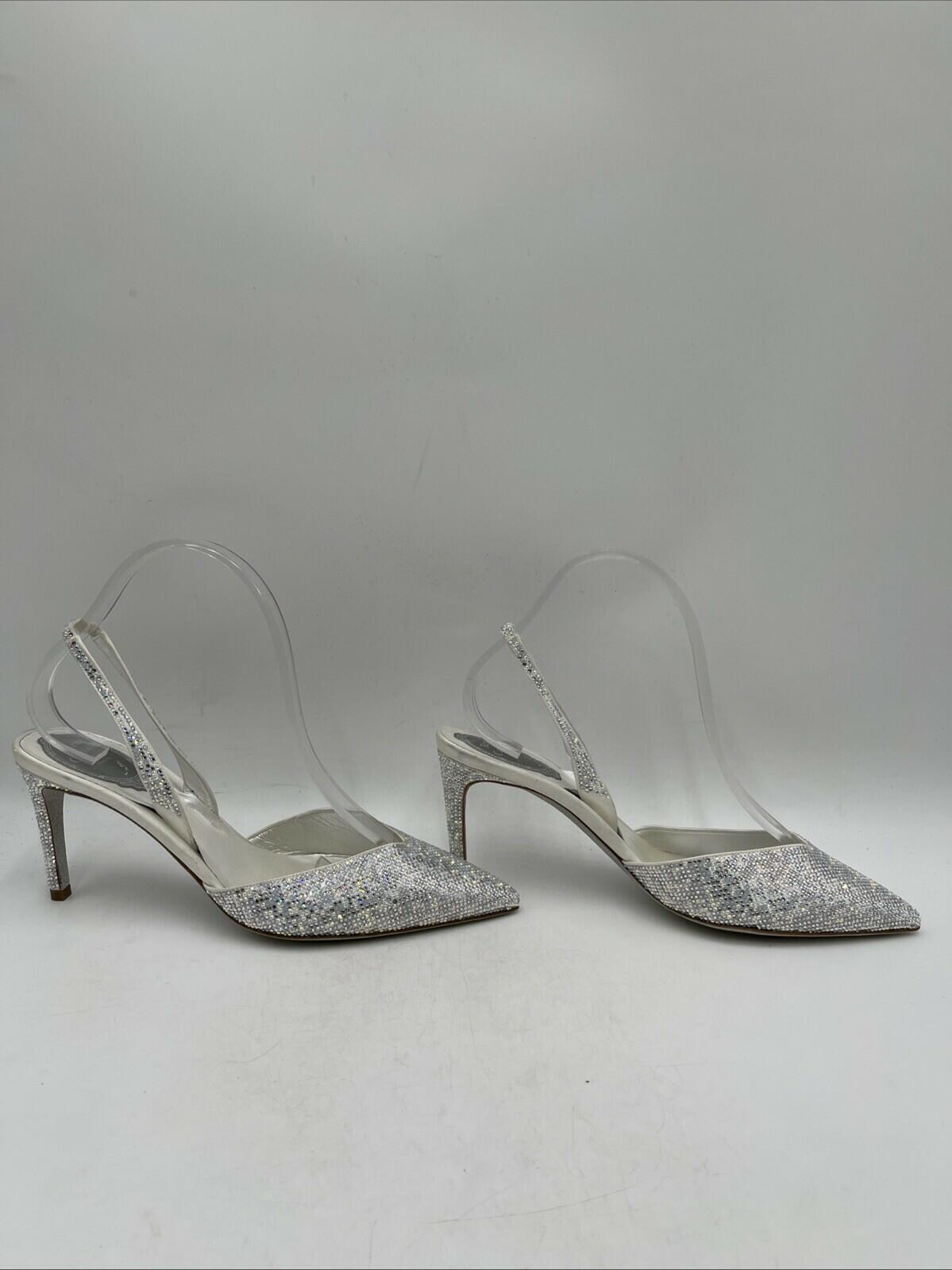 René Caovilla Embellished Crystal Pumps Crystal Slingback Silver Size 39.5 - Very Good - Ufashion