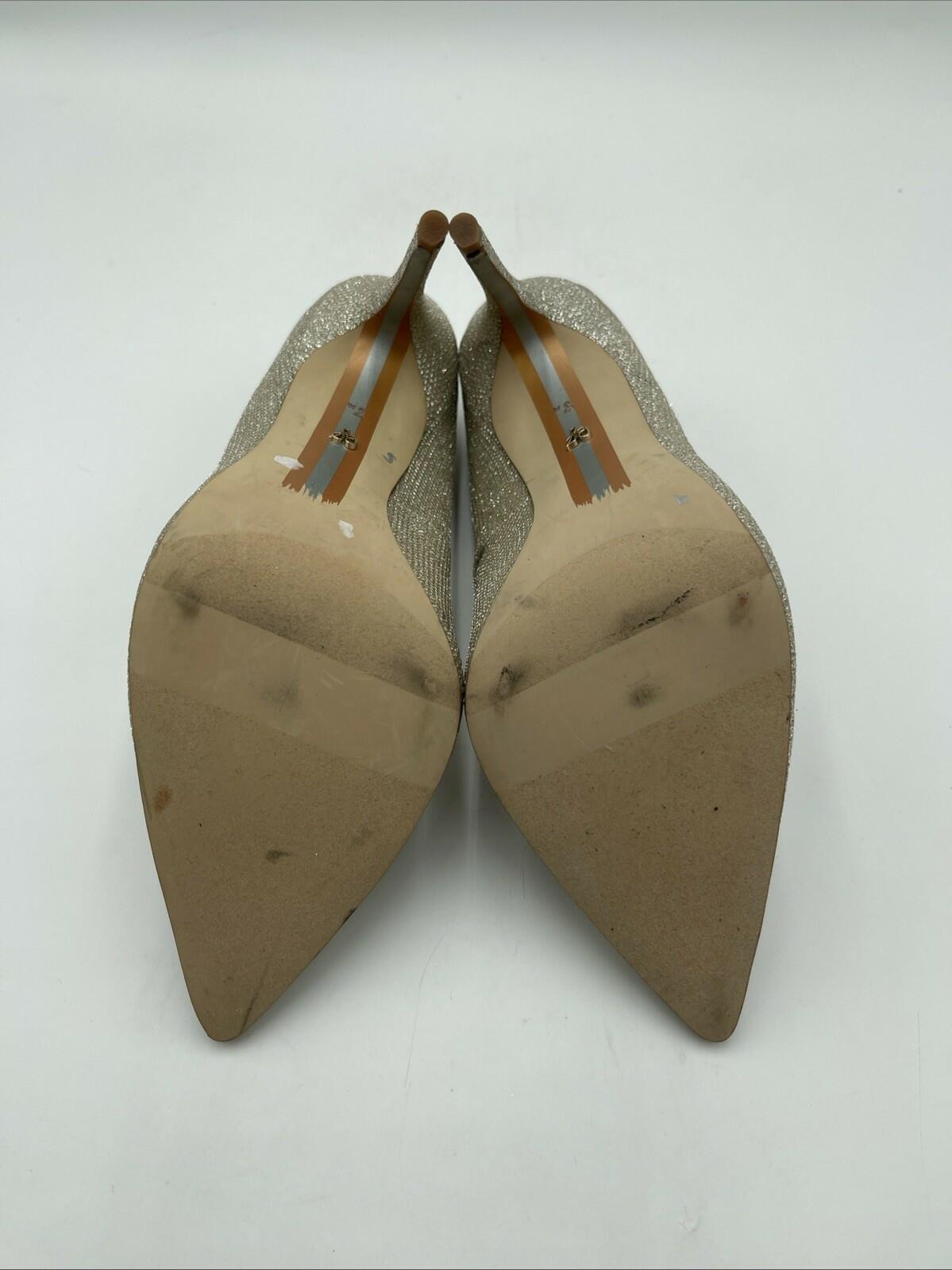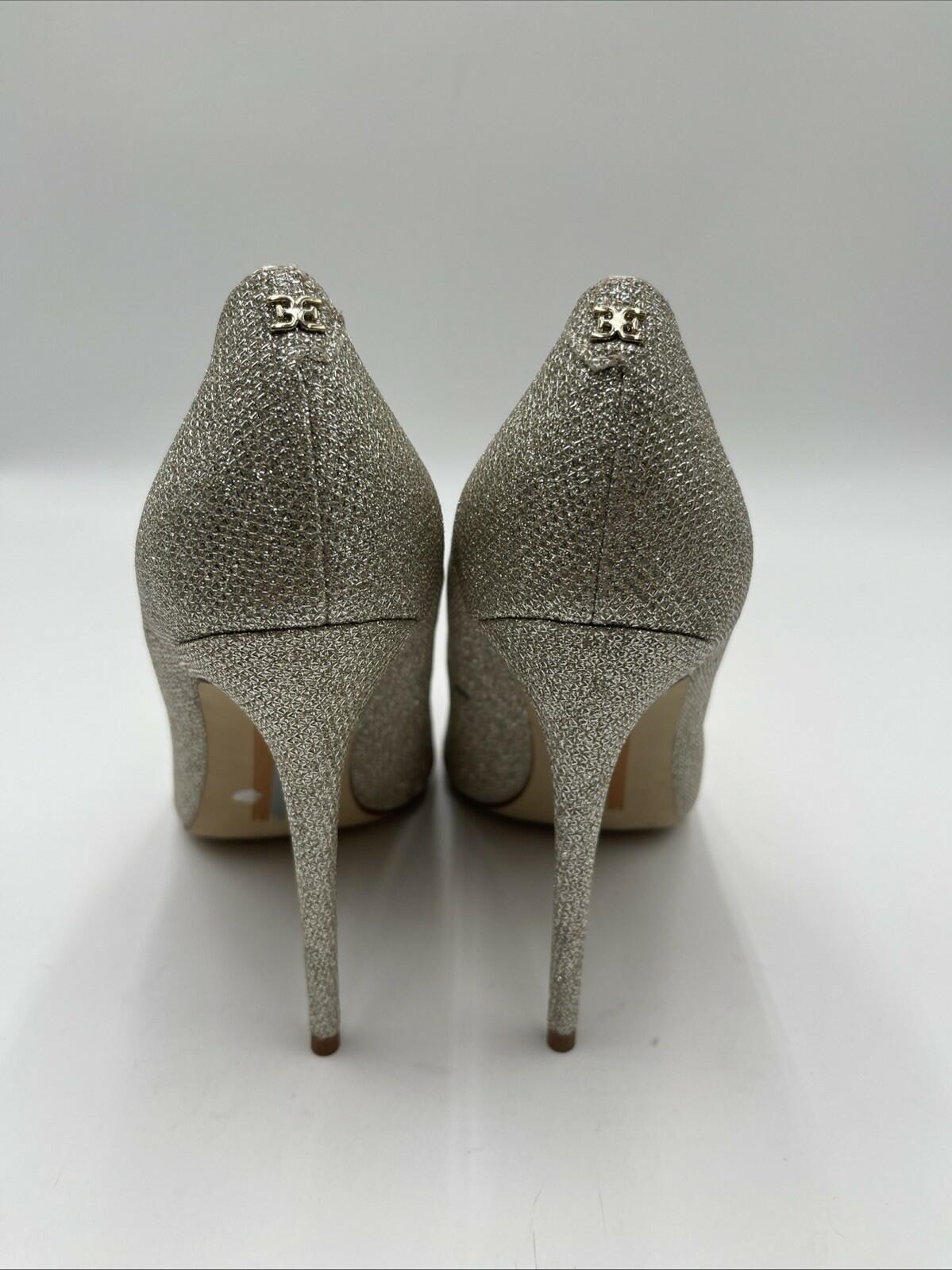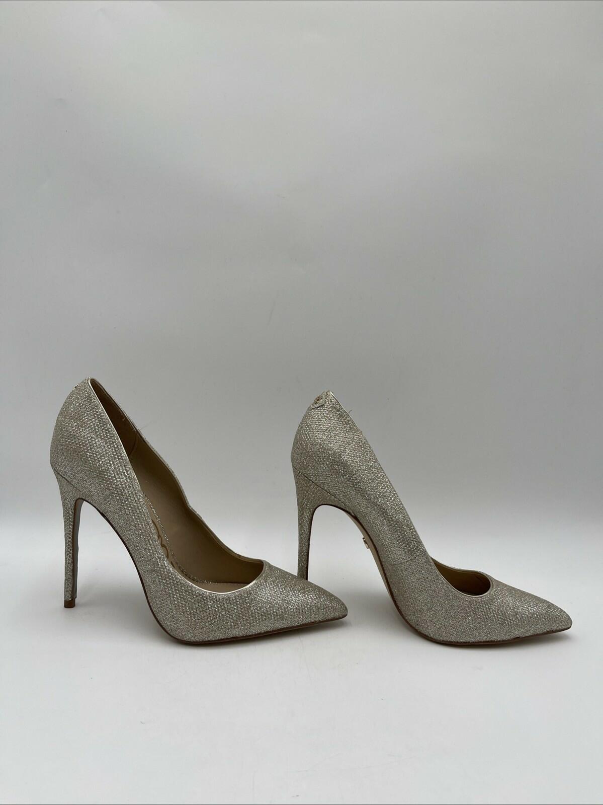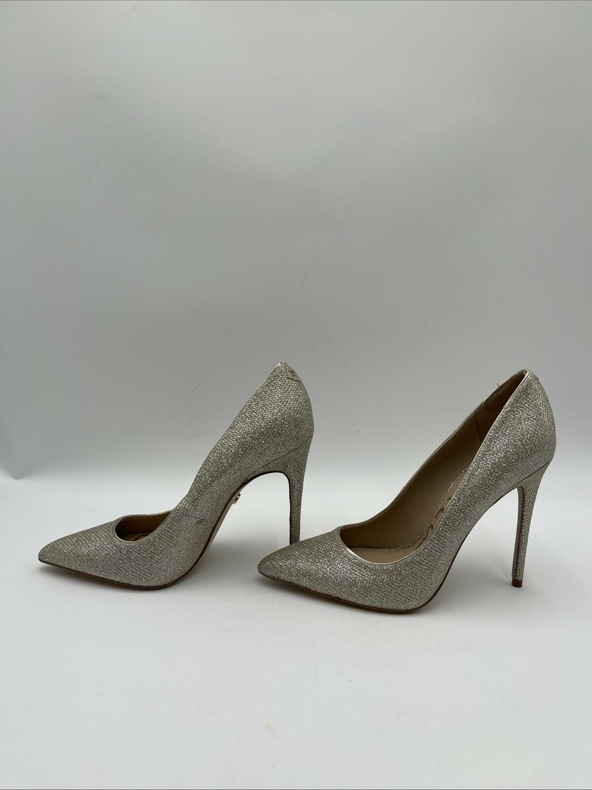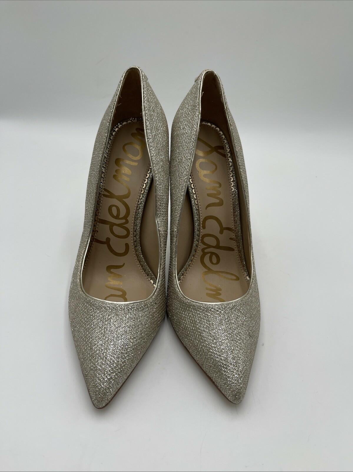 -Bottoms are barely wornStep up your shoe game with these stunning Sam Edelman Hazel pumps. The polka dot pattern and gold color add a touch of sophistication to any outfit, while the pointed toe and ultra high stiletto heel create a chic silhouette. These pumps are made with both textile and leather, providing both durability and comfort.
