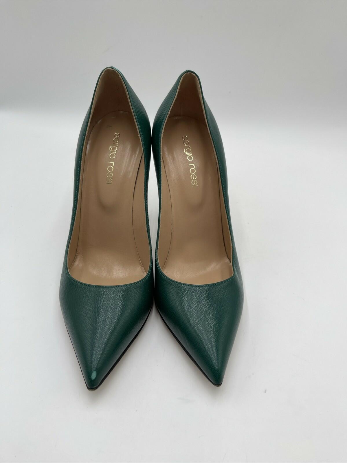 -Barley wornAdd a touch of sophistication to your wardrobe with these elegant Sergio Rossi GODIVA pumps. Crafted from premium quality leather, these stiletto heels feature a pointed toe design and slip-on style for a comfortable fit. The vibrant green color and sleek design make them perfect for any occasion, whether it's a formal event or a night out with friends.