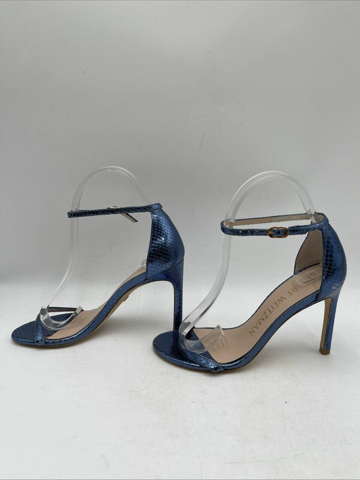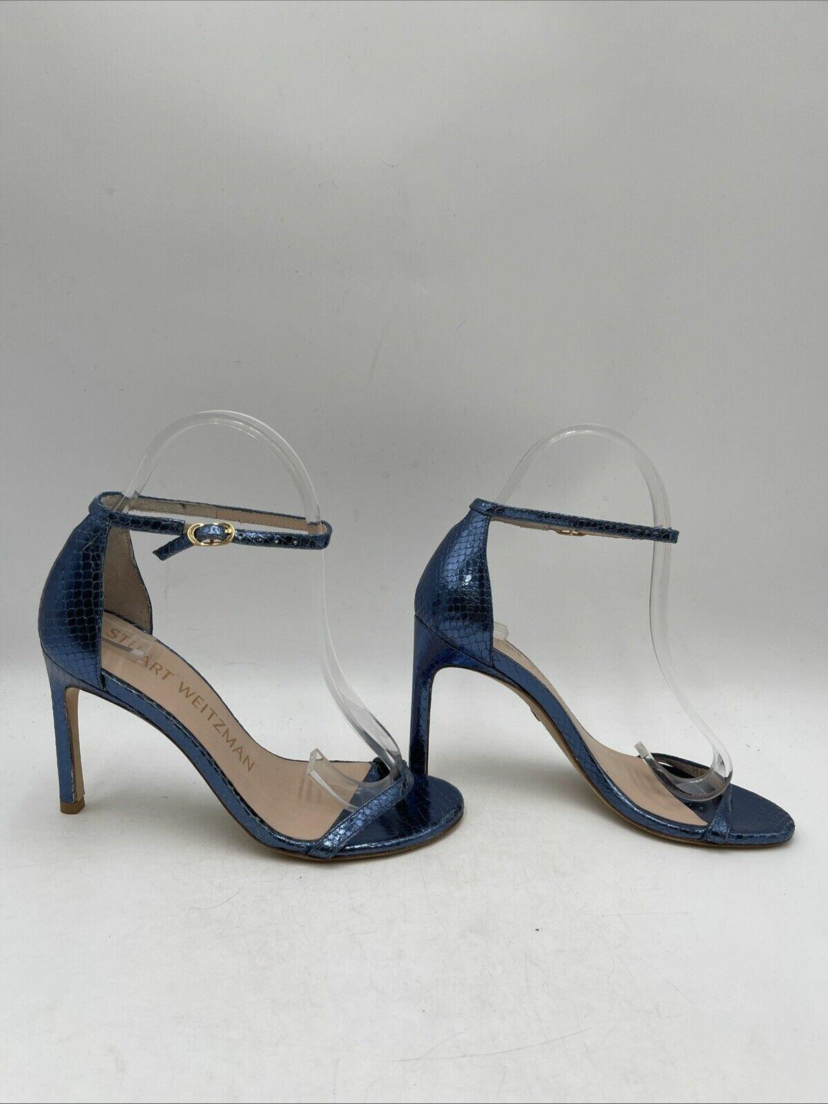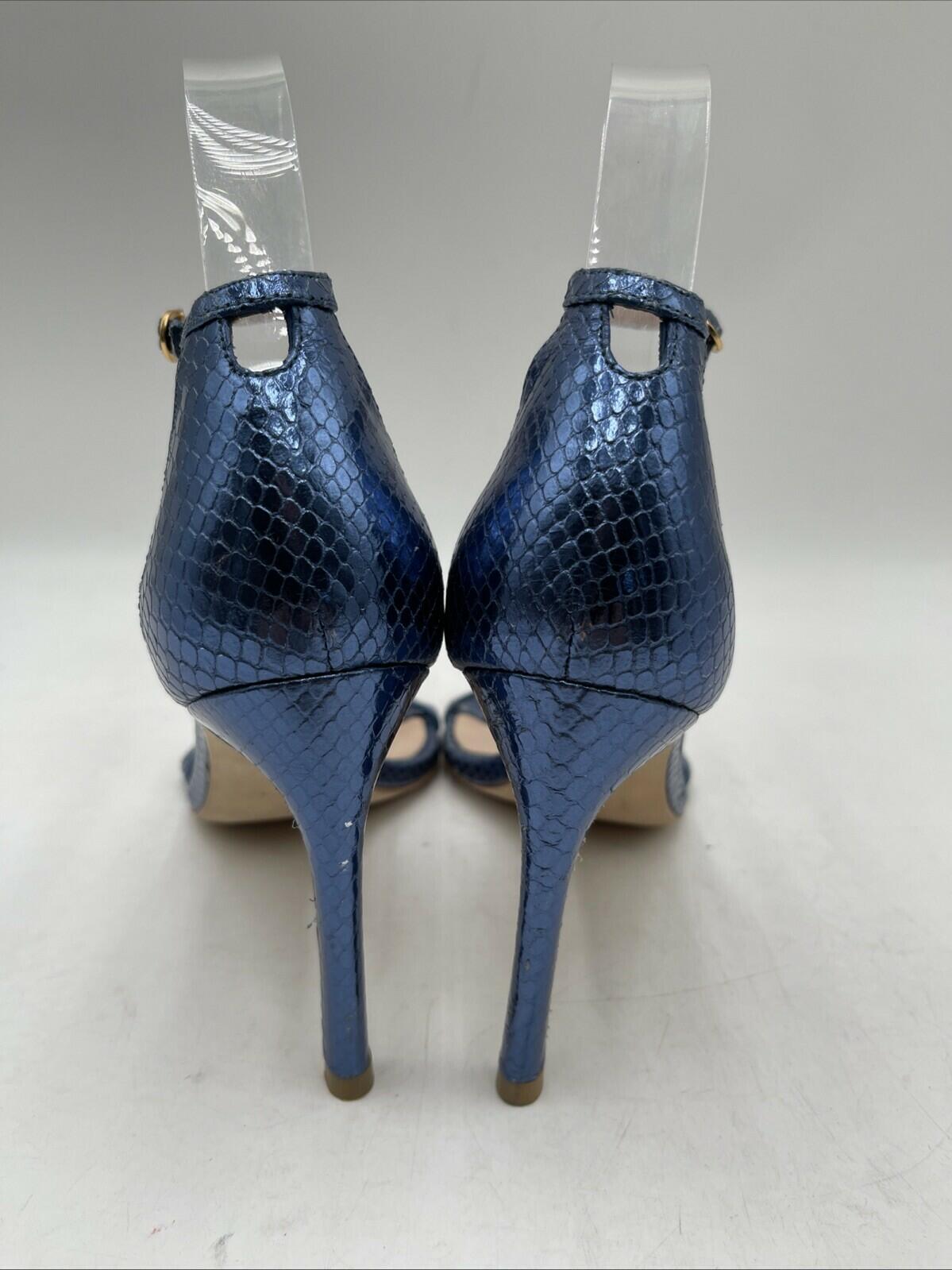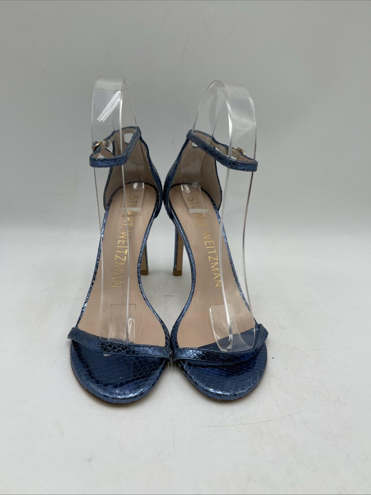 Stuart Weitzman Blue Snake Print Leather Open Toe Ankle Strap High Heels Size 5M - Very Good