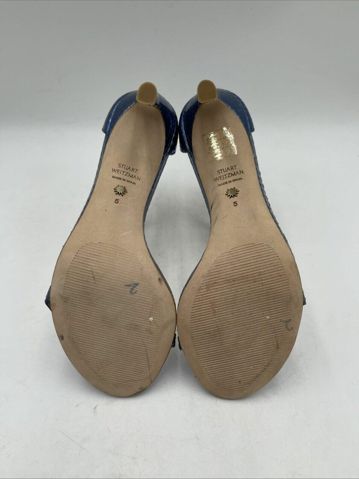 -Bottoms are barely wornThe Stuart Weitzman Blue Snake Print Leather Open Toe Ankle Strap High Heels in size 5M feature a bold animal print design with an ultra-high stiletto heel, making them a statement piece for any outfit. The open toe style and adjustable ankle strap provide a comfortable and secure fit, while the leather lining and insole add a touch of luxury to the design. These pumps are stylish and sophisticated, perfect for adding a pop of color and texture to any ensemble. Made in Spain by the renowned brand Stuart Weitzman, these heels are a chic addition to any woman's shoe collection.
