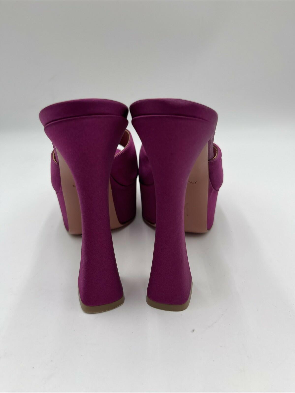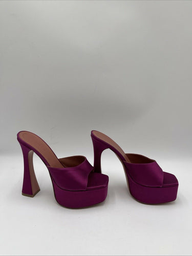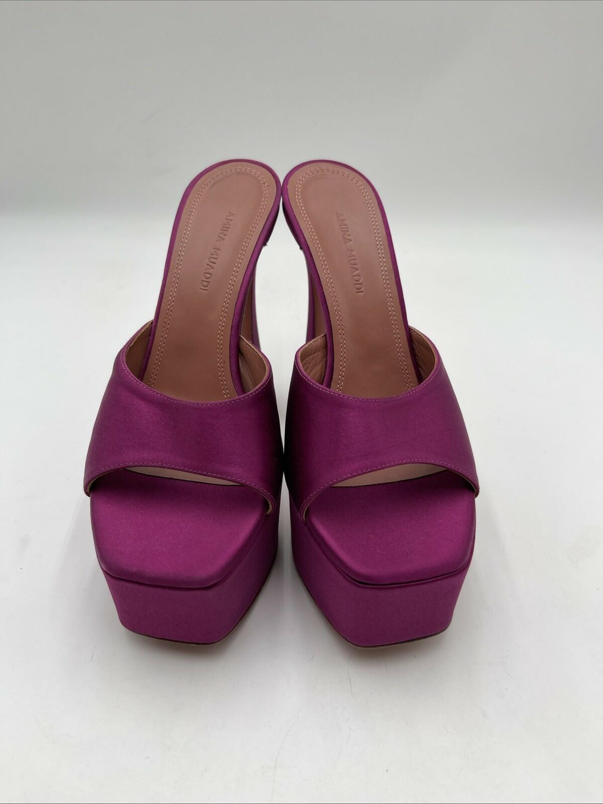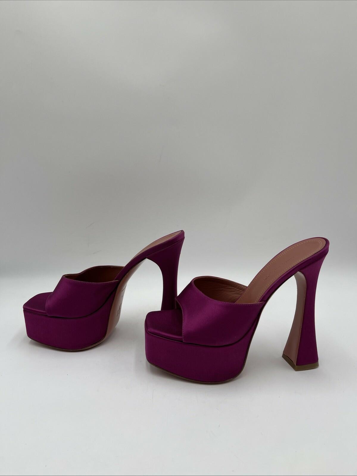 -Bottoms are barely wornThese stunning slip on heel from Amina Muaddi are perfect for any occasion. The sleek purple satin material is complemented by the unique open toe design. These shoes feature a ultra high stiletto heel that will instantly elevate any outfit.
