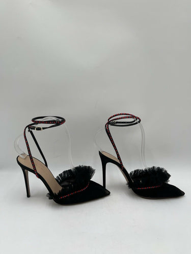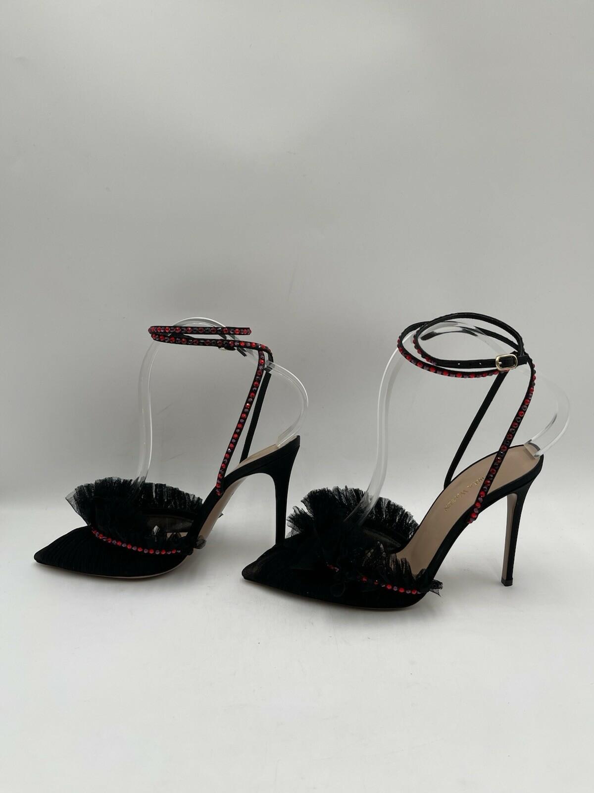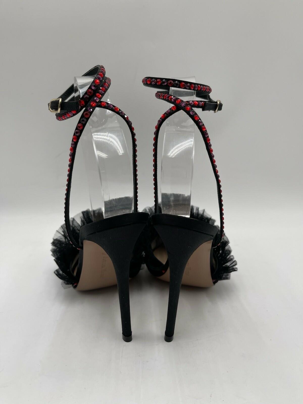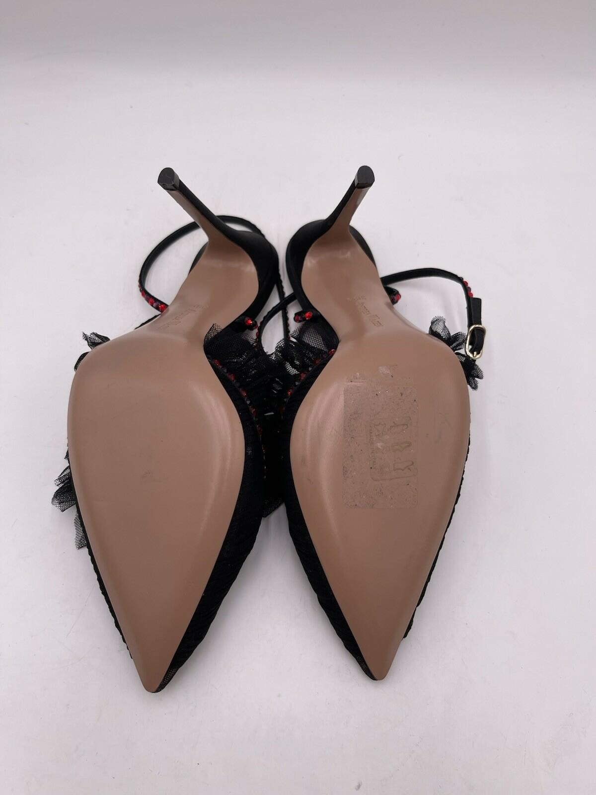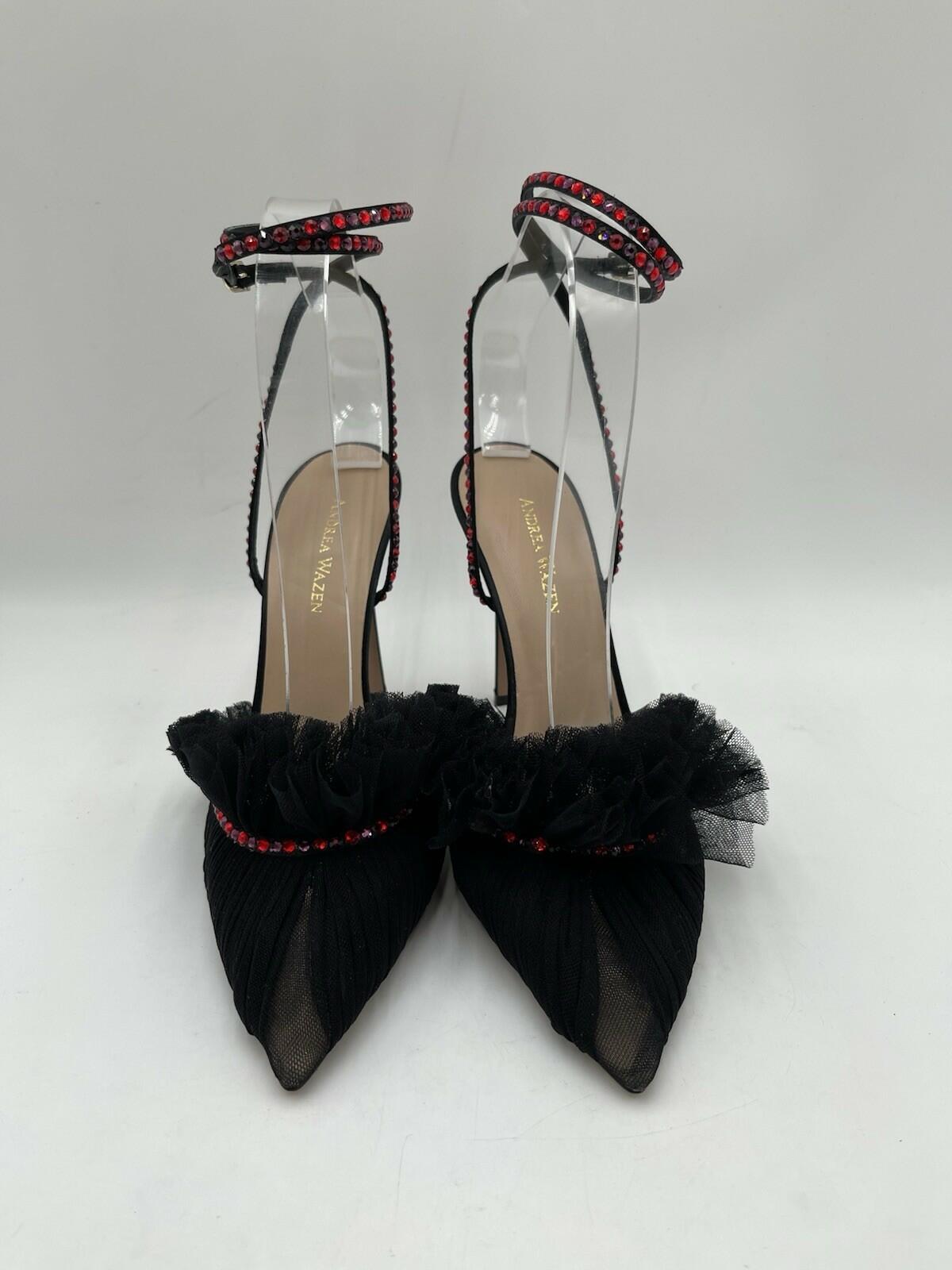-Bottoms are barely wornElevate your style with these stunning Andrea Wazen Franca Glit Crystal Pumps. The black textile upper material and solid pattern make them perfect for any occasion, while the pointed toe and ultra high heel height add a touch of sophistication. The ankle strap and buckle closure provide comfort and support, making them perfect for a long day at work or a night out on the town.