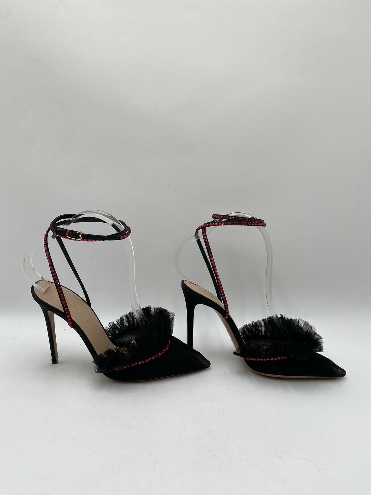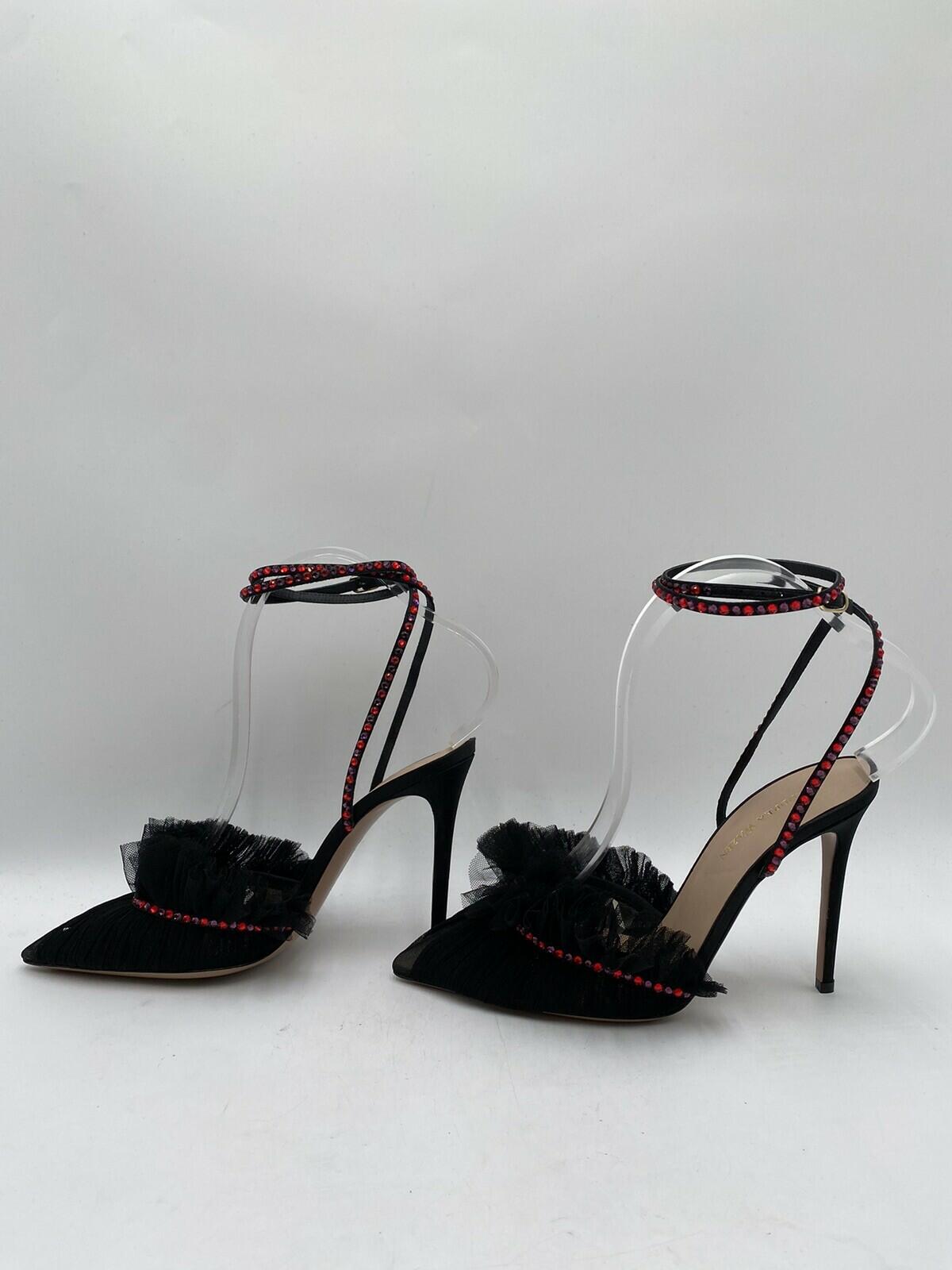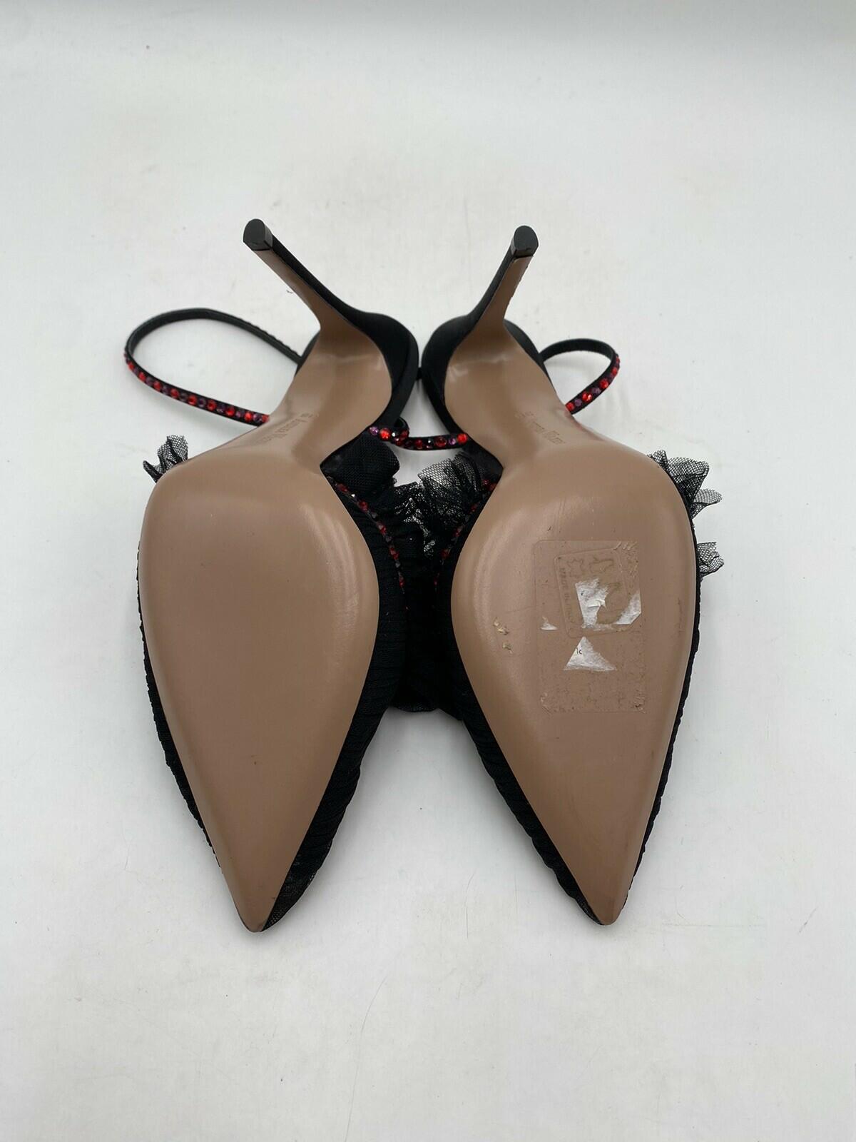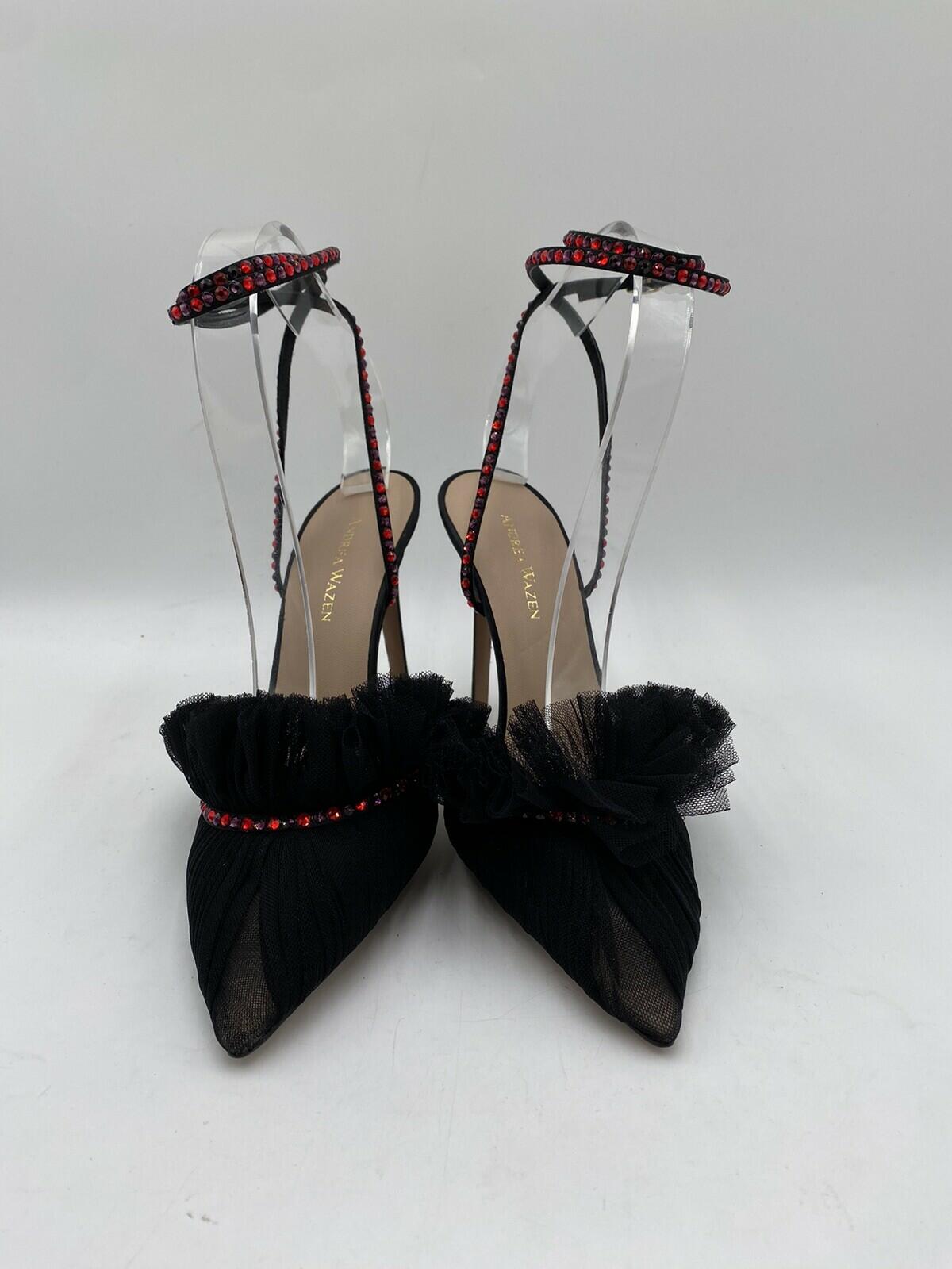 -Bottoms are barely wornStep out in style with the Andrea Wazen Franca Glit Crystal Pumps, a sophisticated choice for any fashion-forward wardrobe. These black heels boast an ultra-high pointed toe design, perfect for elevating your look with a touch of glamour. The textile upper ensures a comfortable fit, while the ankle strap buckle provides a secure feel, making them ideal for both daytime and evening wear.
