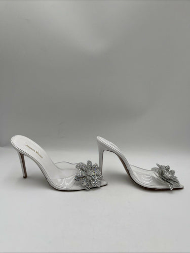 Step out in style with these chic Andrea Wazen mules, perfect for any going-out occasion. These white mules feature PVC crystal embellishments for a touch of glamour, and a slip-on design for easy wear. The pointed toe and ultra-high stiletto heel add a touch of sophistication, while the lightweight design ensures comfort all night long.