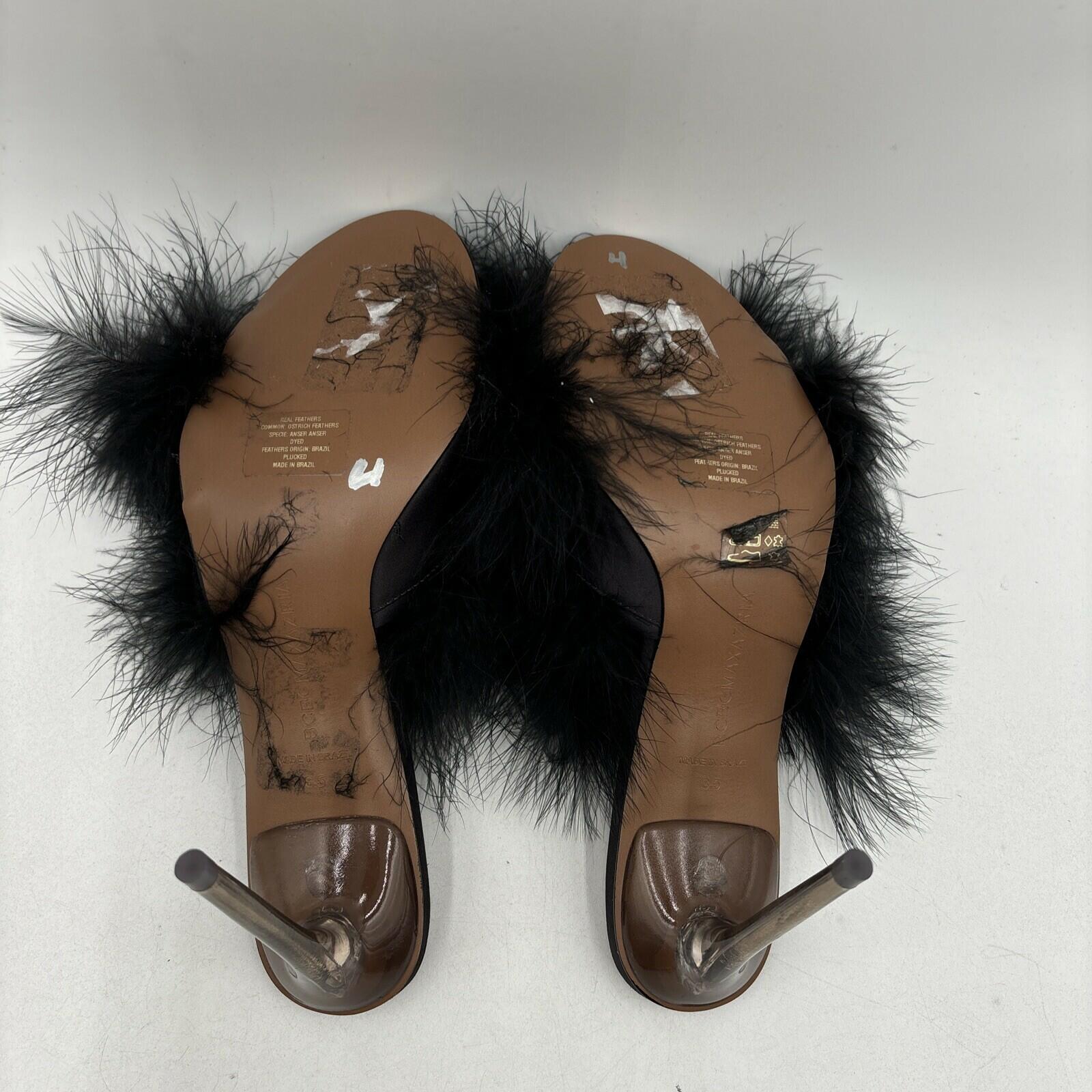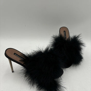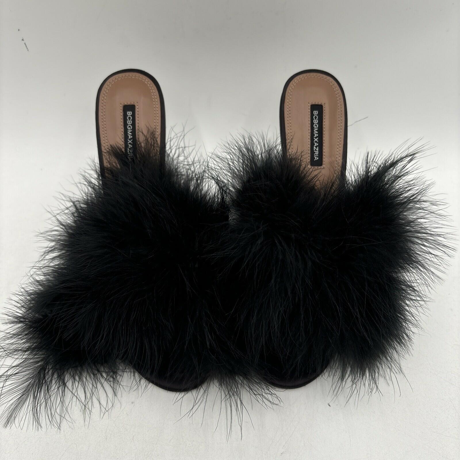 The women's BCBMaxazria Dennika sandal in black is a stylish and sleek choice for the fashion-forward individual. Featuring a slip-on closure and a stiletto heel style, these ultra-high heels are designed for a bold and confident look. The upper material is synthetic, and the sandal is adorned with logo accents, adding a touch of sophistication to the overall design. Perfect for a night out or special occasions, these sandals in size 8.5 offer a modern and chic option for any woman's wardrobe.Upper material is in good condition. Insoles are in good condition. Bottom soles are in good condition some with sticker residue.