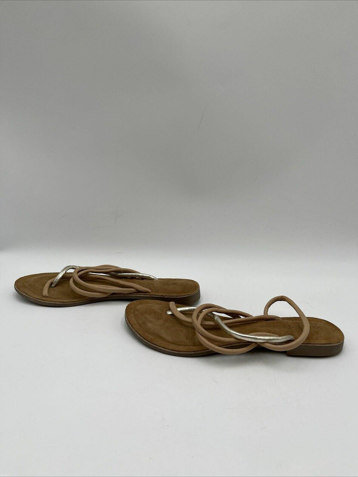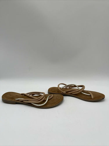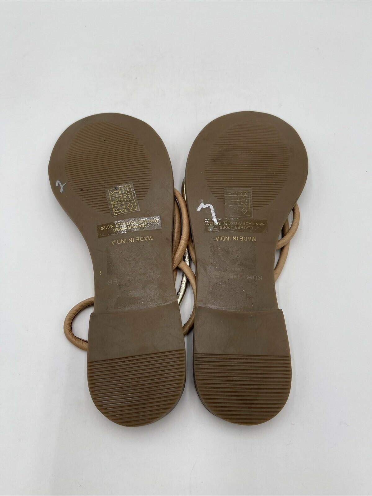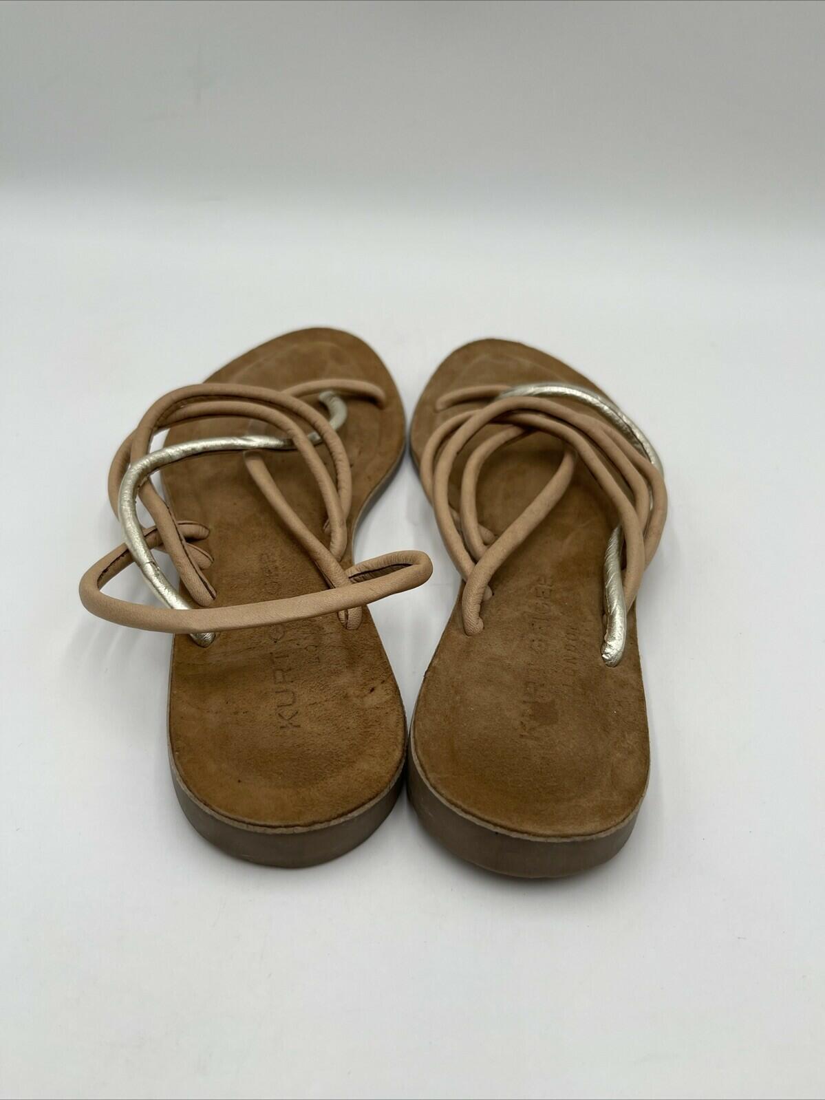 -Bottoms are lightly worn and have sticker residueThe Kurt Geiger London Maria sandals are the perfect addition to your summer wardrobe. These brown leather toe-thong sandals are designed with a solid pattern and feature the brand's signature logo accents. The slip-on style and flat block heel make them incredibly comfortable and suitable for all-day wear.