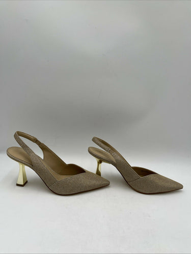 This is a pair of women's Michael Kors Chelsea Camel Slingback Pumps in a luxurious gold color. The shoes feature a pointed toe shape, slip-on closure, and a high stiletto heel measuring between 3-3.9 inches. They are crafted from textile material and offer comfort with a solid pattern design. These stylish slingback pumps are size 8.5 and are adorned with a metal theme, making them a fashionable choice for any formal or dressy occasion.