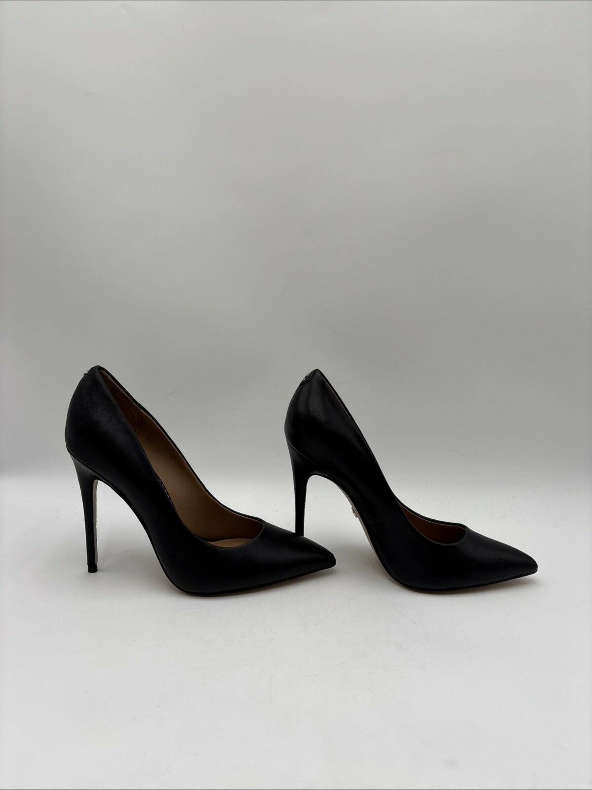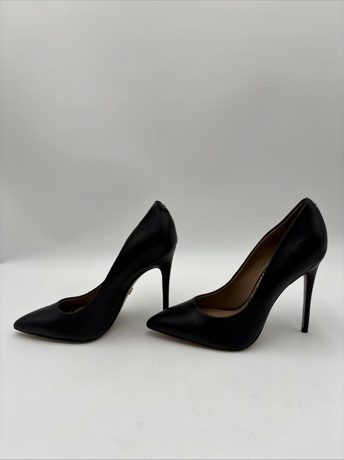 -Bottoms are lightly wornElevate your style with these stunning black leather pumps from Sam Edelman. Featuring a pointed toe and ultra-high stiletto heel, these heels are perfect for a night out. The slip-on style and comfortable features make them suitable for all-day wear.