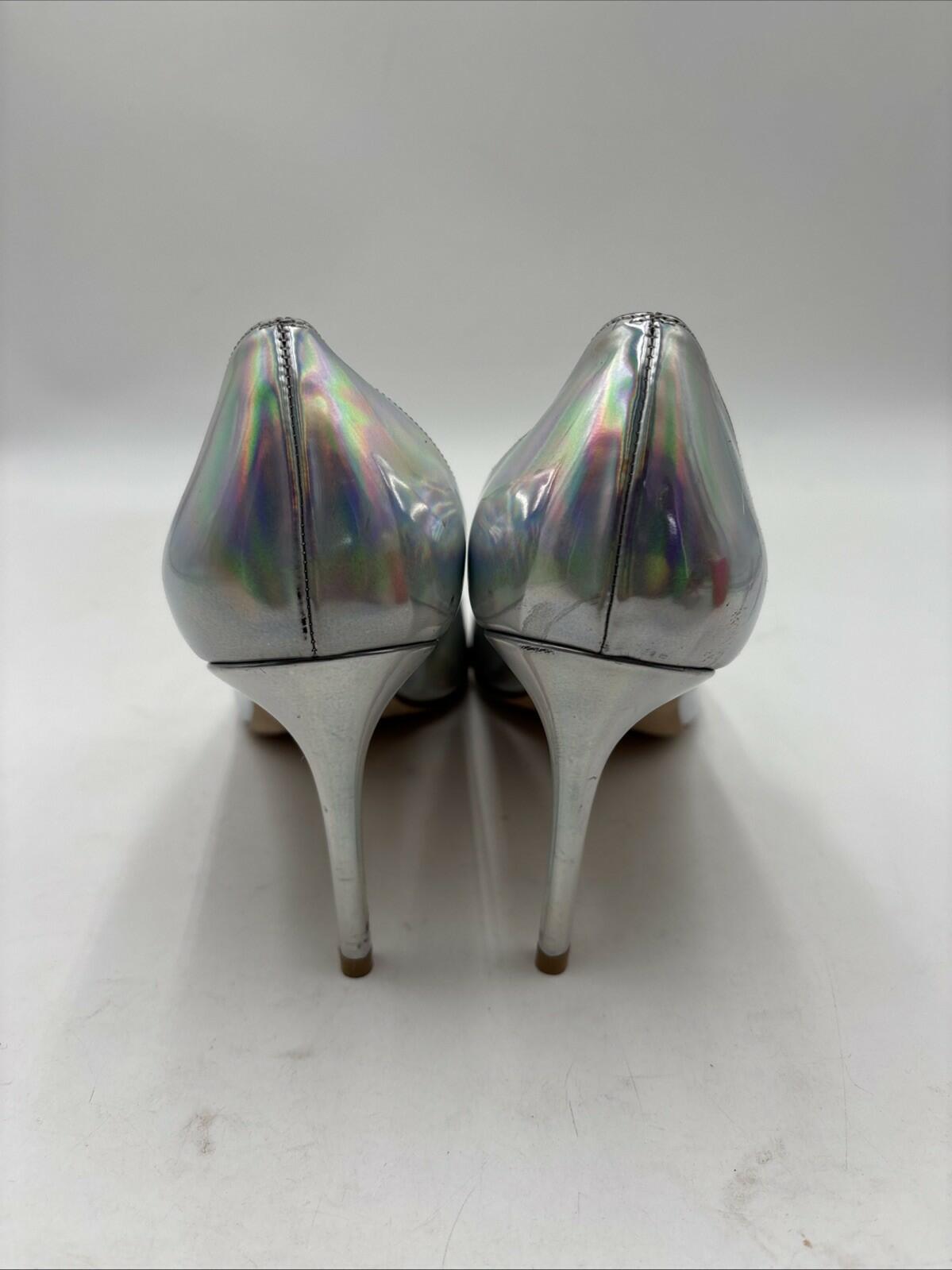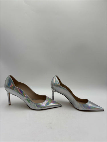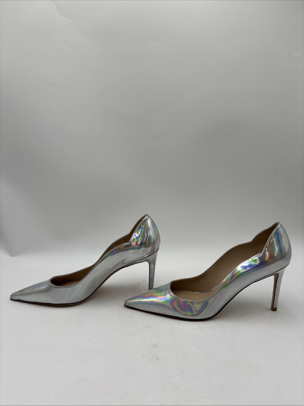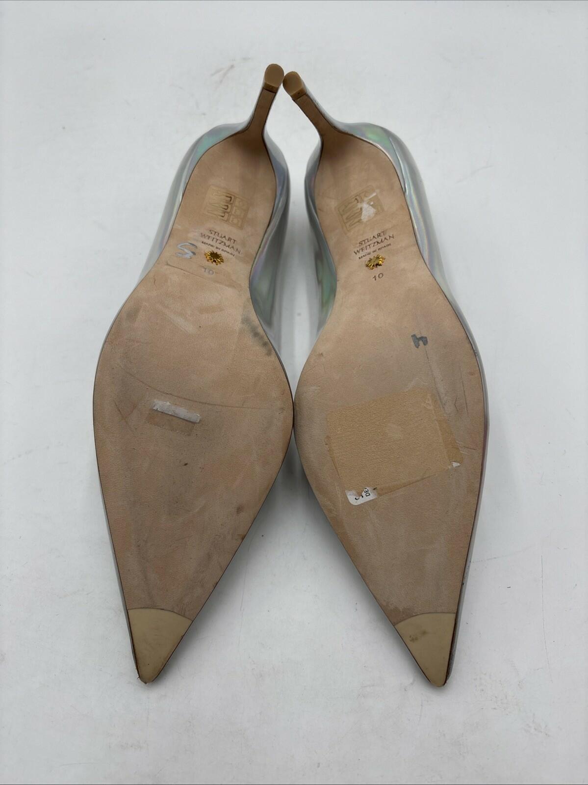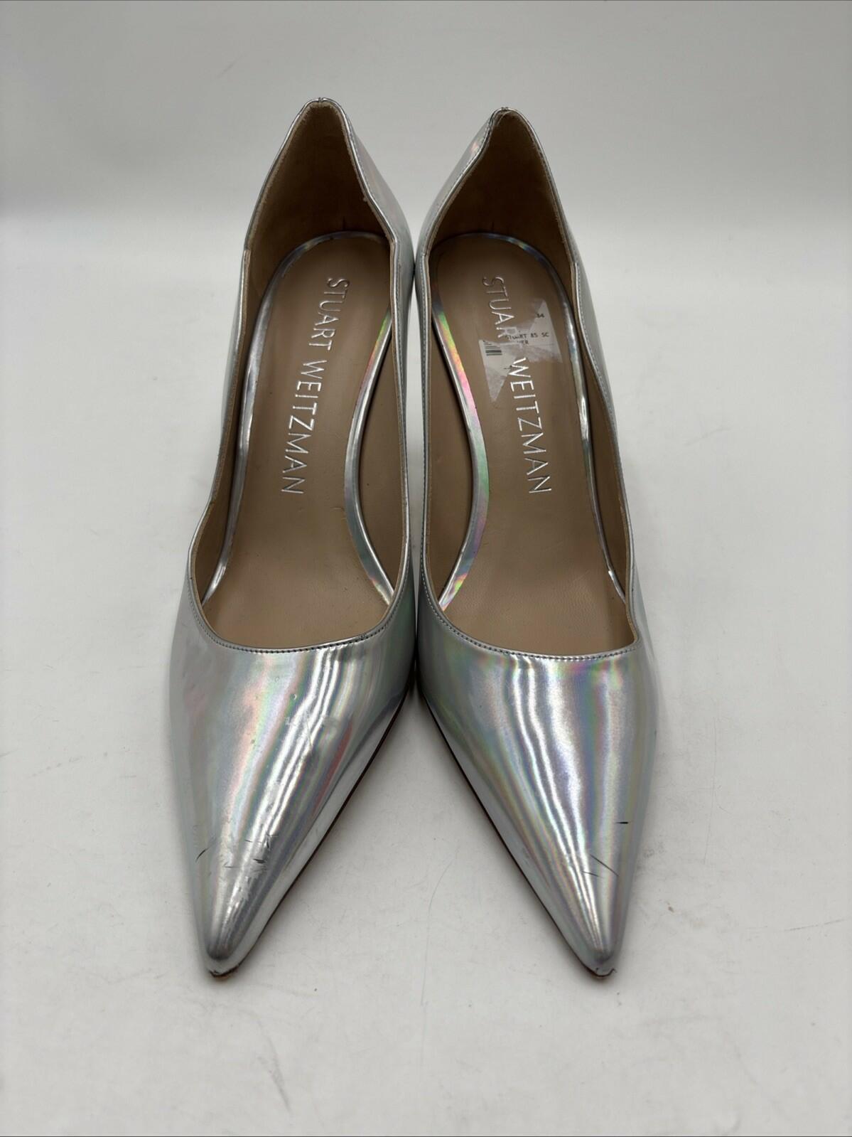 -Bottoms are showing signs of light wearThese stunning silver pumps from Stuart Weitzman are sure to make a statement. With a sleek pointed toe and high stiletto heel, these shoes are perfect for any formal occasion. The patent leather upper material adds a touch of elegance, while the scalloped accents provide a unique and eye-catching detail. These pumps are available in size 10B/40.5 and are perfect for women who want to make a sophisticated impression.