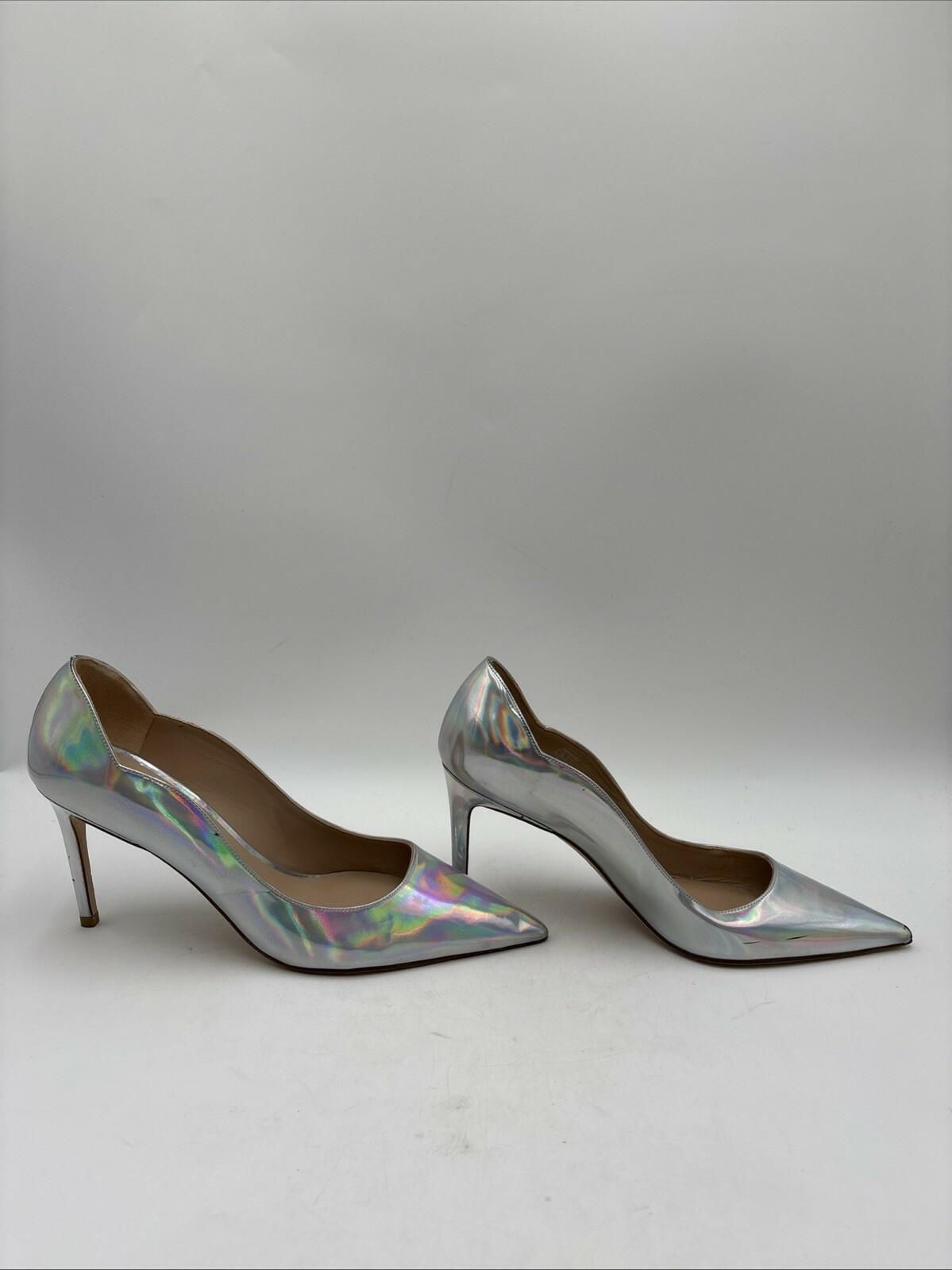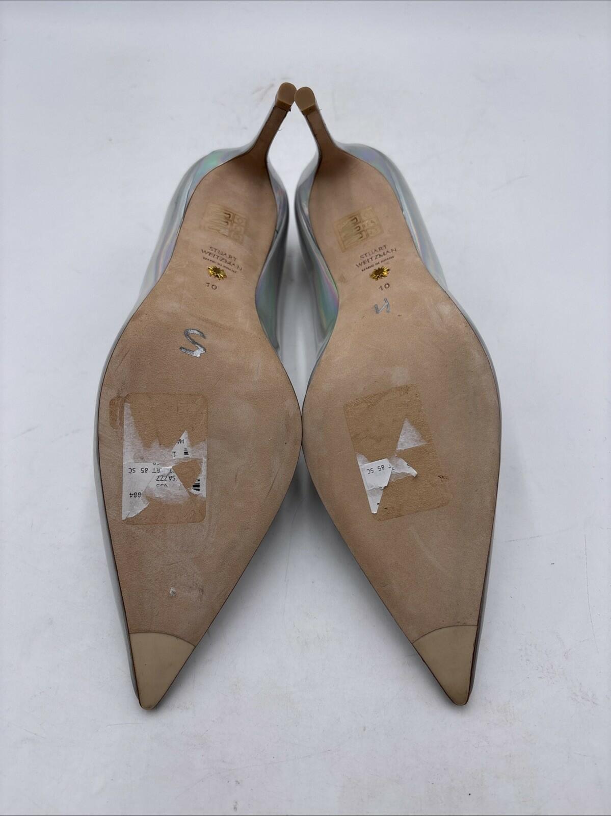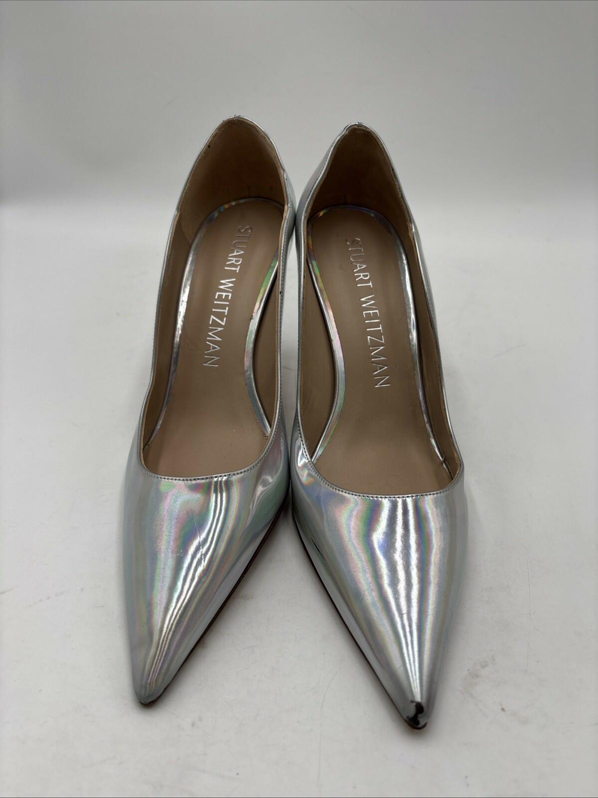 -Bottoms show signs of light wear and has sticker residueThese women's pumps from Stuart Weitzman are sure to make a statement. The silver patent leather material and pointed toe design give these shoes a modern and chic look. The slip-on style and stiletto heel make them comfortable and easy to wear. The shoes feature a solid pattern and scalloped accents, adding a touch of elegance to any outfit. These shoes are a size 10B/40.5 and have a high heel of 3-3.9 inches. Perfect for any occasion, these pumps will be a great addition to any wardrobe.