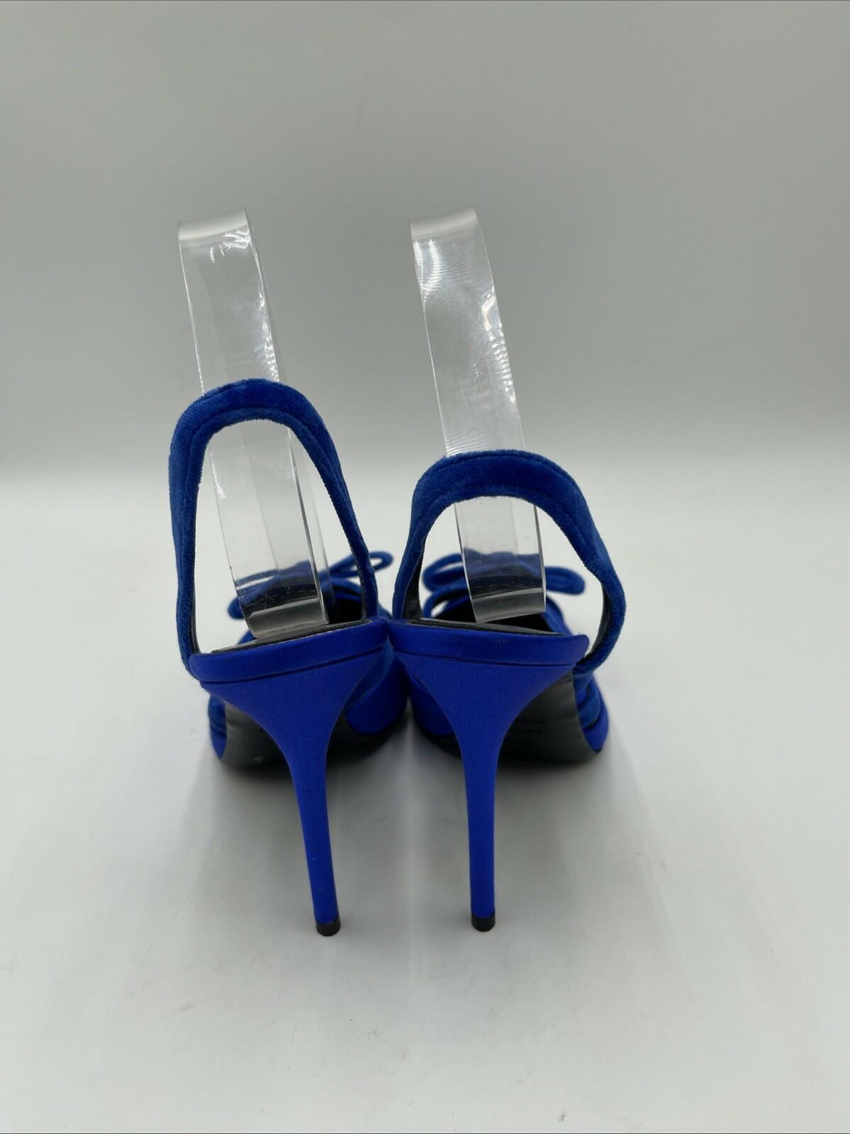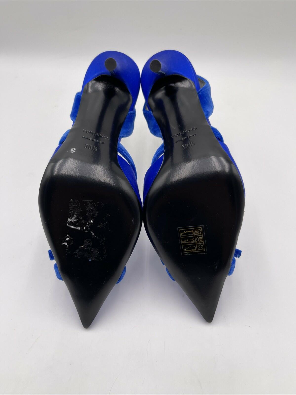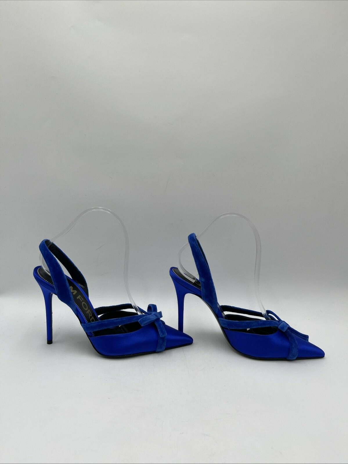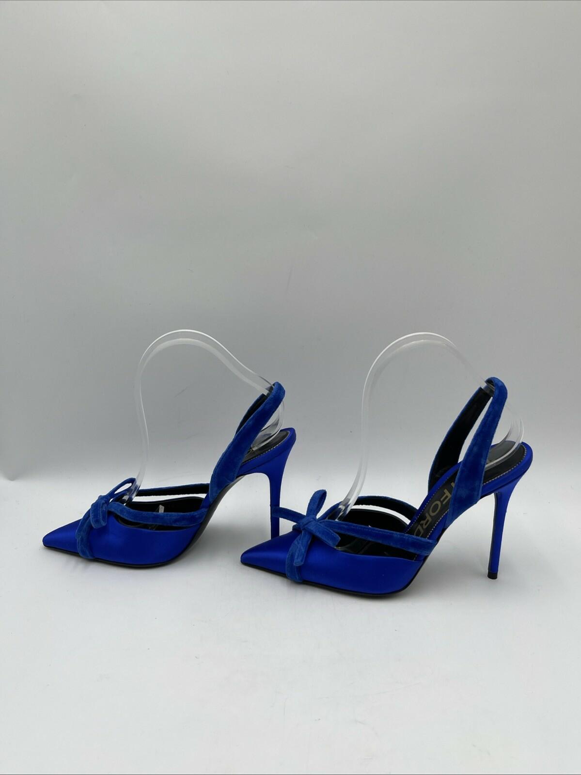 Elevate your style with these stunning Tom Ford satin slingback pumps. The pointed toe and ultra-high stiletto heel add an elegant touch to any outfit, while the beautiful blue color makes a statement all on its own. The slip-on design with a bow accent and solid pattern is perfect for a night out or a special occasion.