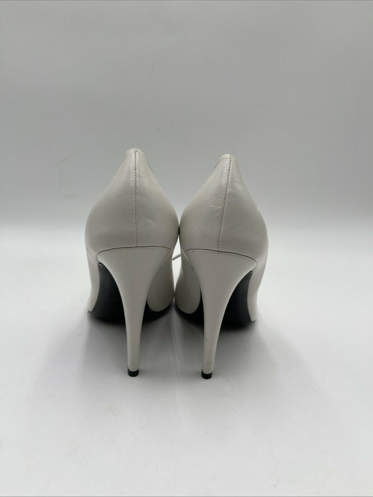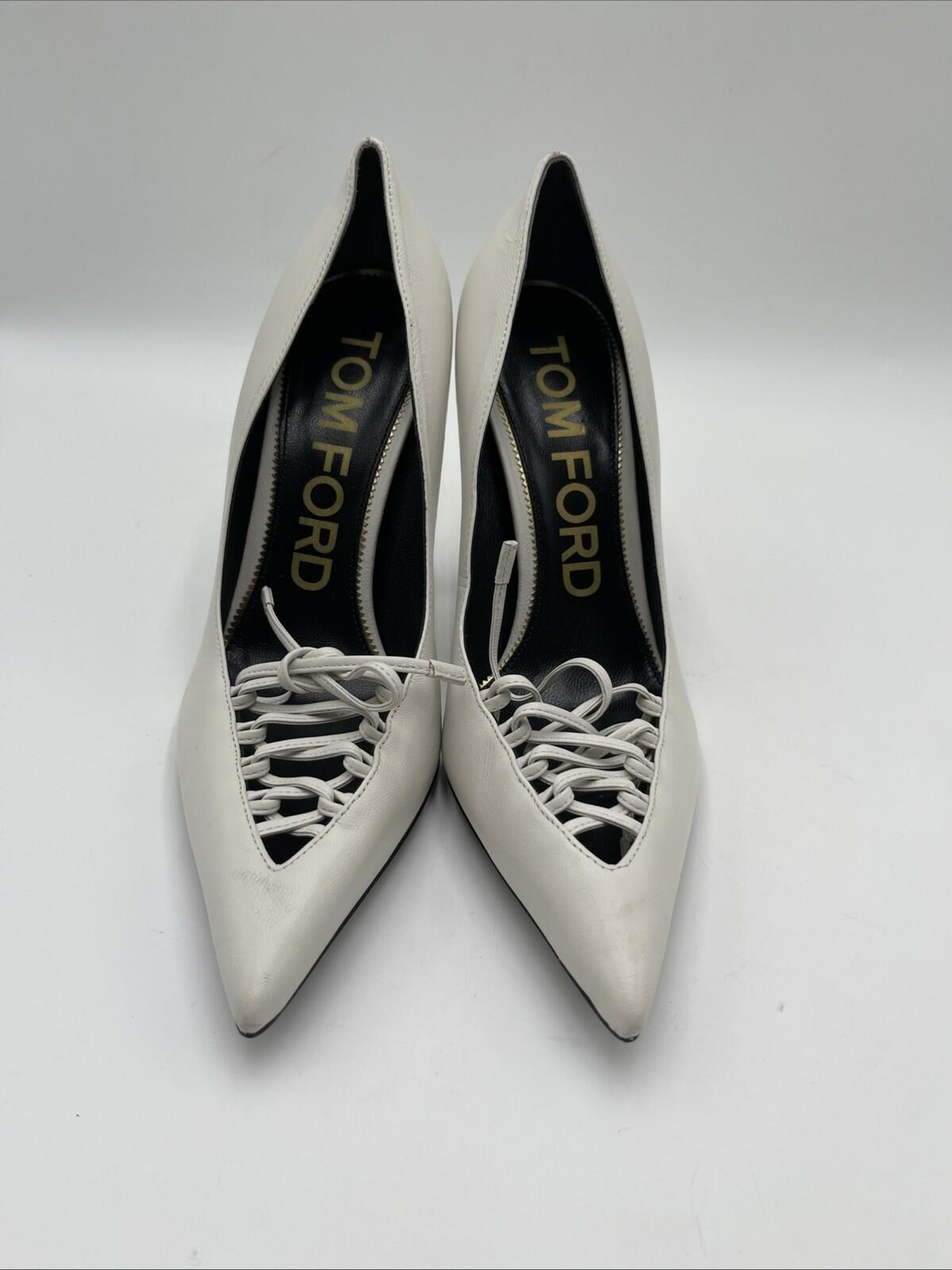 -Bottoms are lightly wornElevate your fashion game with these stunning Women's TOM FORD Corset 105 Leather Pumps in a chic white color. These pumps are perfect for any occasion, whether it's a day at the office or a night out on the town. The pointed toe and ultra-high stiletto heel add an elegant touch to any outfit, while the slip-on closure ensures a comfortable fit.