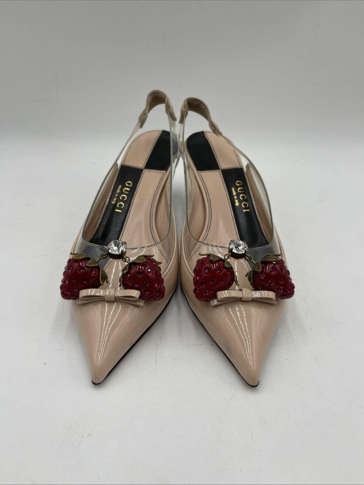 The Women's Gucci Eleanor Strawberry Plexi Heels in Beige, size 35, feature a pointed toe shape and a slip-on closure. These pumps have a low kitten heel style and are crafted from patent leather, providing a sleek and sophisticated look. Perfect for going out, these Gucci heels offer comfort with a solid design and are adorned with a unique strawberry plexi detail for a touch of charm and elegance.