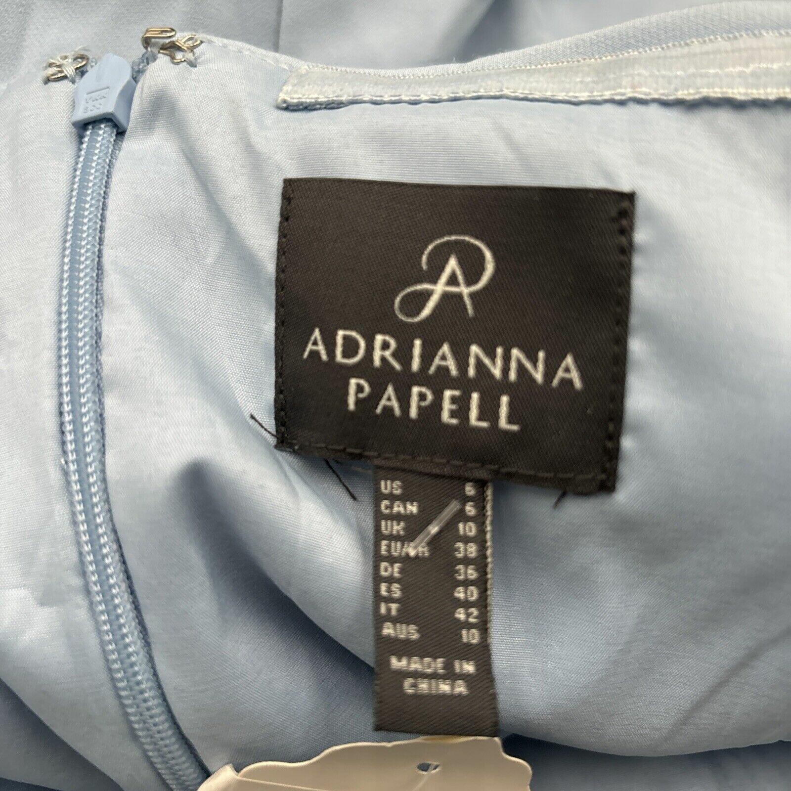This stunning Adrianna Papell ball gown, in elegant sky blue, is sure to turn heads at any formal occasion. The dress features an off-the-shoulder neckline, with sleeveless design, and a zip closure. The long dress is made from high-quality polyester material, with a solid pattern and delicate ruffle accents.The size 6 gown is perfect for women who want to make a statement at their next formal event. It is not vintage, but has a designer theme, and is suitable for both summer and spring seasons. This dress is truly a work of art and is sure to leave a lasting impression.